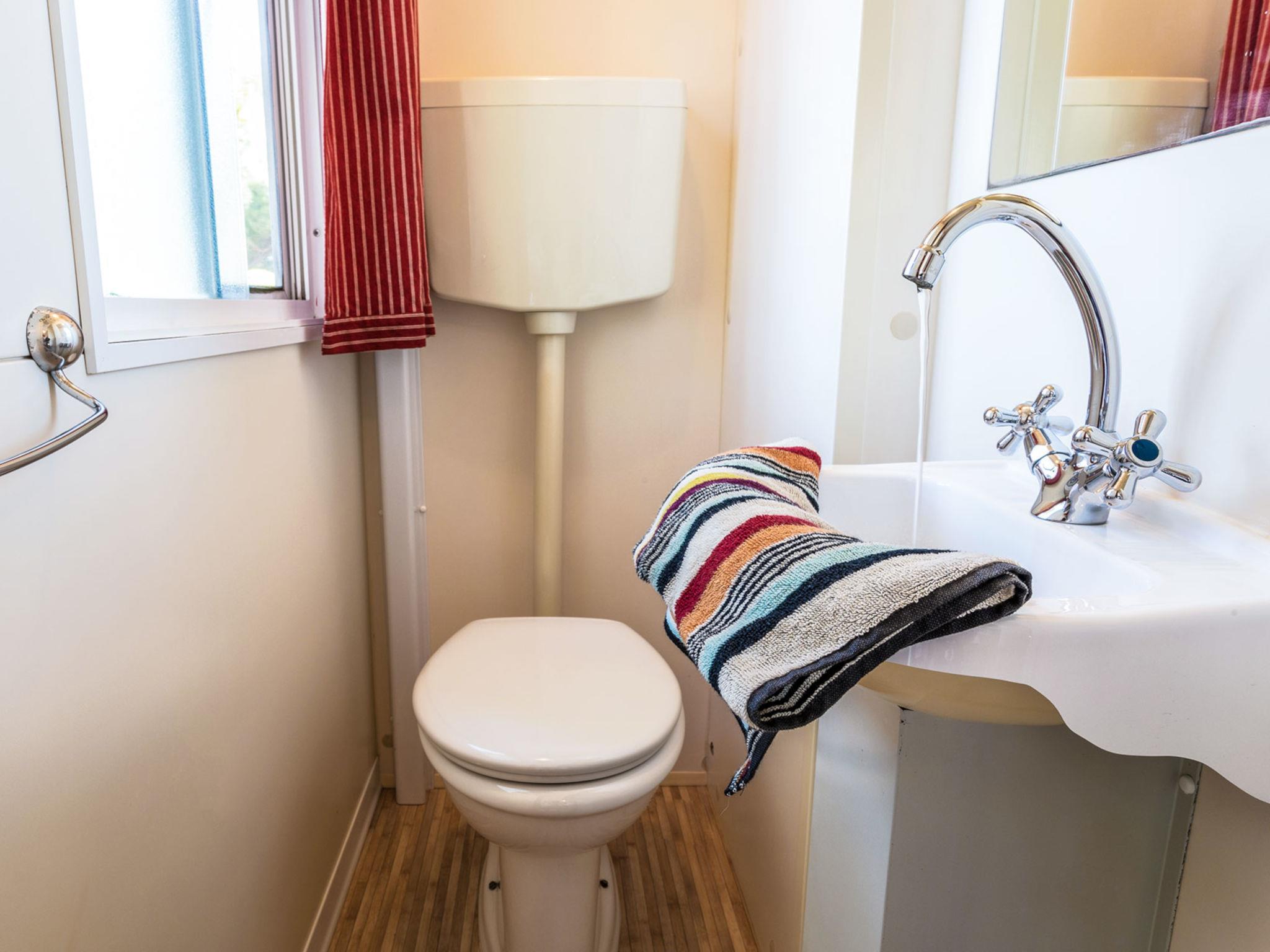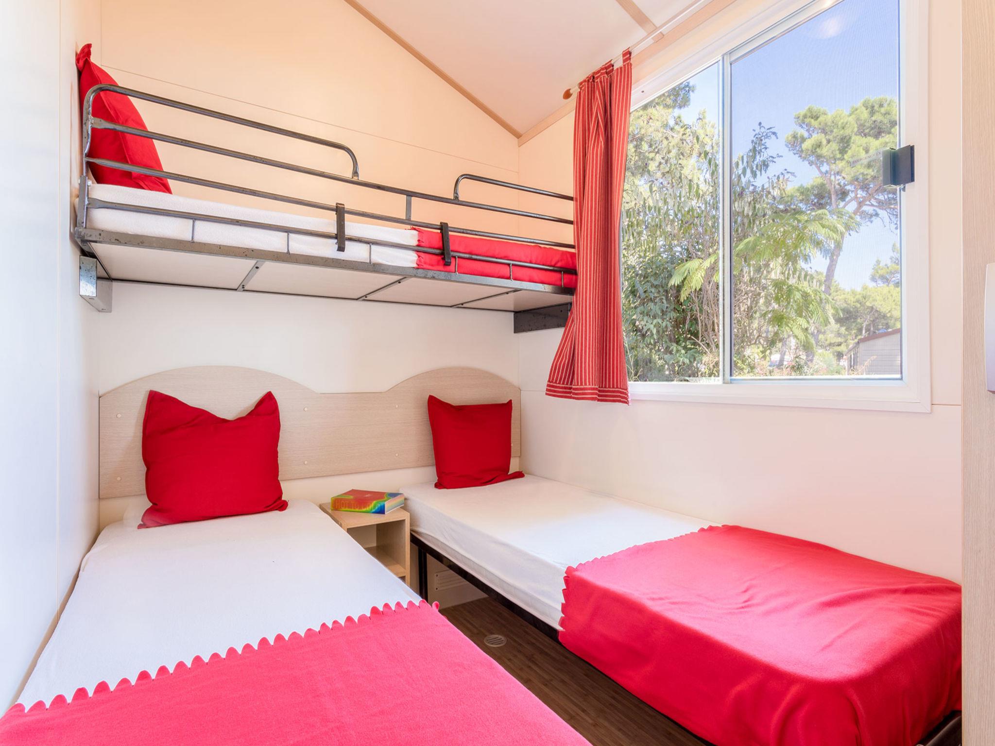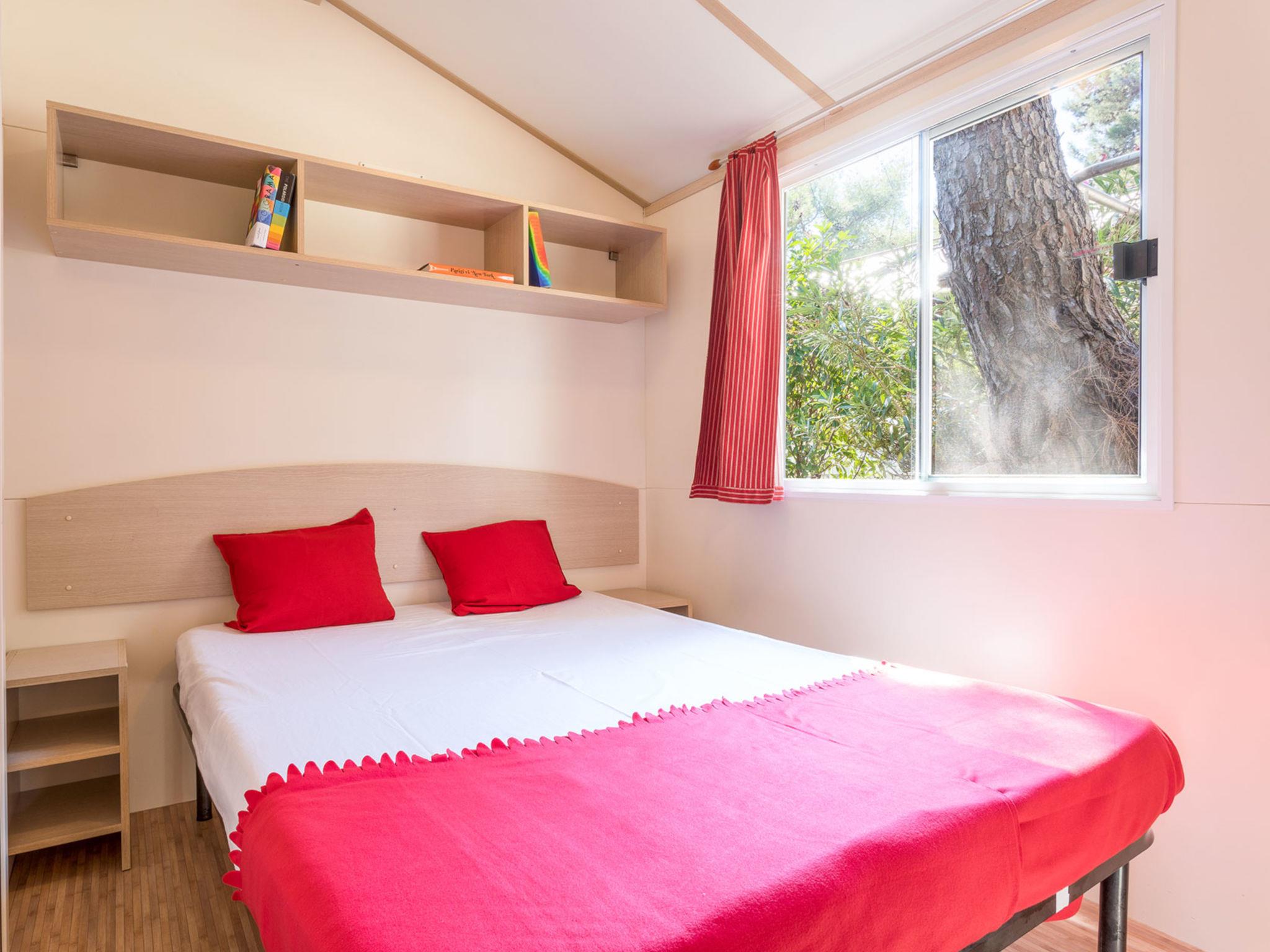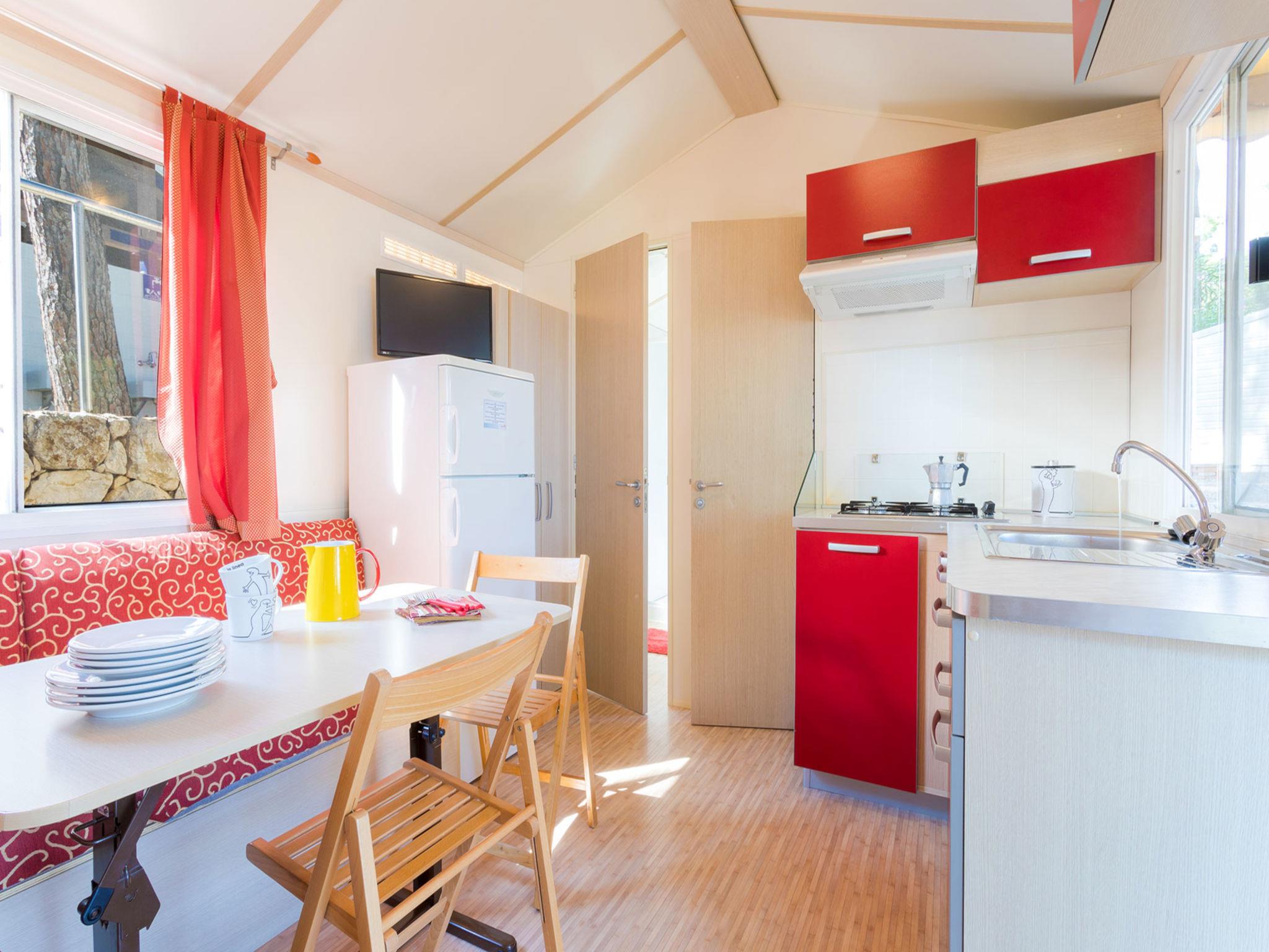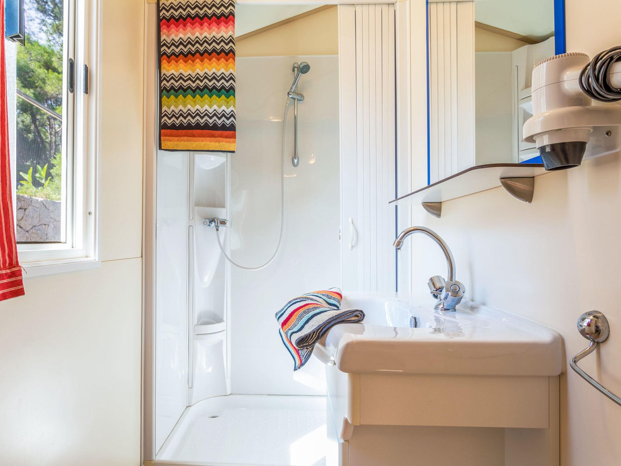"Baia Blu Romantic", 3-room mobile home 24 m2. Living/dining room with 1 sofabed (70 cm, length 160 cm), satellite TV and air conditioning. 1 room with 1 french bed (140 cm). 1 room with 2 beds (70 cm), 1 x 1 bunk beds (65 cm, length 175 cm). Open kitchen (4 gas rings). Shower, sep. WC. Air-conditioning (extra). Terrace 10 m2, roofed. Terrace furniture. Parking (1 car). Please note: non-smoking house. Maximum 2 small pets/ dogs allowed. Bed layout is flexible. There are more sleeping options available than the maximum number of people allowed which may, however, not be exceeded.