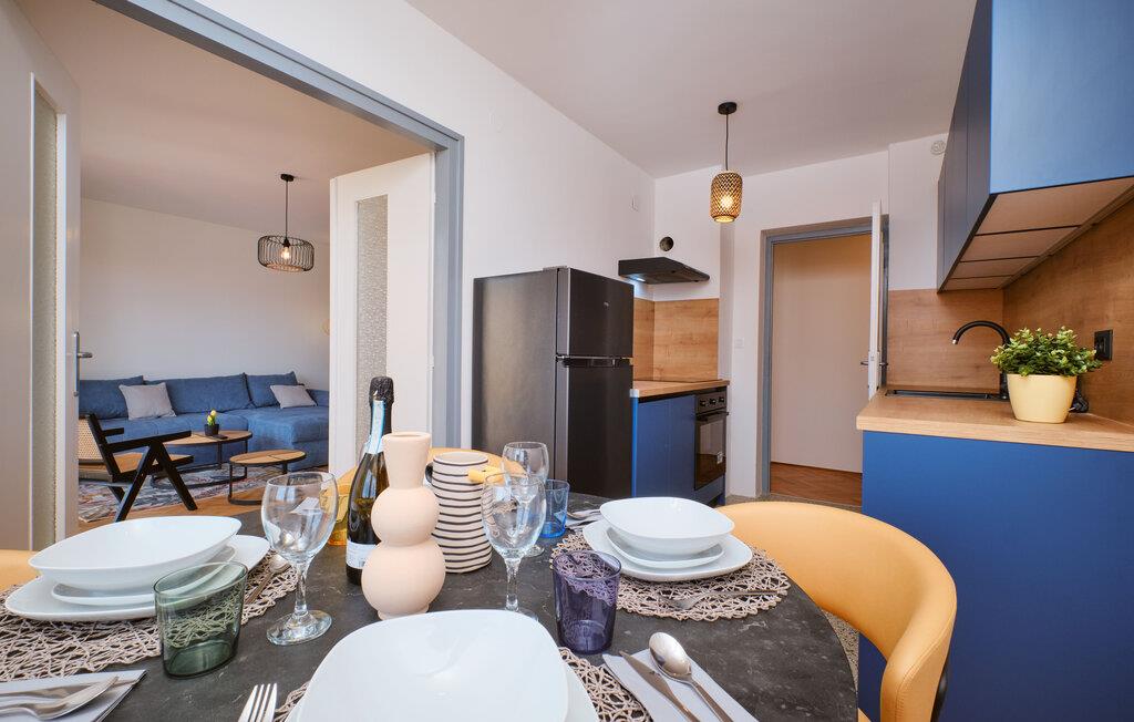 Denne moderne lejlighed kombinerer elegance og komfort på harmonisk vis. Gulv-til-loft-vinduer lader masser af varmt naturligt lys komme ind, mens I nyder en smuk udsigt over byen og havet. Middelhavsfarver, et varmt trælook og et komfortabelt sofaområde sikrer et afslappende ophold. Uanset om I lytter til god musik eller laver mad sammen, sætter I her tempoet for dagen.