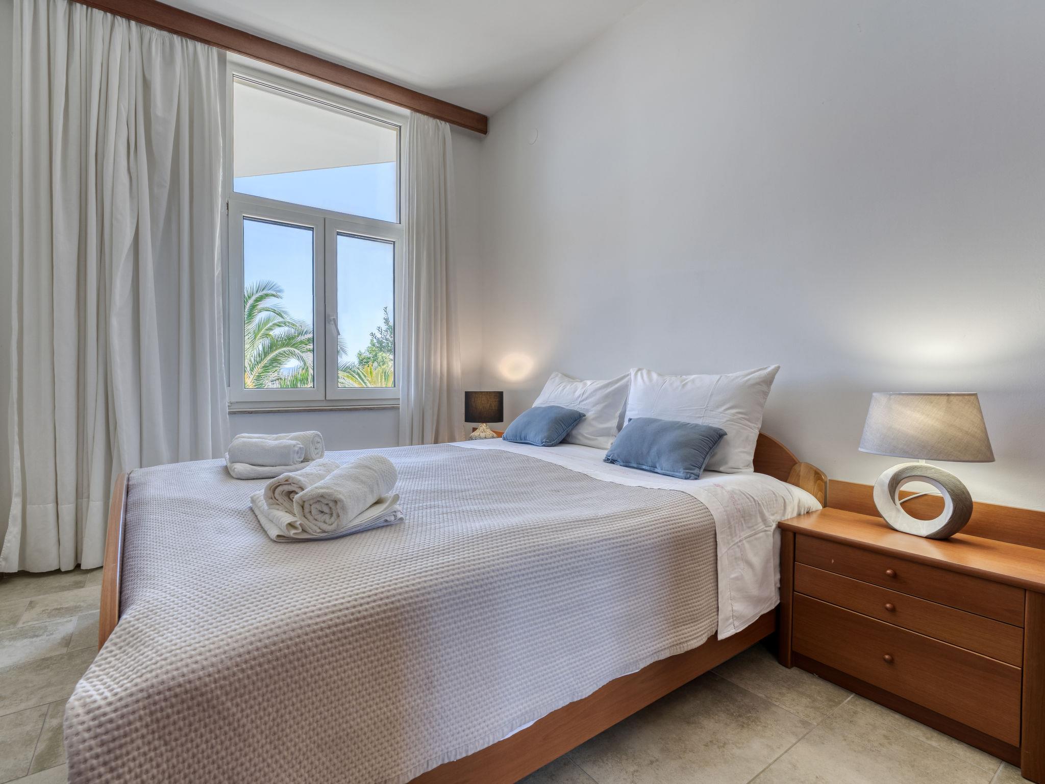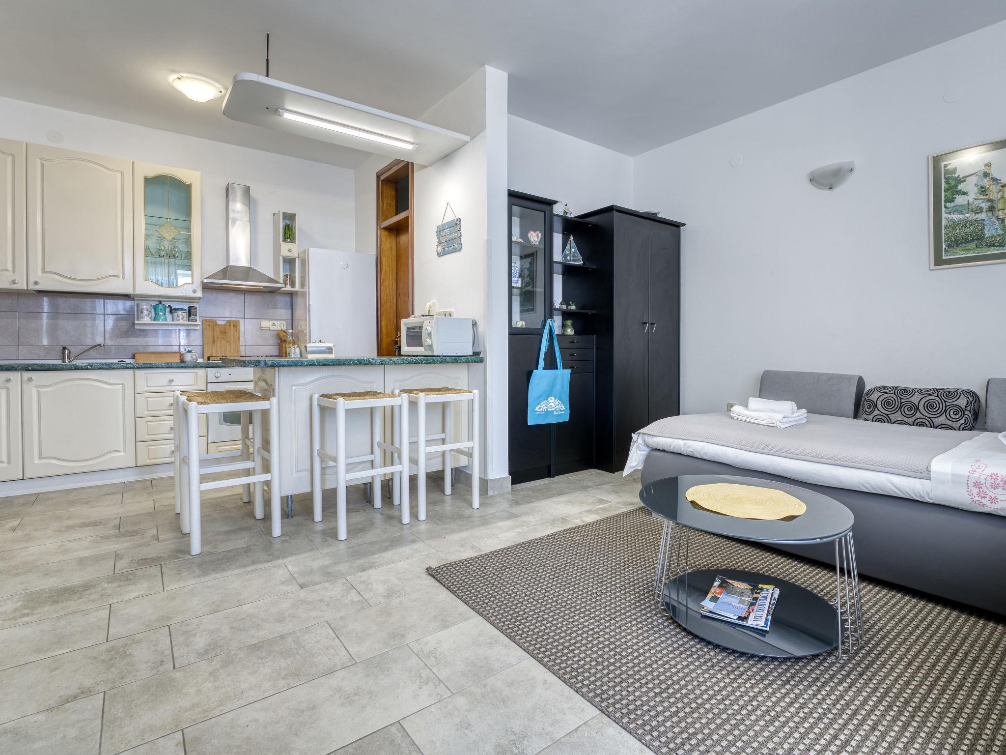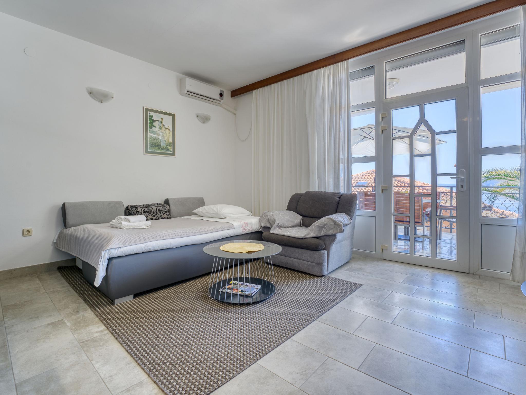 2-room apartment 60 m2, on the ground floor. Living/dining room with 1 double sofabed (155 cm, length 200 cm), cable TV (flat screen), air conditioning. Exit to the terrace. 1 room with 1 french bed (160 cm, length 200 cm). Open kitchen (1 hot plate, oven, 3 gas rings, toaster, kettle, microwave, freezer, electric coffee machine). Shower/WC. No heating option. Terrace 15 m2. Terrace furniture. Beautiful panoramic view of the sea. Facilities: washing machine. Internet (WiFi, free). Garage (1 car). Please note: non-smoking house. Private entrance.