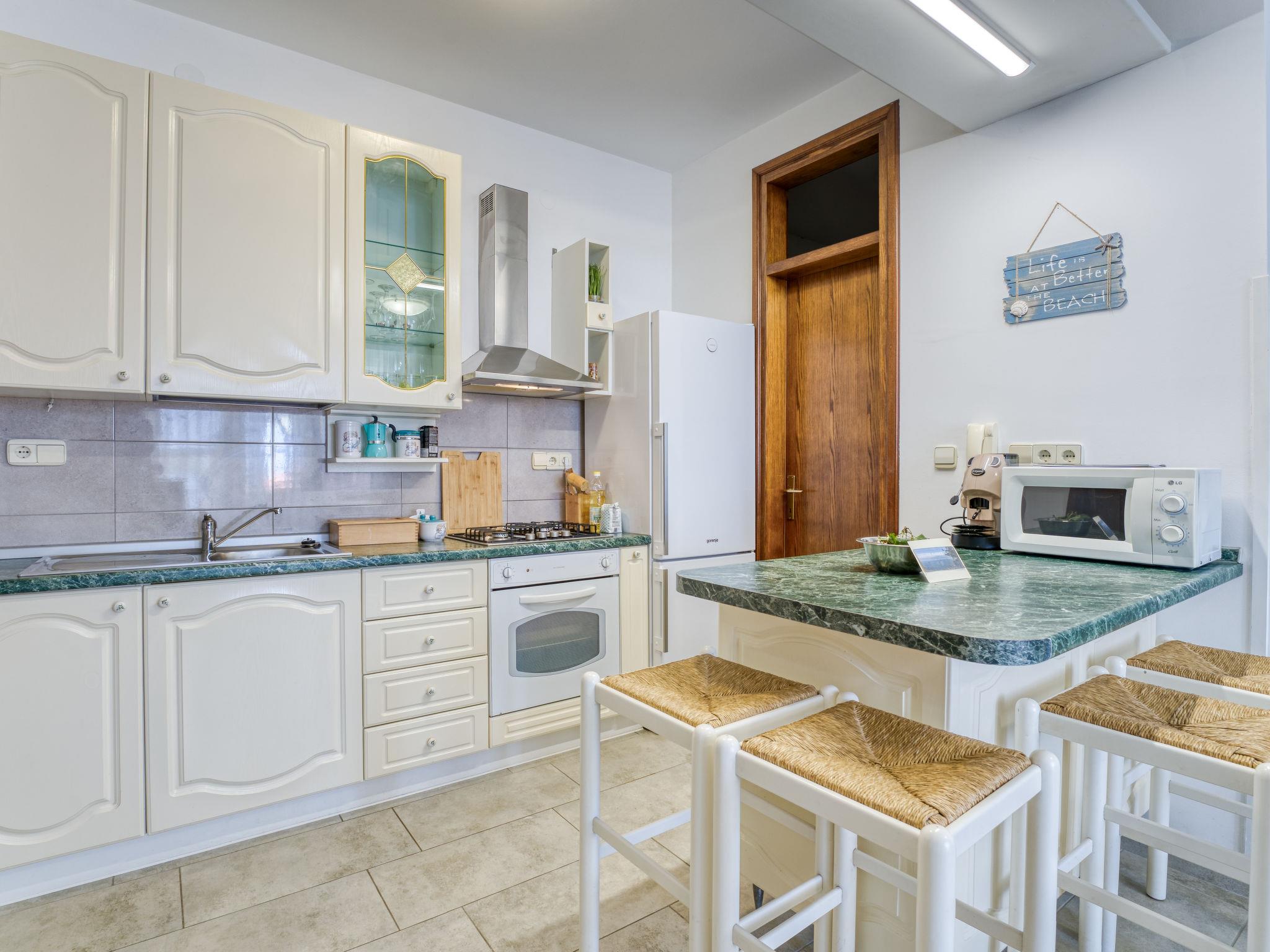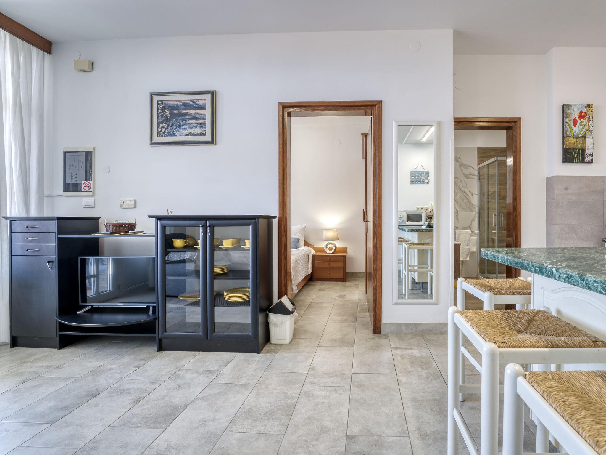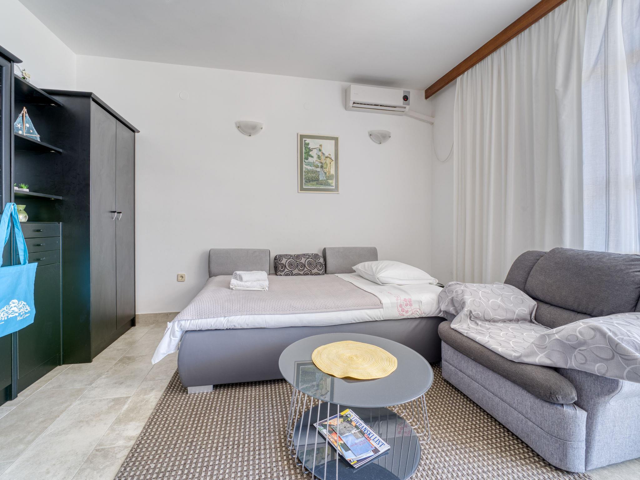 2-room apartment 60 m2, on the ground floor. Living/dining room with 1 double sofabed (155 cm, length 200 cm), cable TV (flat screen), air conditioning. Exit to the terrace. 1 room with 1 french bed (160 cm, length 200 cm). Open kitchen (1 hot plate, oven, 3 gas rings, toaster, kettle, microwave, freezer, electric coffee machine). Shower/WC. No heating option. Terrace 15 m2. Terrace furniture. Beautiful panoramic view of the sea. Facilities: washing machine. Internet (WiFi, free). Garage (1 car). Please note: non-smoking house. Private entrance.