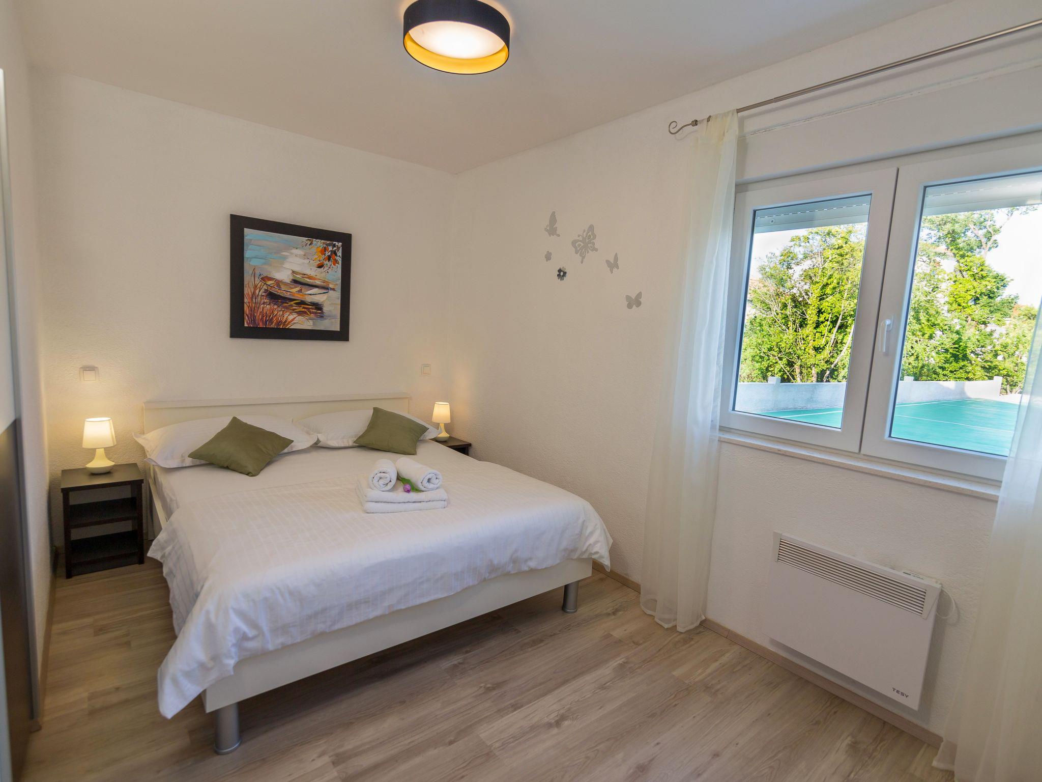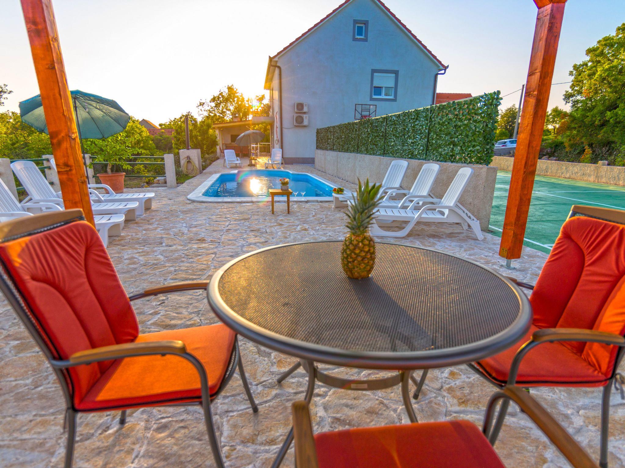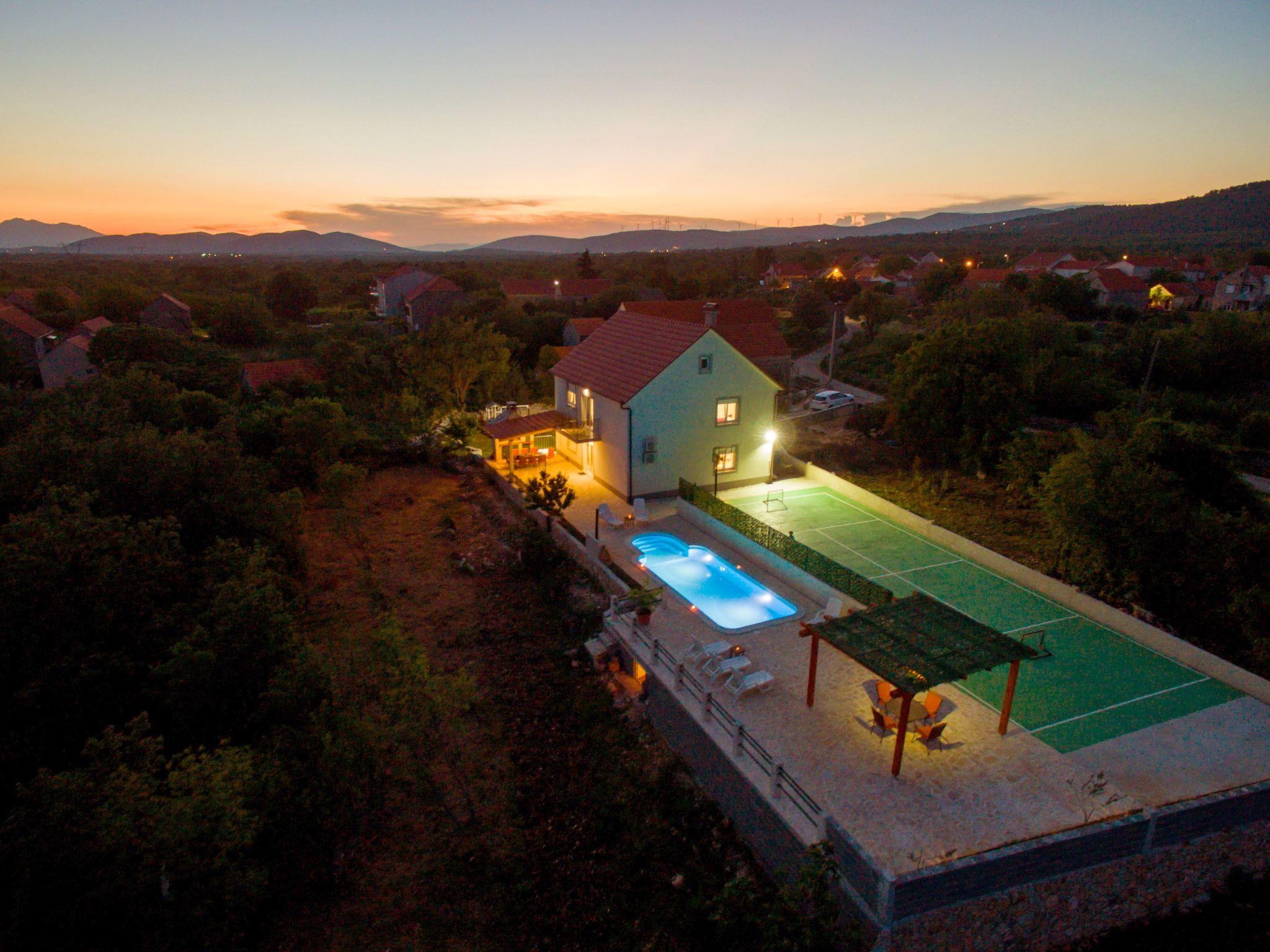 The tennis court is multifunctional and can also be used for mini football or basketball. The green areas around the house are mostly part of the property, so it’s not a problem if tennis or other balls end up there. The pool is private, spacious enough for a larger number of users, with heated water and an outdoor shower. The house is oriented north-south, with bedrooms on the north side and living areas on the south side.