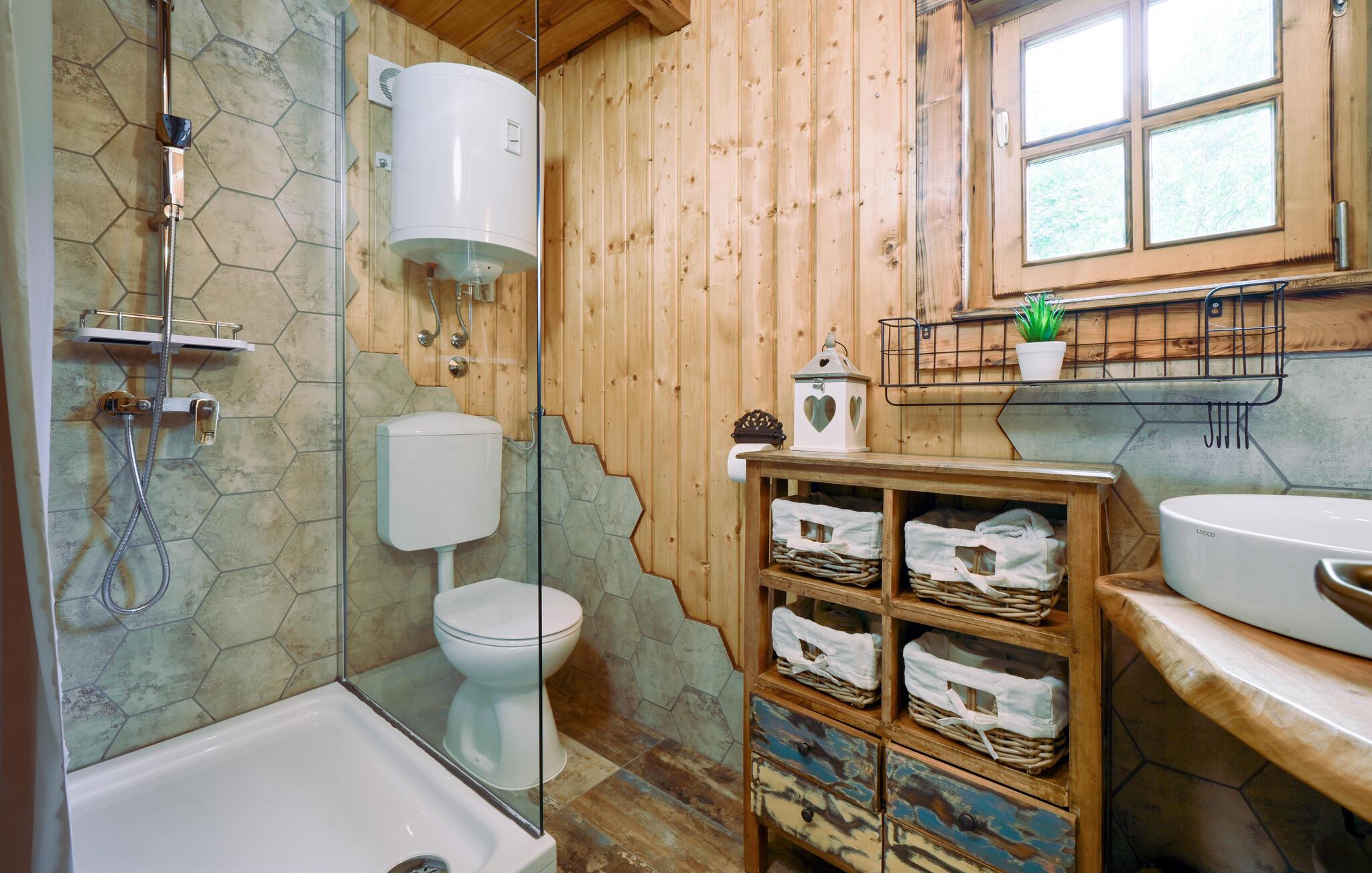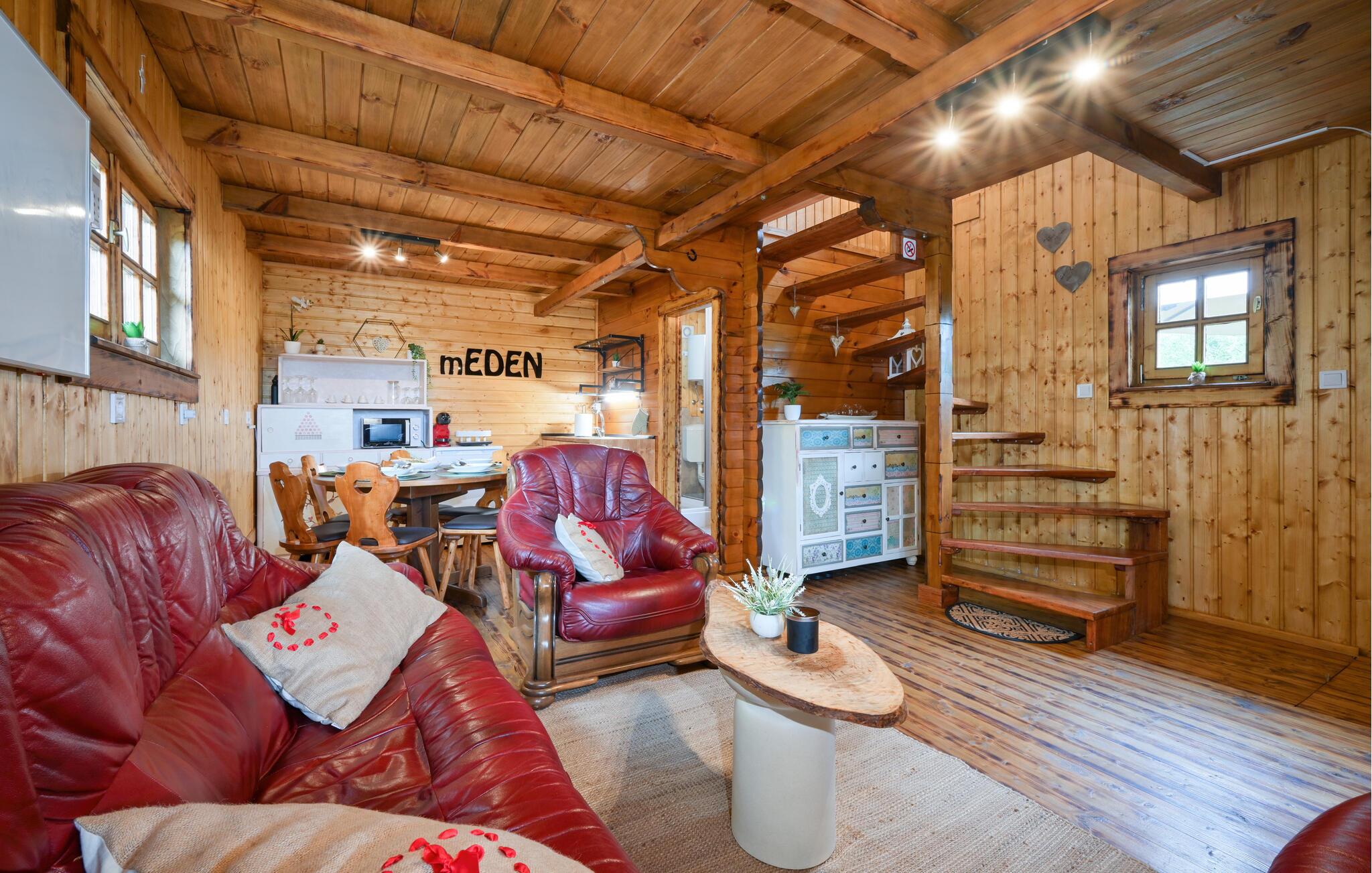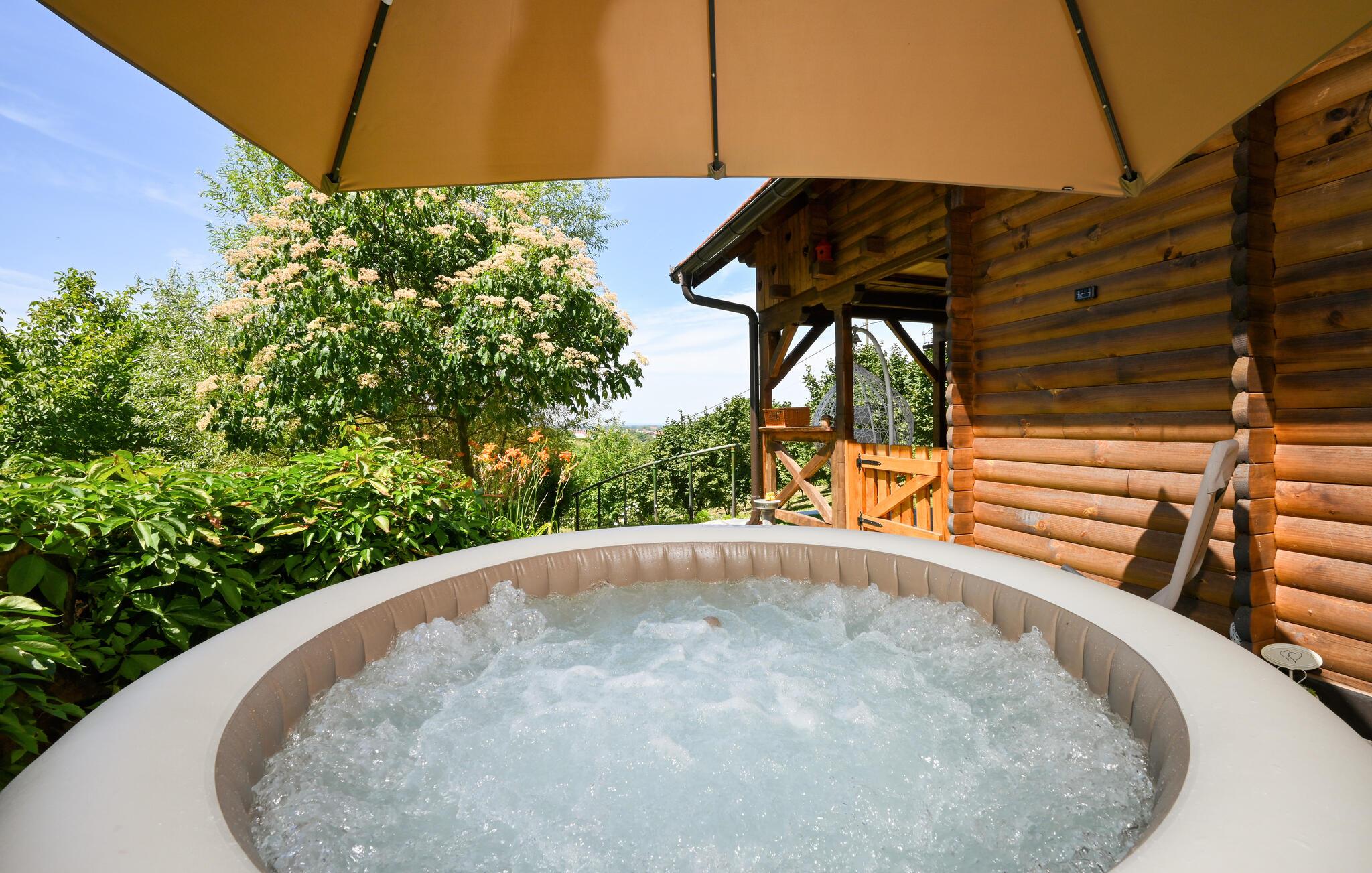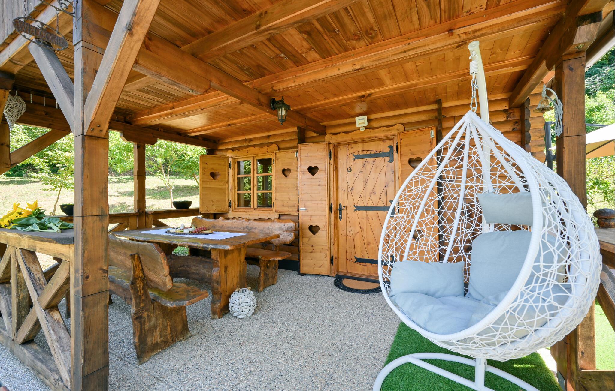 Nyd en afslappende ferie i dette rustikke feriehus med spabad. Slap af fra hverdagen og genoplad batterierne i dette komfortabelt møblerede hus. De naturfarvede træpaneler, komfortable lædersofaer og en pejs skaber en rolig atmosfære. Tilbered jeres måltider og nyd dem ved det store spisebord med en fin flaske vin. Slap af med en bog eller spil et spil skak. Start dagen med en dukkert i spabadet, inden I sætter jer til rette i hængestolen. Forfrisk jer med en kølig drink og nyd roen i den grønne have, mens jeres børn spiller badminton eller volleyball. Om aftenen griller I sammen og reflekterer over dagens eventyr. Oplev de grønne bakker omkring Ludbreg på lange gåture eller cykelture gennem naturen. Besøg den charmerende by Ludbreg, kendt som Kroatiens geografiske centrum, og slentr gennem dens historiske gader. Tag på udflugter til nærliggende vingårde og prøv regionale specialiteter direkte fra producenten. Nyd roen i omgivelserne og lad jer fortrylle af den landlige charme i det nordlige Kroatien.
