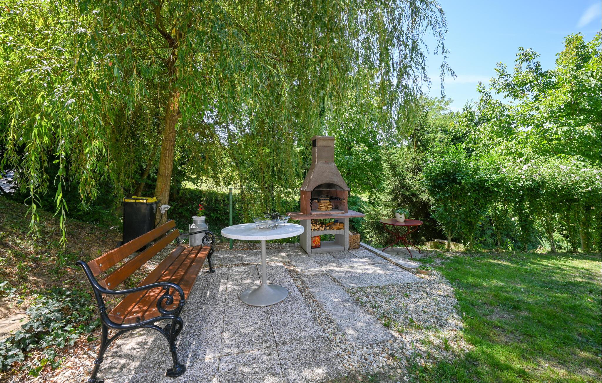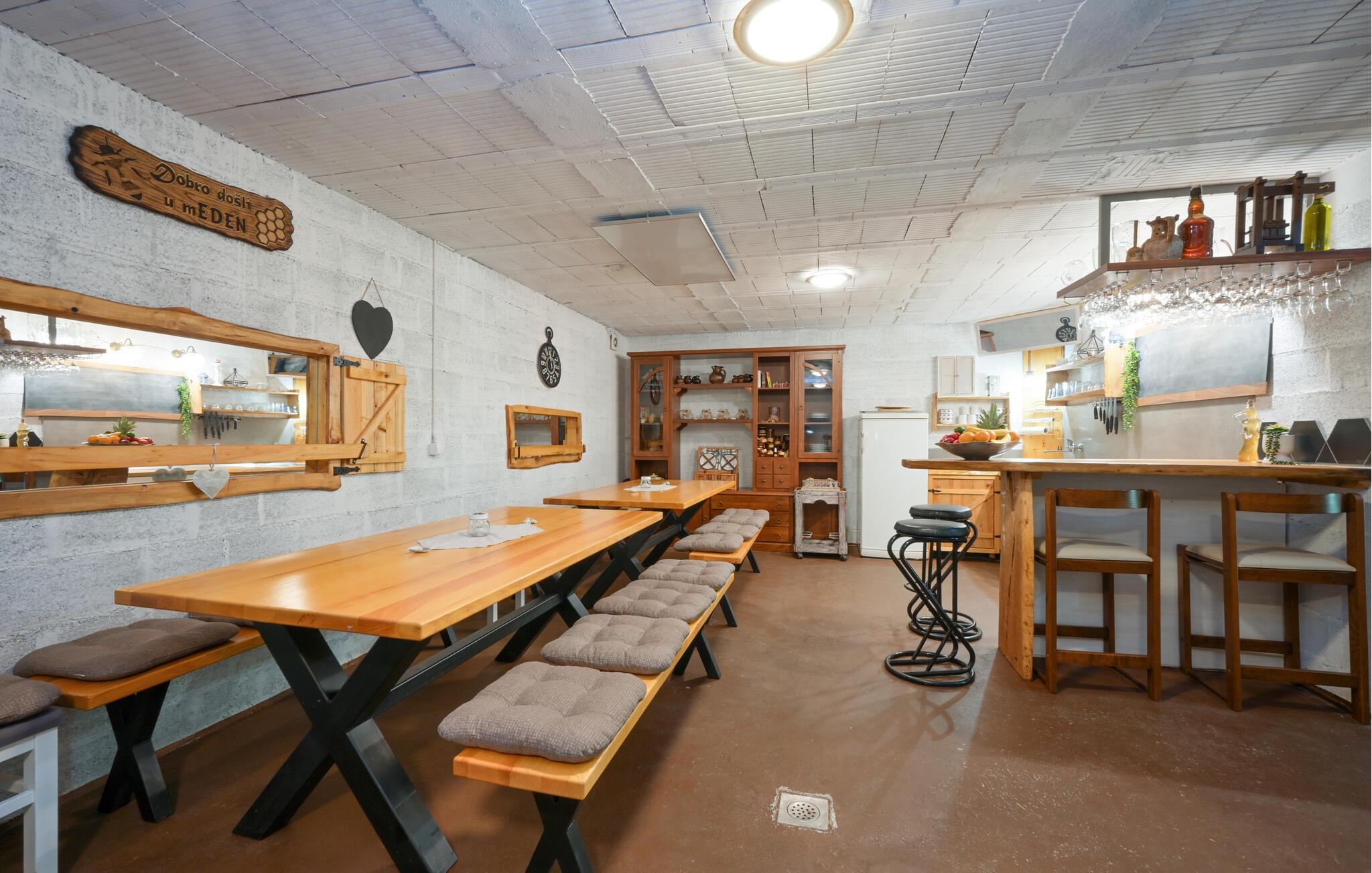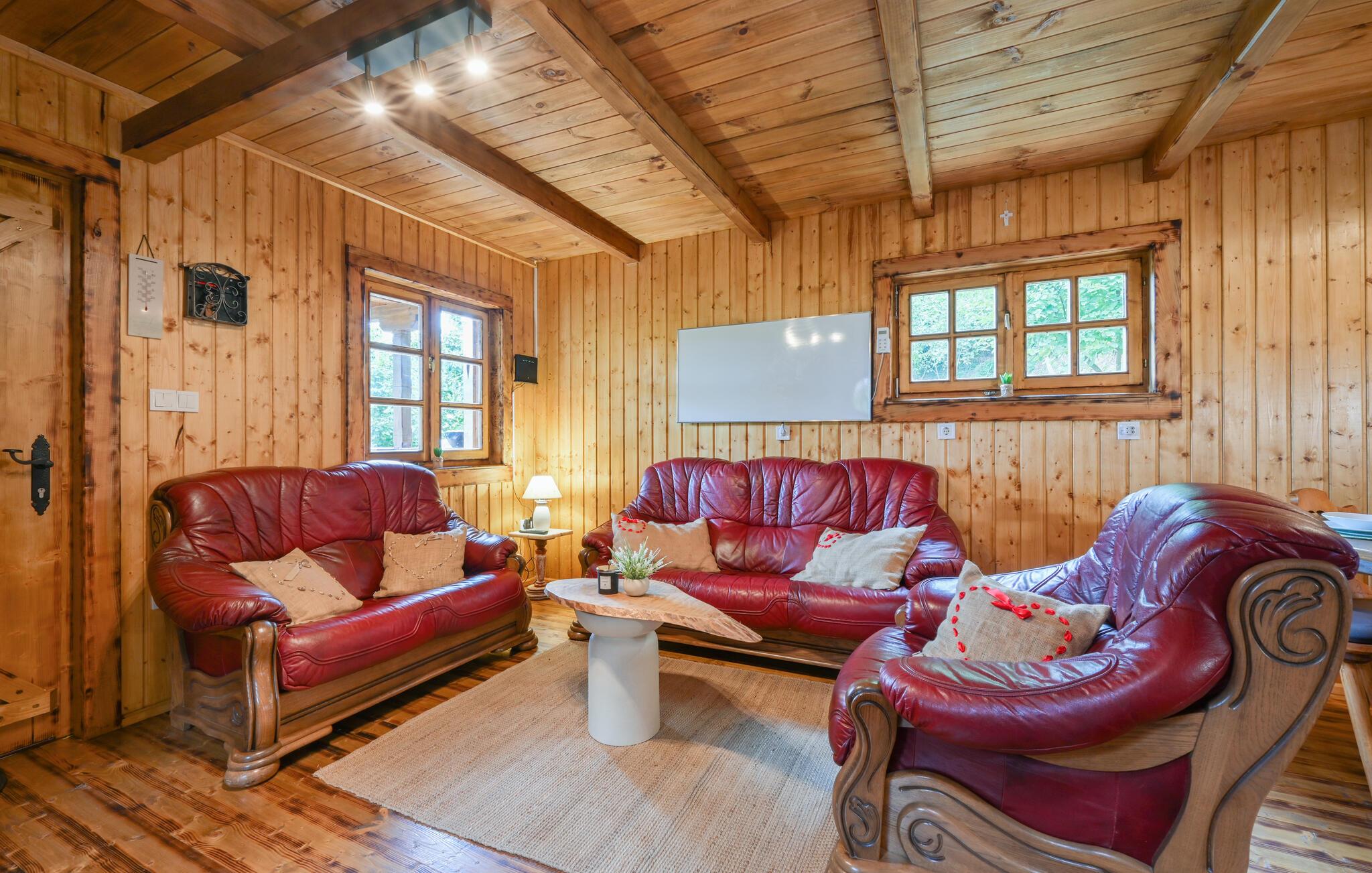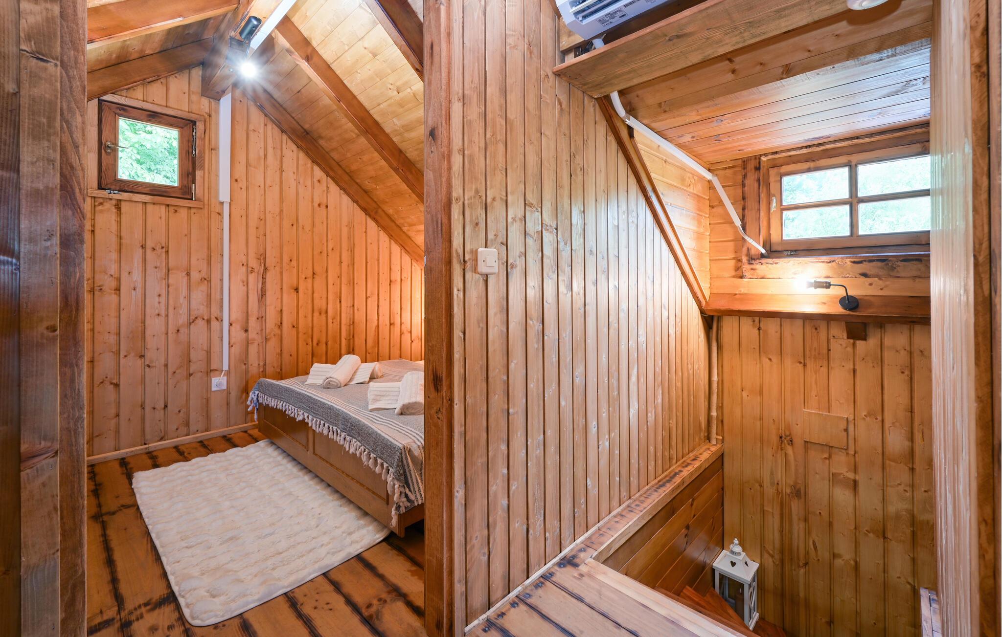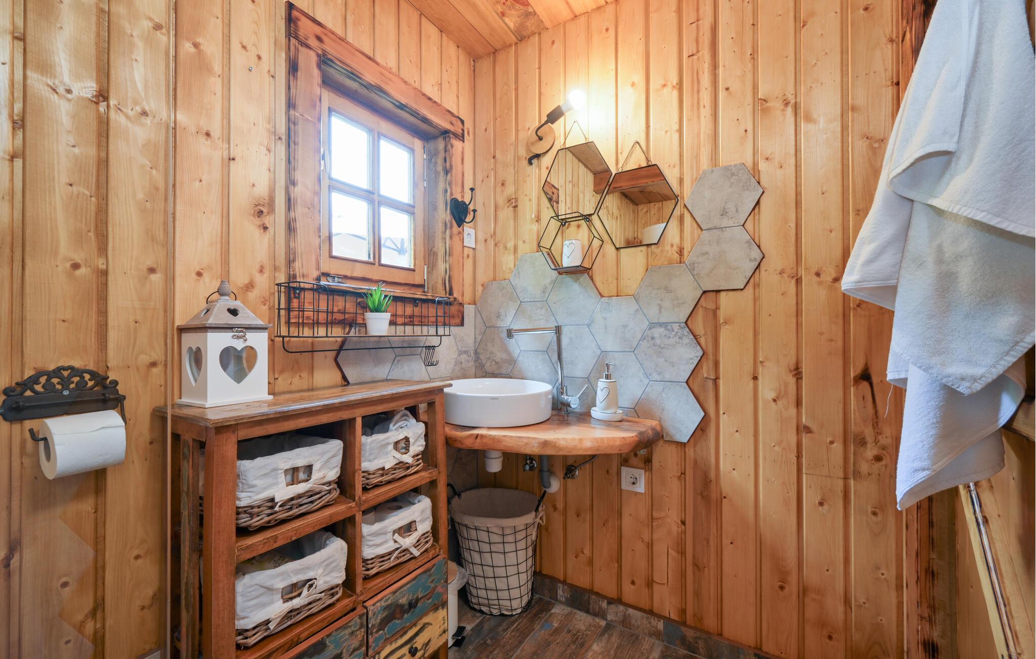Nyd en afslappende ferie i dette rustikke feriehus med spabad. Slap af fra hverdagen og genoplad batterierne i dette komfortabelt møblerede hus. De naturfarvede træpaneler, komfortable lædersofaer og en pejs skaber en rolig atmosfære. Tilbered jeres måltider og nyd dem ved det store spisebord med en fin flaske vin. Slap af med en bog eller spil et spil skak. Start dagen med en dukkert i spabadet, inden I sætter jer til rette i hængestolen. Forfrisk jer med en kølig drink og nyd roen i den grønne have, mens jeres børn spiller badminton eller volleyball. Om aftenen griller I sammen og reflekterer over dagens eventyr. Oplev de grønne bakker omkring Ludbreg på lange gåture eller cykelture gennem naturen. Besøg den charmerende by Ludbreg, kendt som Kroatiens geografiske centrum, og slentr gennem dens historiske gader. Tag på udflugter til nærliggende vingårde og prøv regionale specialiteter direkte fra producenten. Nyd roen i omgivelserne og lad jer fortrylle af den landlige charme i det nordlige Kroatien.