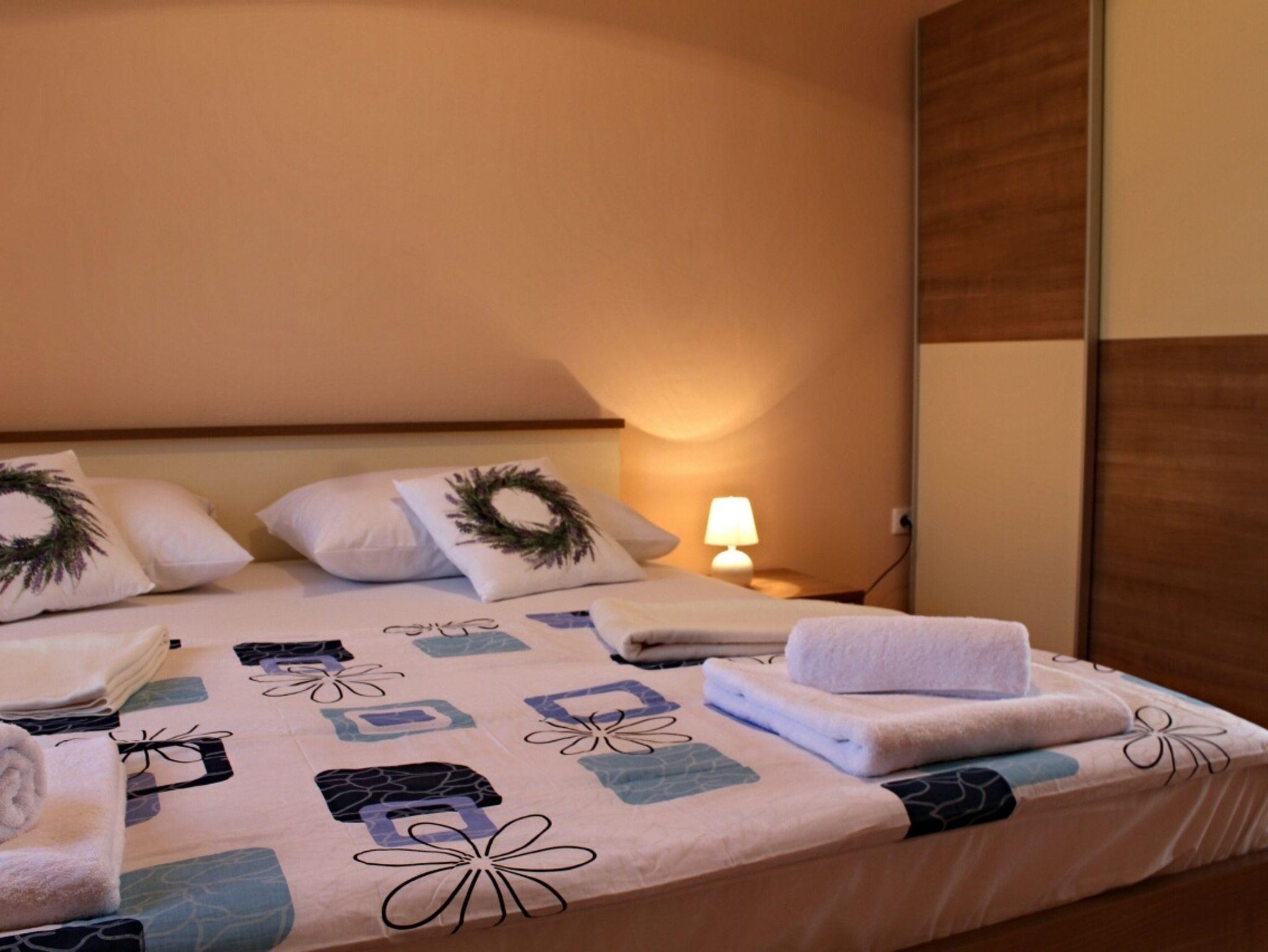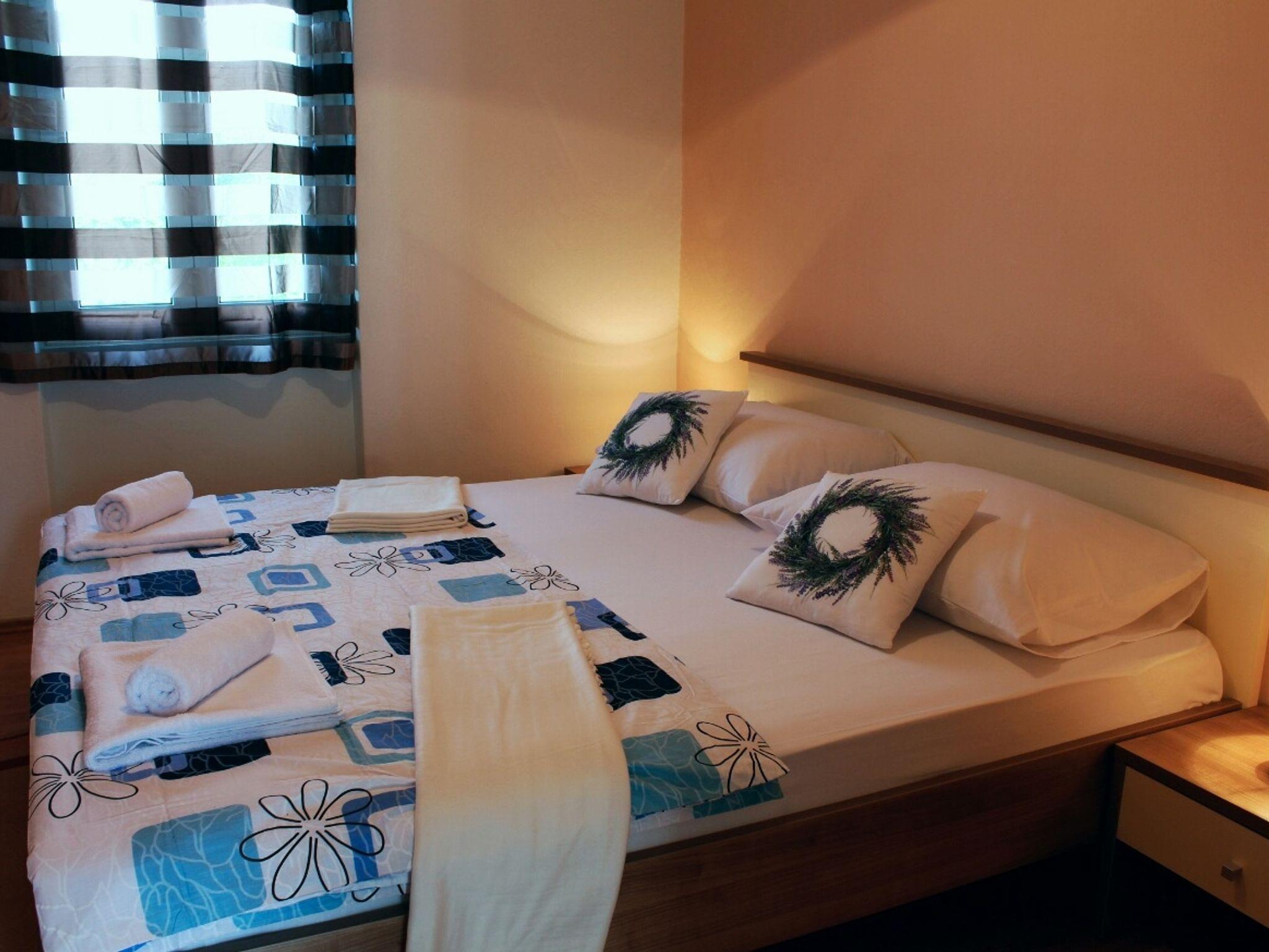 Ferienwohnung bietet Platz für 6 Gäste. Die Betten sind in Schlafzimmern, die es 2 gibt, und in Wohnzimmer, innerhalb einer Gesamtfläche von 70m2, angeordnet. Die Gäste haben eine eigene Terrasse zur Verfügung, auf der sie in warmen Sommernächten genießen können. Es ist erlaubt, Speisen auf dem Gemeinschafts-Grill vorzubereiten. IM PREIS INBEGRIFFEN: Kurtaxe, Endreinigung, Klimatisierung, Parkplatz, Garage, Internet, Bügeleisen, Bügelbrett, Föhn, tragbarer Grill. VERBINDLICHE ZUSÄTZLICHE KOSTEN: Aufzahlung für Kurzaufenthalte (prozentualer Zuschlag pro Nächtigungsanzahl: 30% - 1, 20% - 2, 10% - 3). Die Verfügbarkeit zusätzlicher Dienstleistungen in Ihrem reservierten Termin und die Preise derselben (falls nicht aufgeführt) müssen im Voraus überprüft werden. Zusätzliche Dienstleistungen die in der Zahlungsaufforderung nicht aufgeführt sind werden direkt beim Vermieter bezahlt, angenommen der Gast nutzt auch diese.