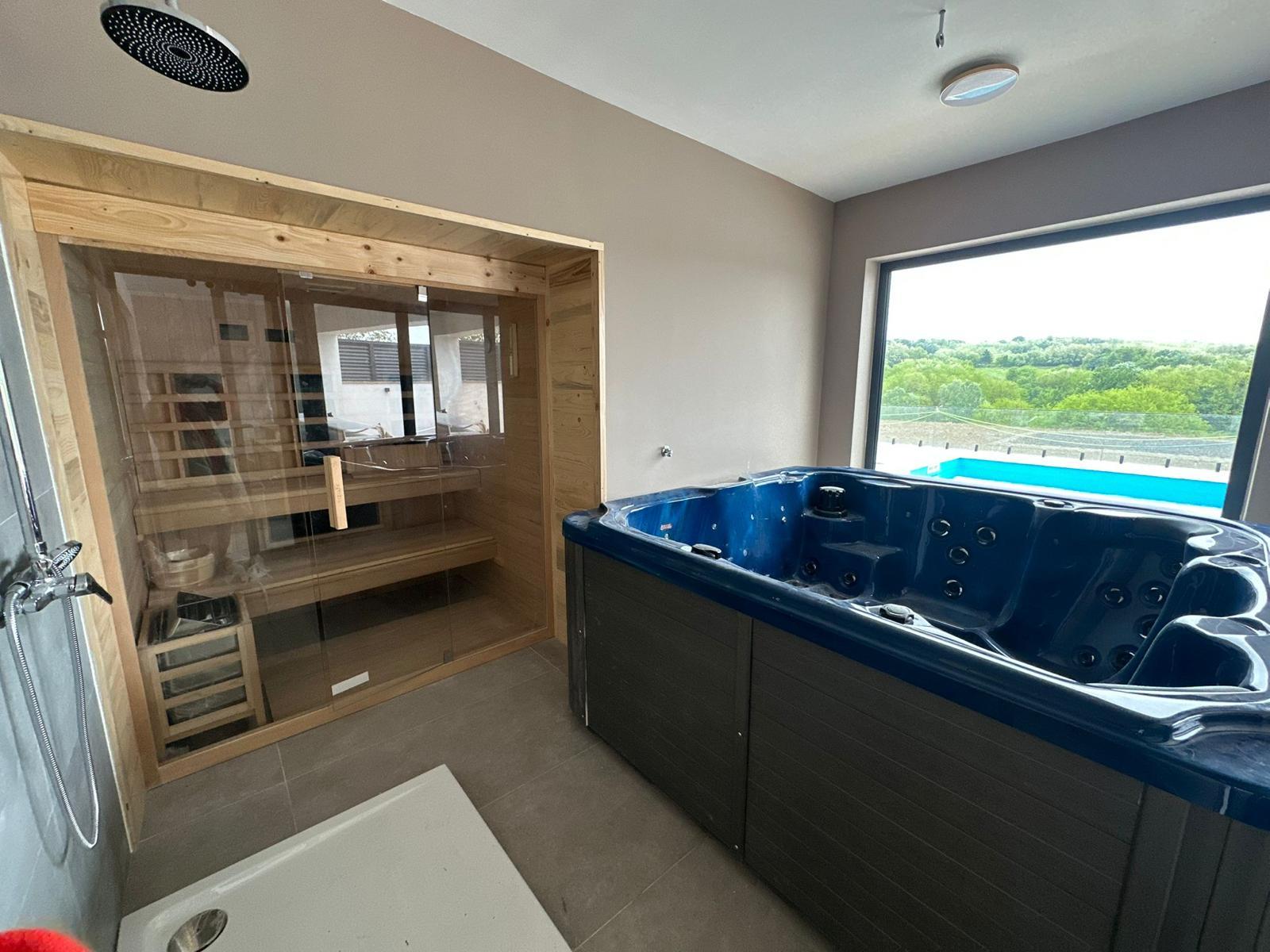 Guests can enjoy a private outdoor pool for summer relaxation, as well as a large covered terrace with a summer kitchen, ideal for cooking and socializing. A closed spa zone with a sauna and jacuzzi ensures complete relaxation throughout the year. The outdoor area provides beautiful views of the rolling hills, while private parking is available for up to four cars.