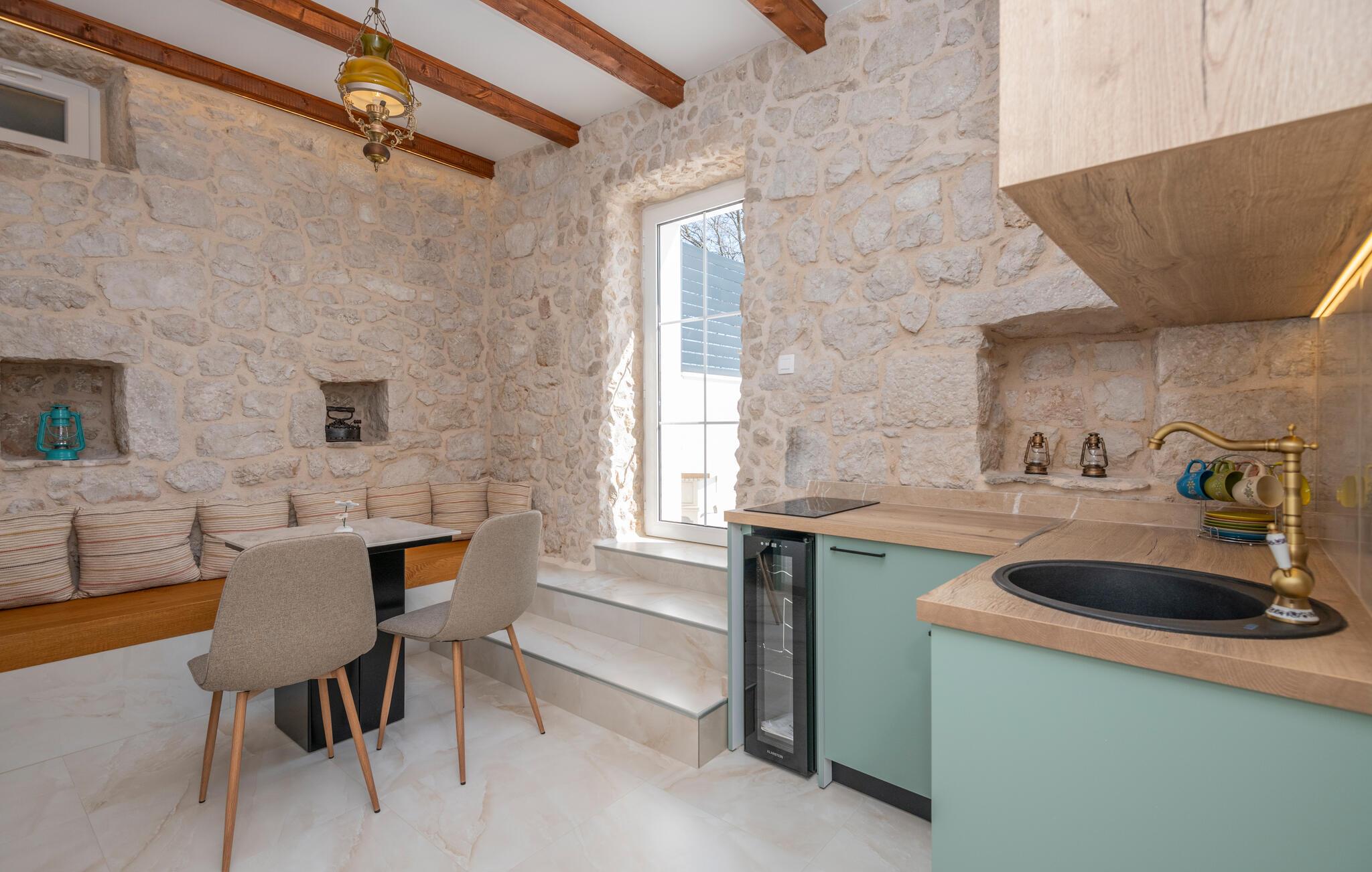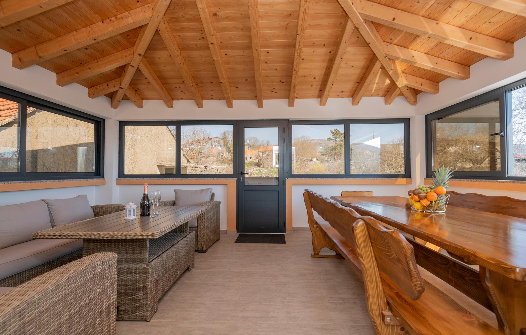 Huset ligger midt i den smukke natur og danner de perfekte rammer om et afslappende ophold i de dejligste omgivelser. Indretningen fremtræder både charmerende og moderne med smukke trælofter, synlige murværk og den lille hvælving i stueetagen, der minder om et museum, og som vidner om husets lange historie. Find jer godt til rette i en af de mange komfortable siddepladser og nyd den fantastiske udsigt, mens I lægger planer for de kommende dage.