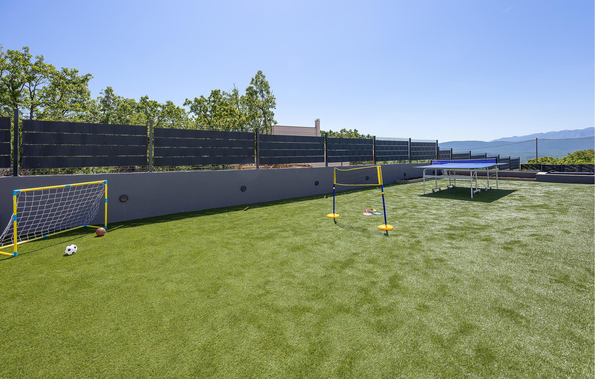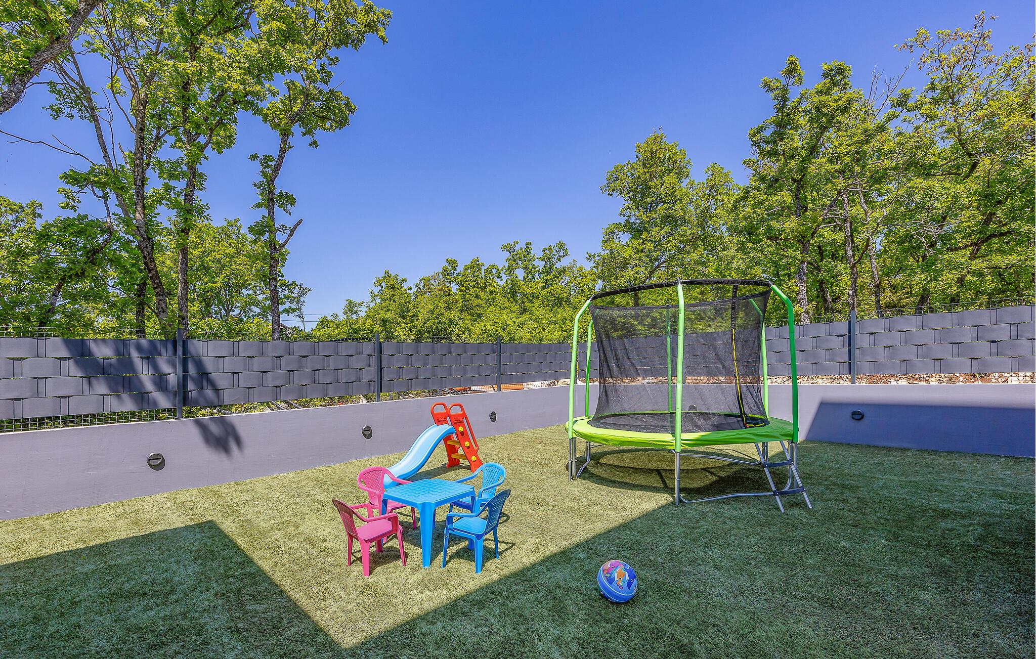 Udeområdet er mindst lige så dejligt. Her finder I den flotte pool og en lang række børnevenlige faciliteter som trampolin og en rutsjebane, hvor de kære små kan brænde energi af i løbet af dagen. Lad en herlig feriedag gå på hæld i jeres helt egen taverna og grill jeres livretter på grillen, mens I lægger planer for de kommende dage.