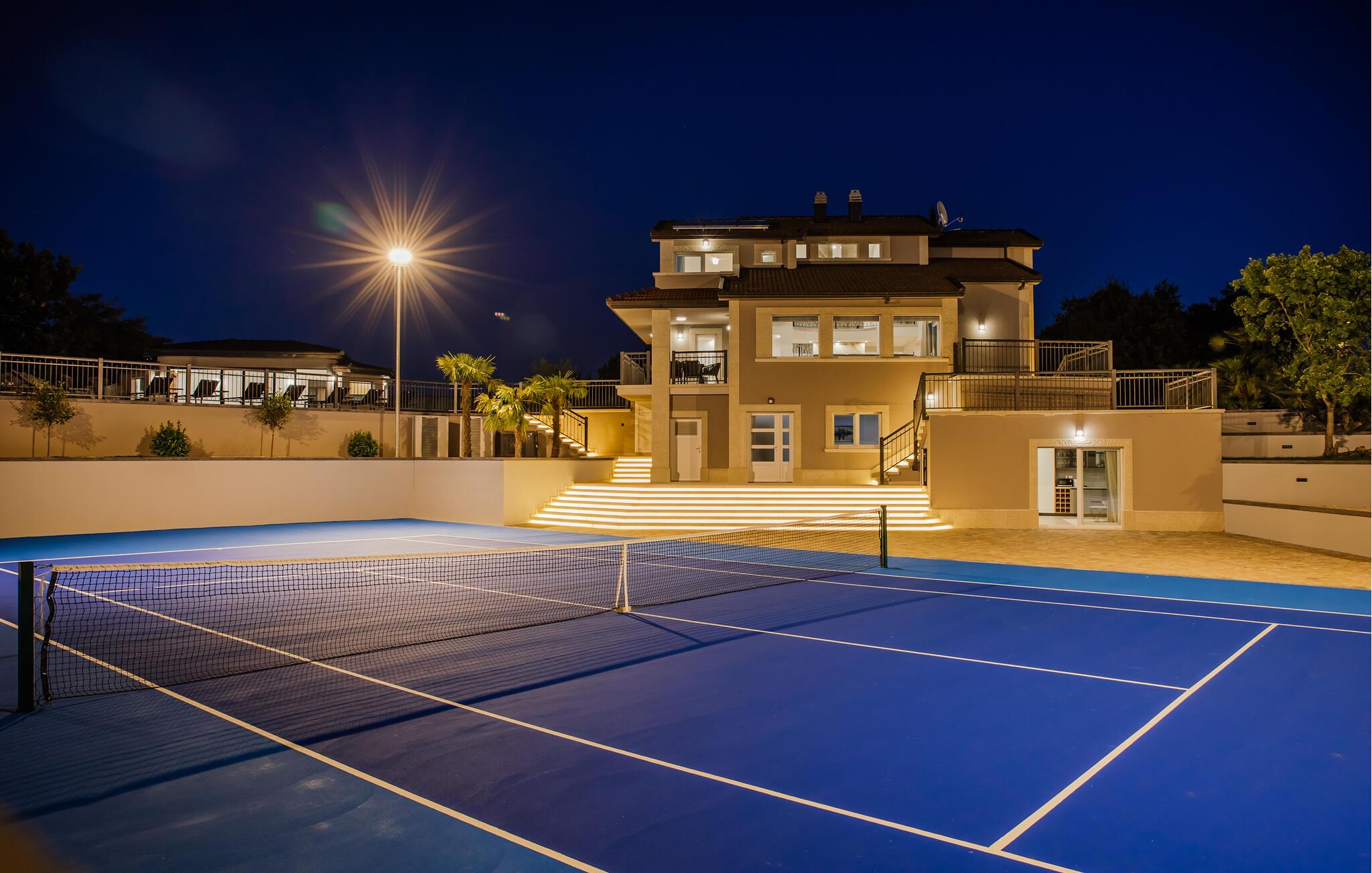 Til huset hører flere forskellige terrasser, så det er egentlig bare at vælge jeres yndlings og nyde solen i fulde drag. Dyp jer i poolen, når varmen er ved at få jer og glæd jer til mange drabelige dueller på tennisbanen, der er af højeste kvalitet. Der er også masser af legeredskaber, som børnene kan brænde energi af med.