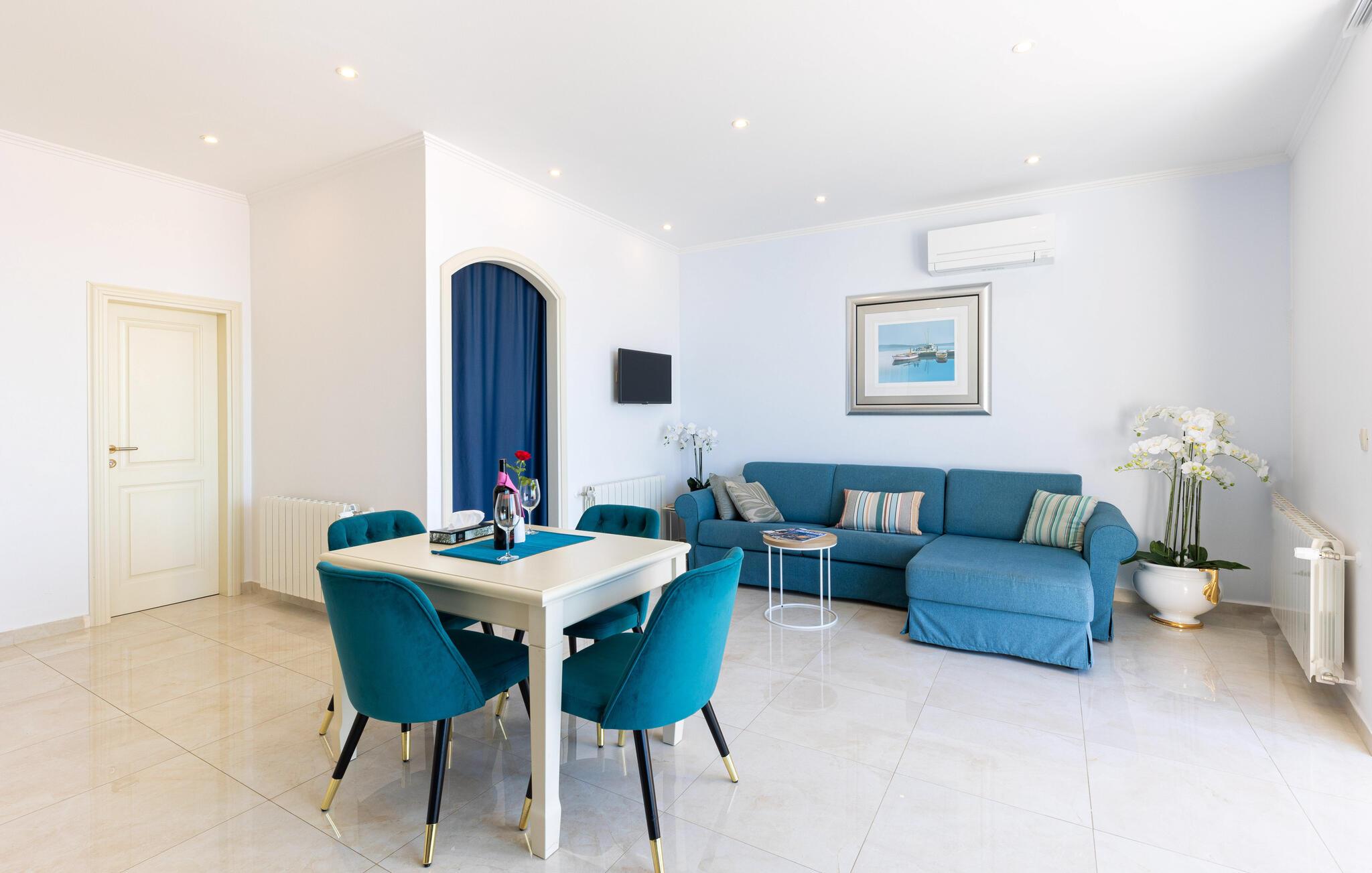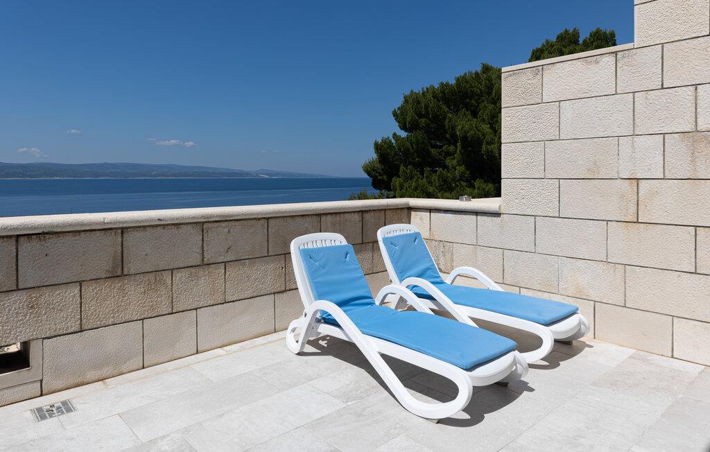 Træd ud på jeres solrige terrasse og lad jer fortrylle af den betagende havudsigt. Alt efter jeres ønsker kan I bruge forteltet til at nyde jeres måltider i solen eller i skyggen. Slap af på liggestolen, fordyb jer i en god bog og fejr middelhavsnætterne med vin og levende lys.