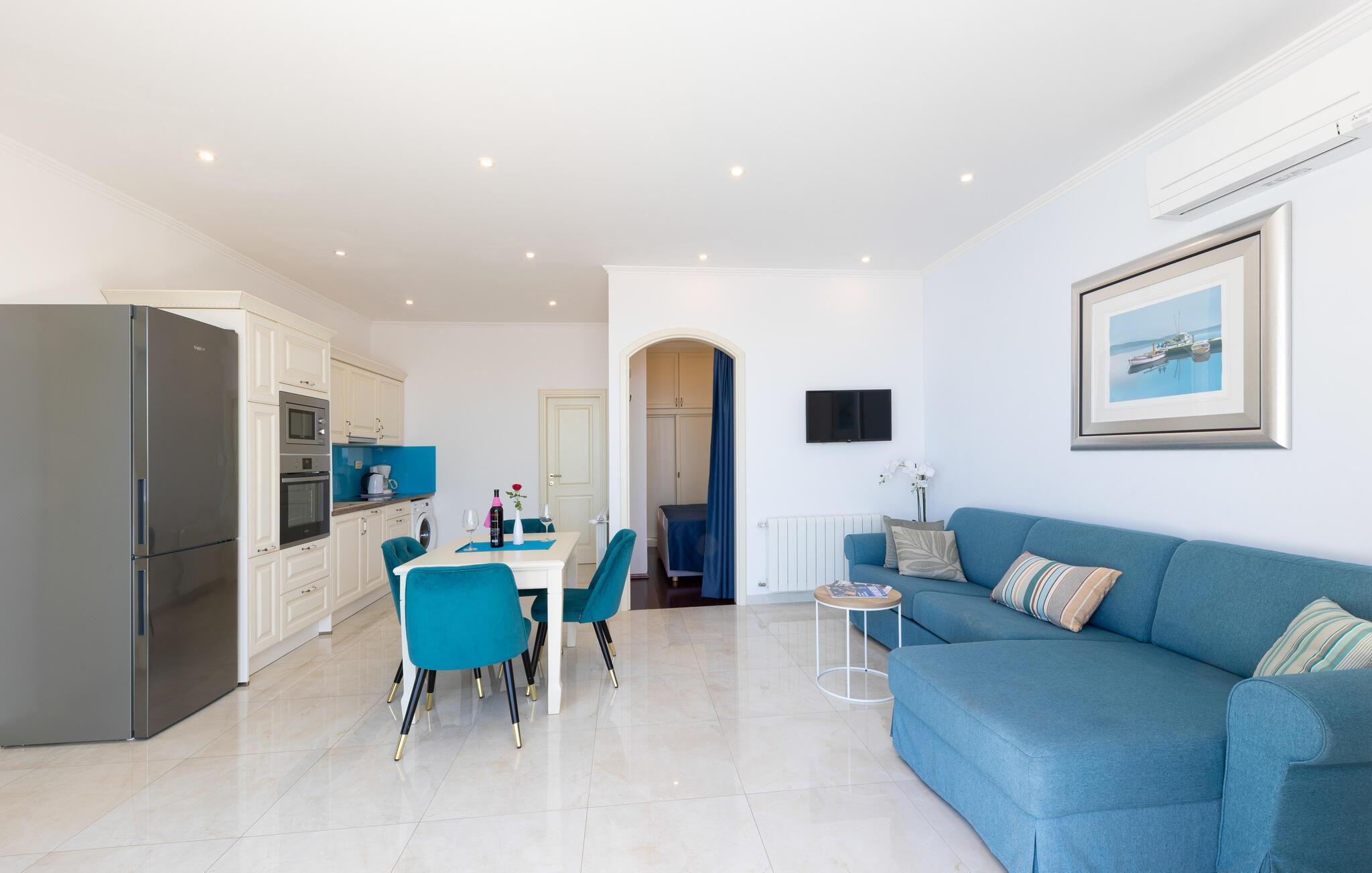 Denne lyse og komfortable ferielejlighed forkæler jer med moderne bekvemmeligheder og en frisk, elegant atmosfære. Gør skønne kulinariske højdepunkter i det åbne køkken og glæd jer til harmoniske stunder i den åbne opholdsstue, mens den blide havbrise strømmer gennem rummene. Føl jer godt tilpas i den store sofa til en filmaften eller hav det sjovt med et brætspil.