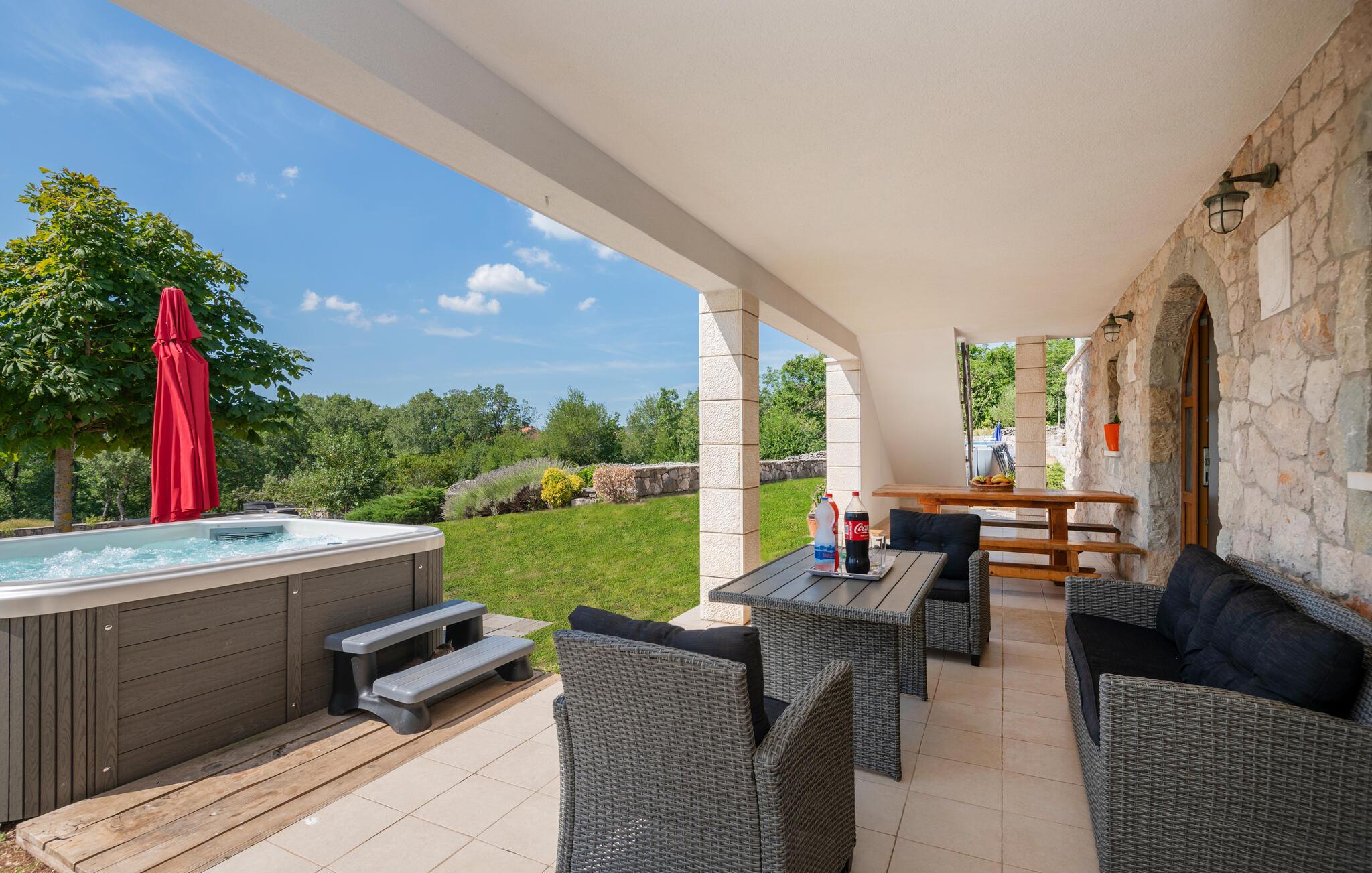 I den storslåede have kan I plaske rundt i poolen dagen lang og gøre det ekstra behageligt for jer selv i spabadet under stjernehimlen. Lad børnene løbe og lege i haven, mens I lægger planer for de kommende dages udflugter.