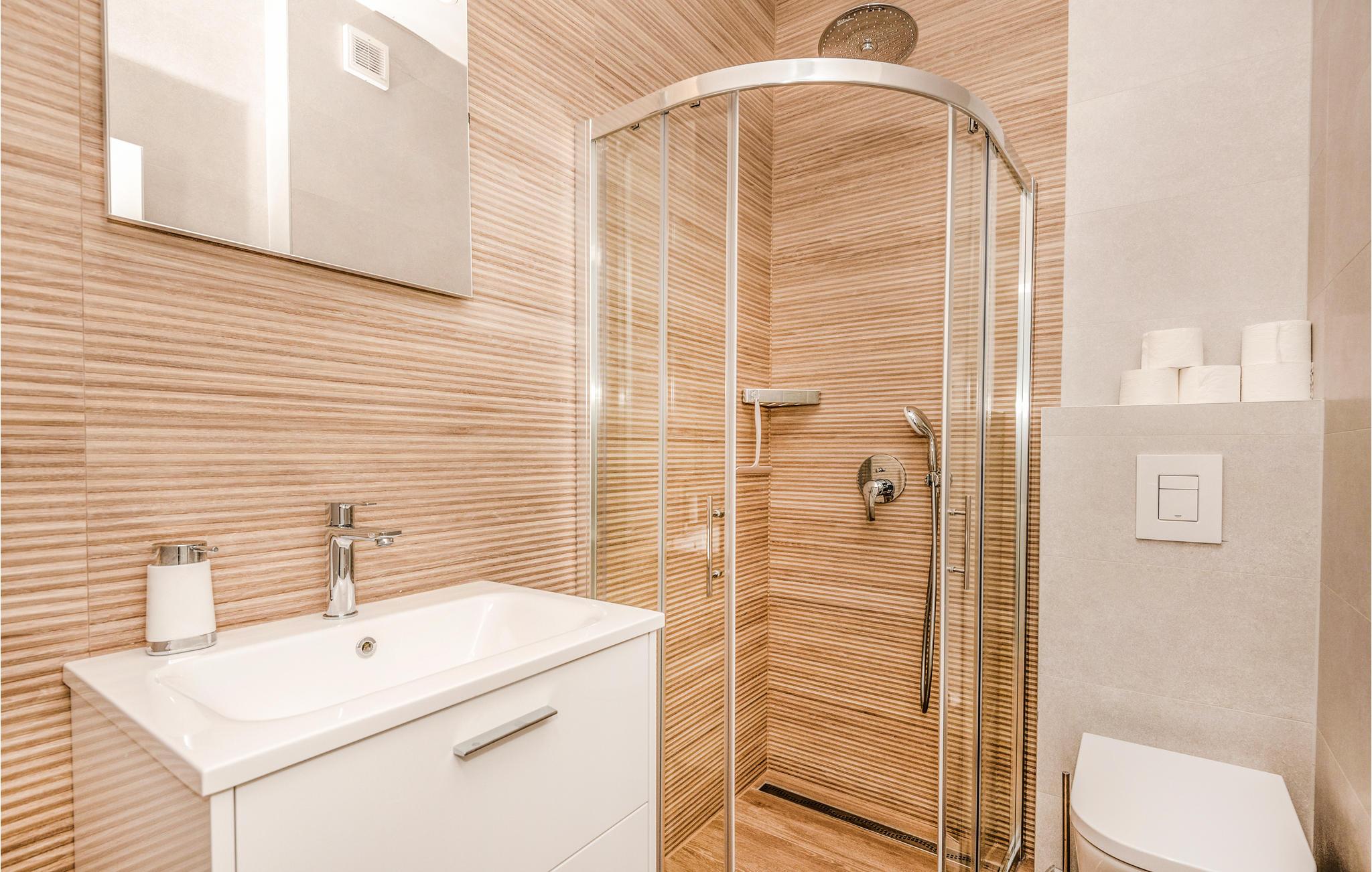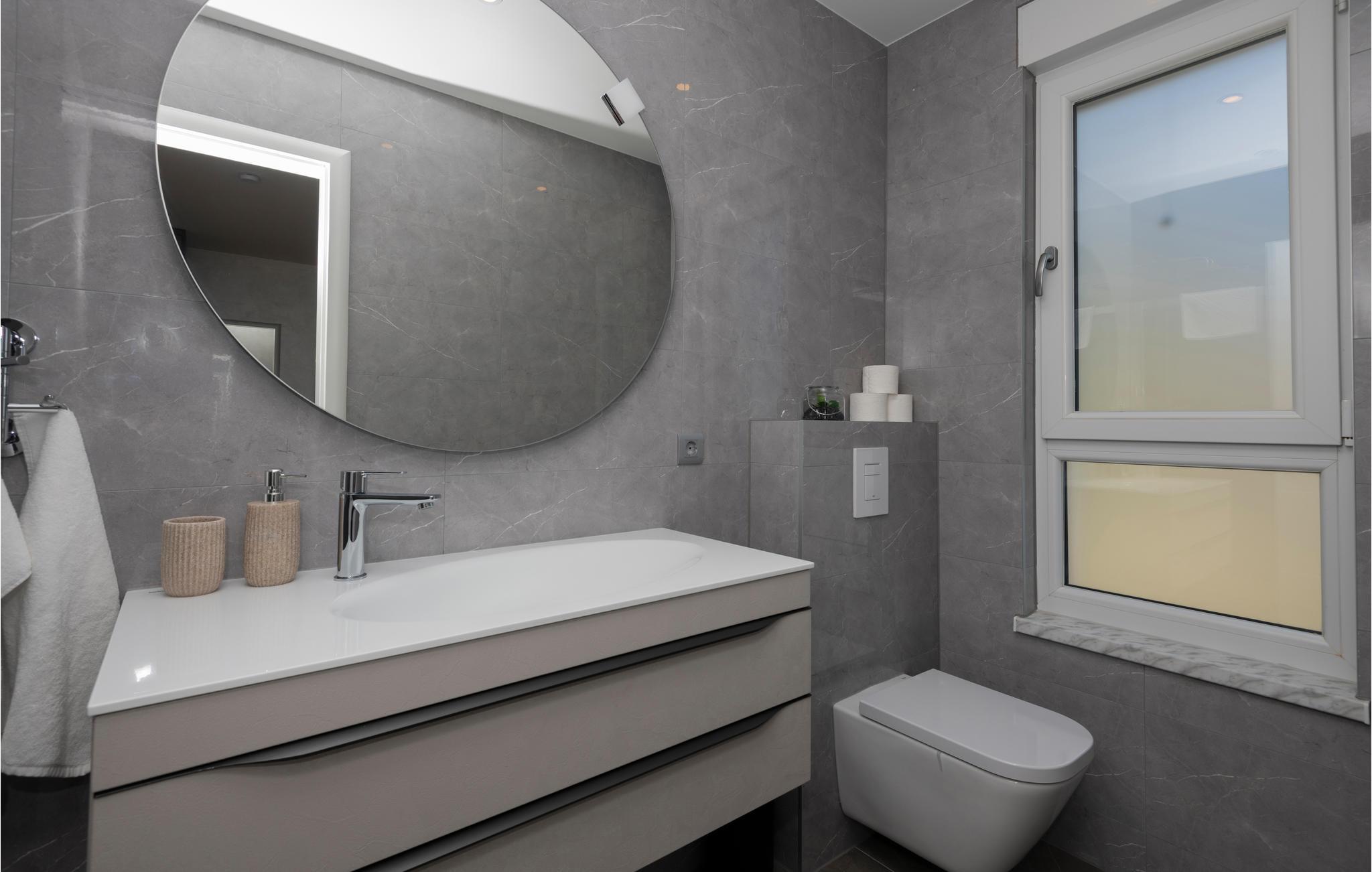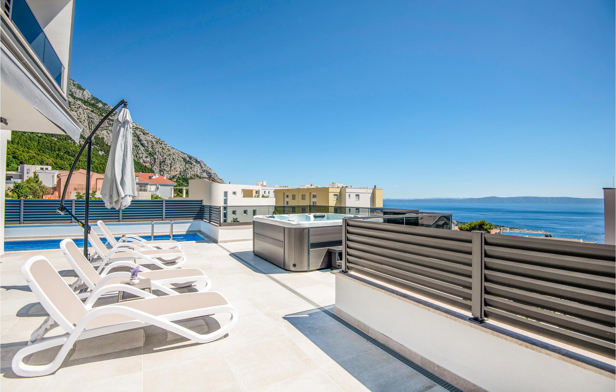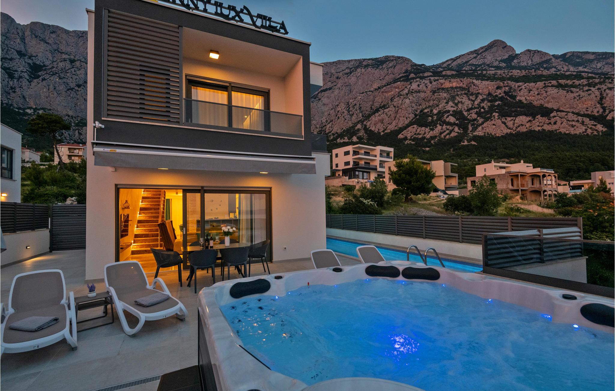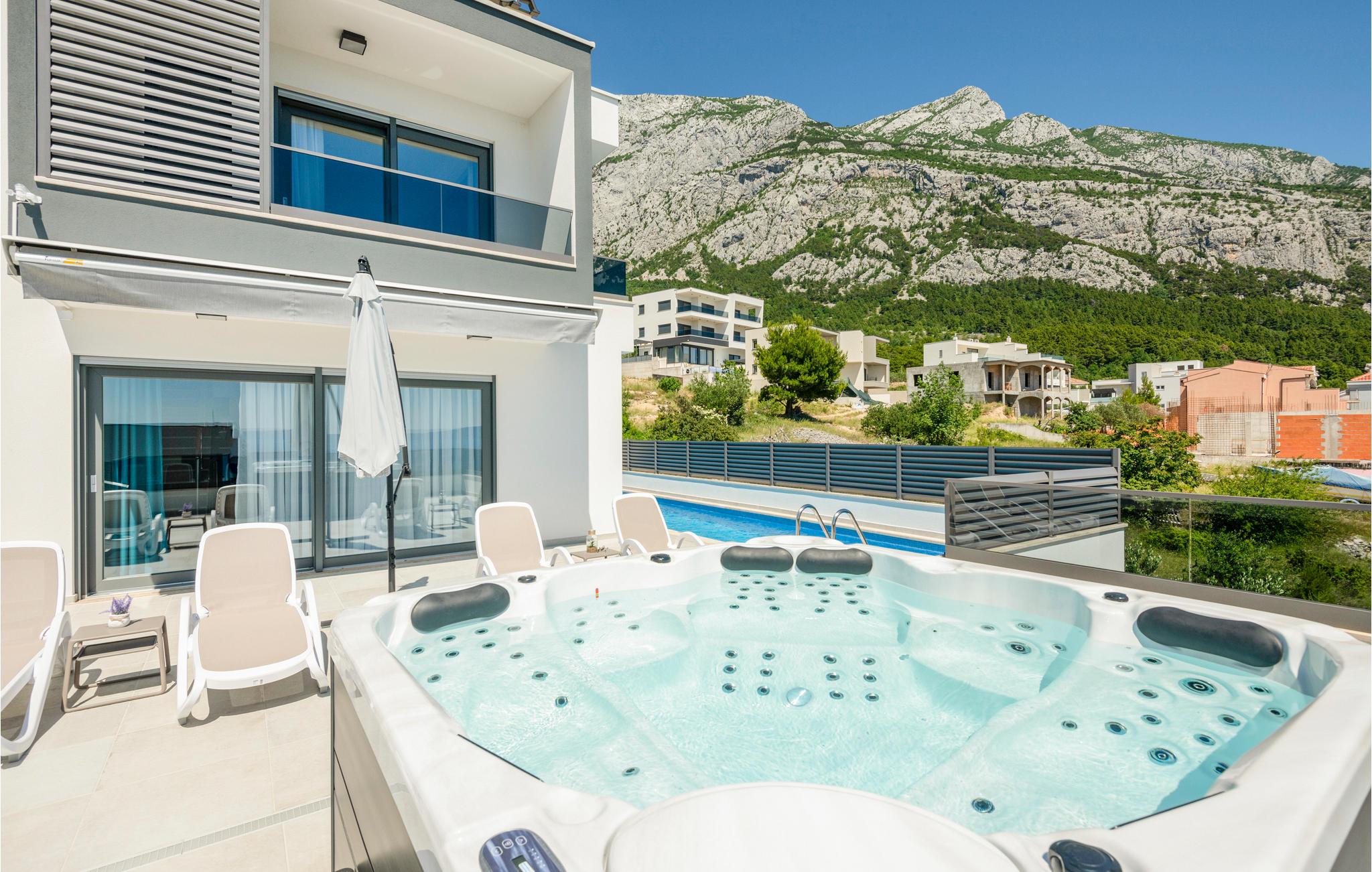 Dette dejlige og veludstyrede feriehus med pool blev bygget i 2021 og ligger i Makarska. Huset har aircondition og er i tre etager. I stueetagen er der fitnesscenter og underholdningsrum med billard, bordfodbold og dart. På 1. sal er der stue, køkken og spisestue. På anden sal er der 3 soveværelser med badeværelser. Alle etager er forbundne med trappe.