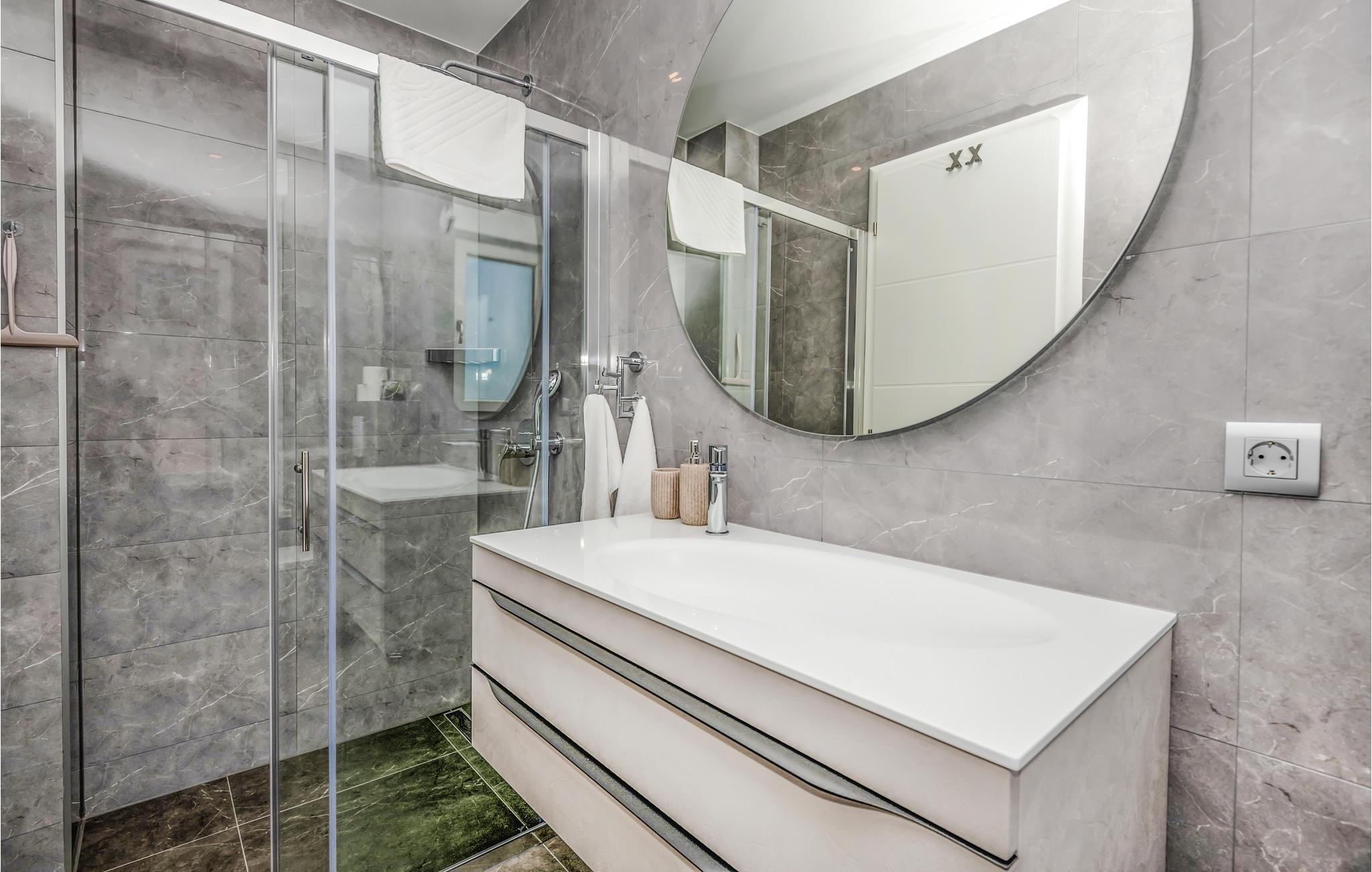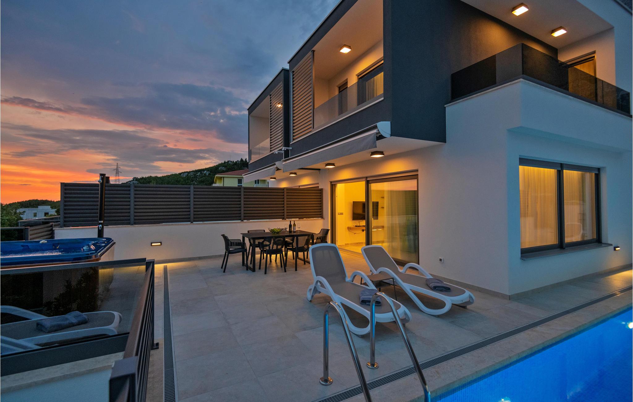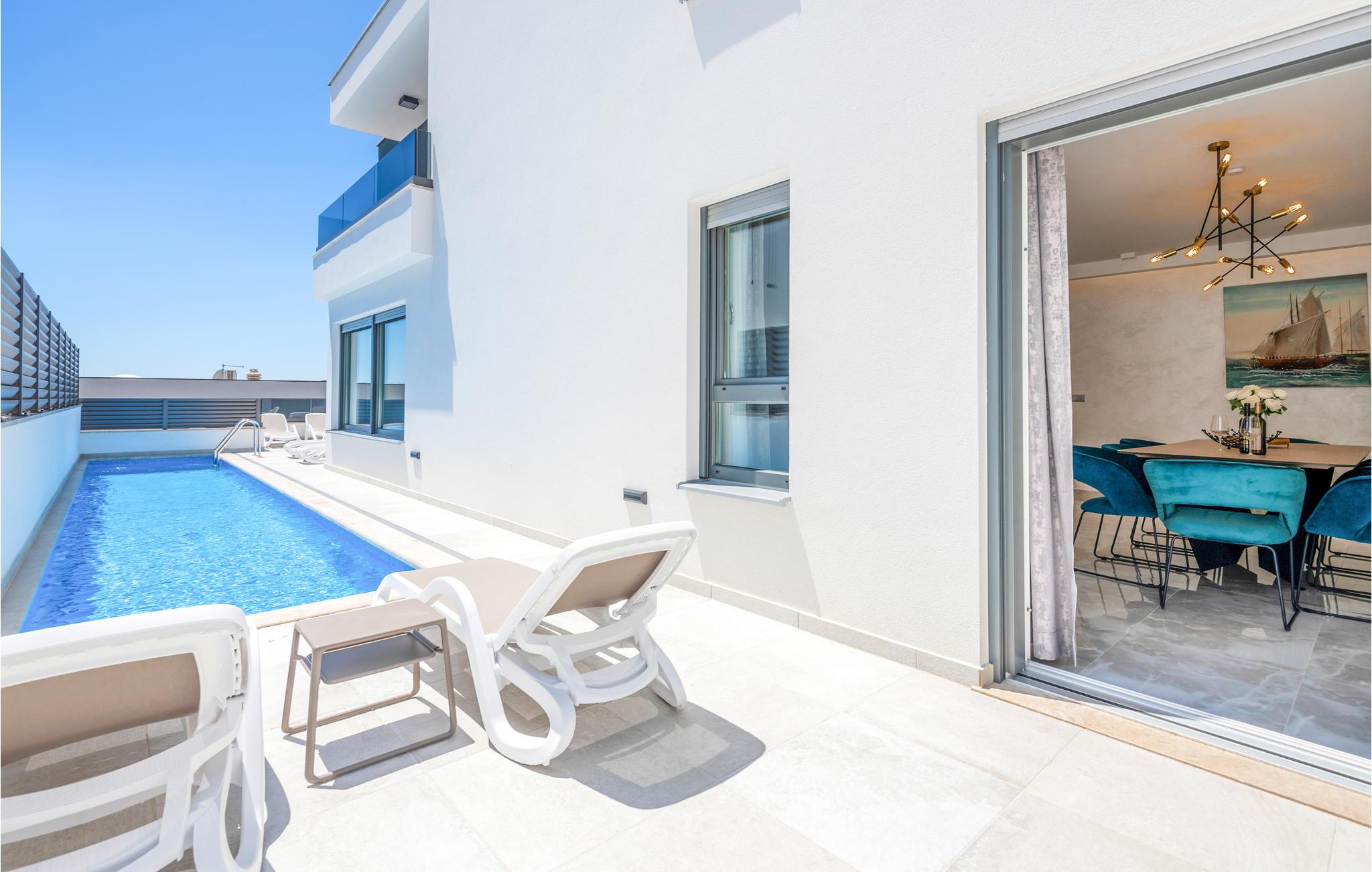 Dette dejlige og veludstyrede feriehus med pool blev bygget i 2021 og ligger i Makarska. Huset har aircondition og er i tre etager. I stueetagen er der fitnesscenter og underholdningsrum med billard, bordfodbold og dart. På 1. sal er der stue, køkken og spisestue. På anden sal er der 3 soveværelser med badeværelser. Alle etager er forbundne med trappe.