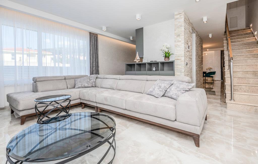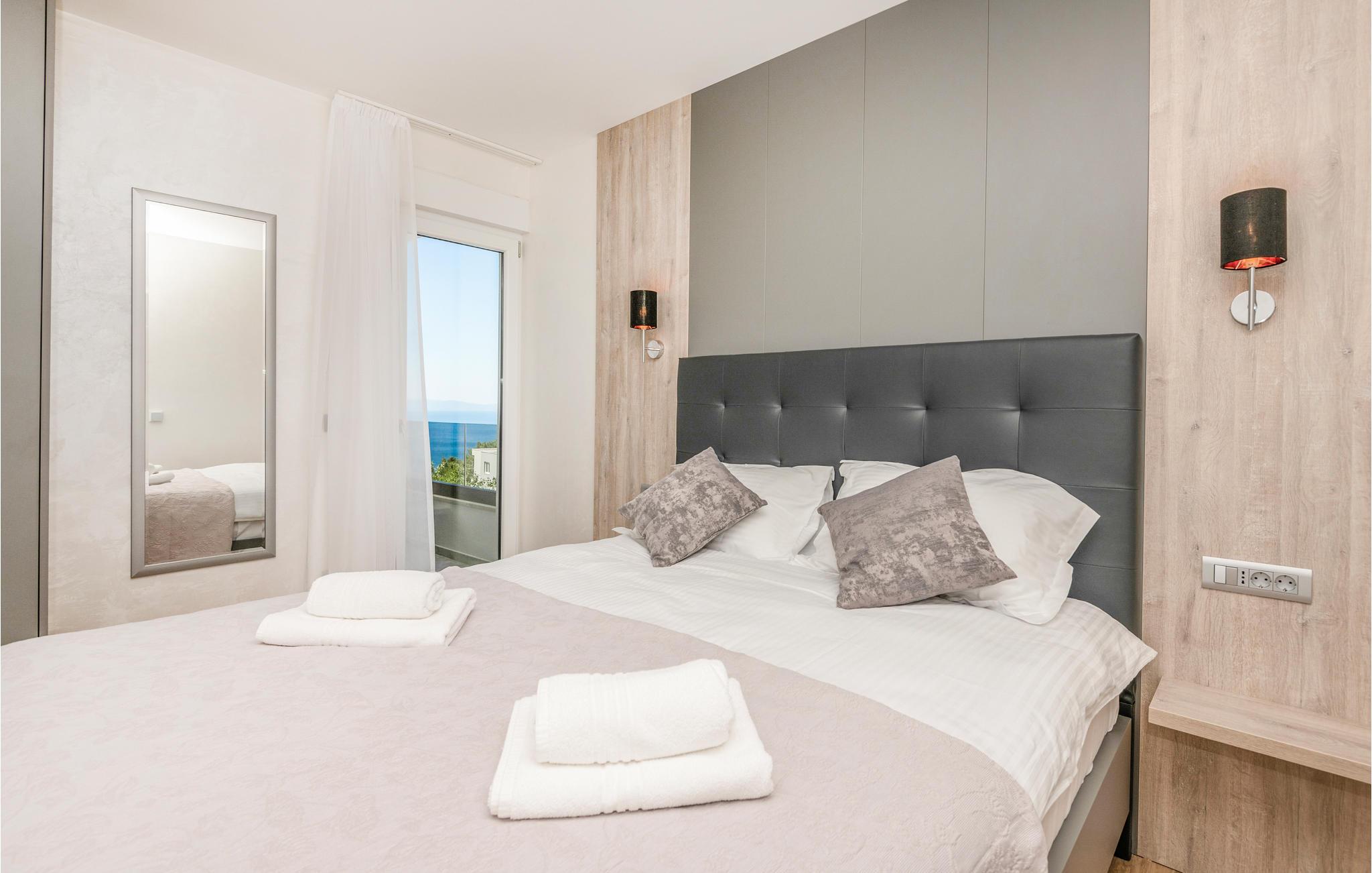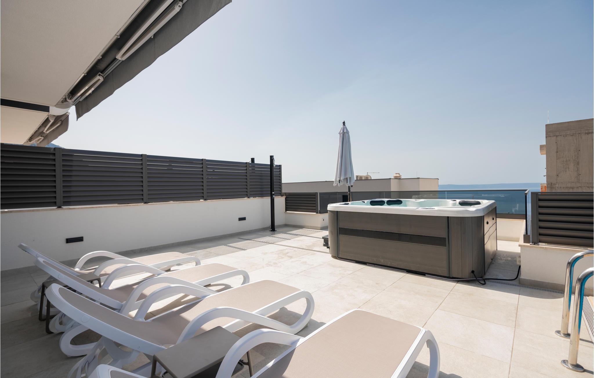 Dette dejlige og veludstyrede feriehus med pool blev bygget i 2021 og ligger i Makarska. Huset har aircondition og er i tre etager. I stueetagen er der fitnesscenter og underholdningsrum med billard, bordfodbold og dart. På 1. sal er der stue, køkken og spisestue. På anden sal er der 3 soveværelser med badeværelser. Alle etager er forbundne med trappe.