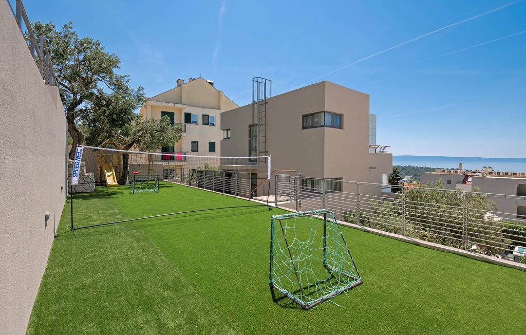 Dette enorme feriehus er det ideelle sted at tilbringe en førsteklasses ferie. Vågn op til strålende solskin og panoramaudsigt over det glitrende Adriaterhav. Spis morgenmad på en af de mange terrasser eller altaner og læg planer for dagen. Her er det næsten kun fantasien, der sætter grænser for, hvordan feriedagene kan tilbringes. Måske er det den private pool, der trækker, eller stranden med det glitrende badevand, en gåtur fra huset? Eller hvad med et spil billiard, bordtennis eller bordfodbold? Til børnenes underholdning er der talrige aktiviteter tilgængelige, herunder gynge, trampolin, rutchebane og vippe. Føler I jer sporty, kan I tage en tur på løbebåndet eller samle familien/vennerne til et spil badminton eller en fodboldkamp, efterfulgt af en tur i saunaen.