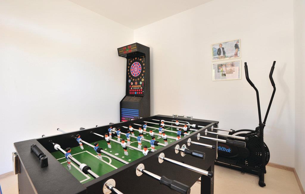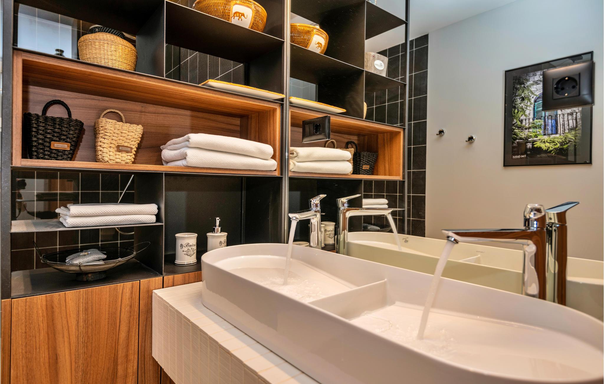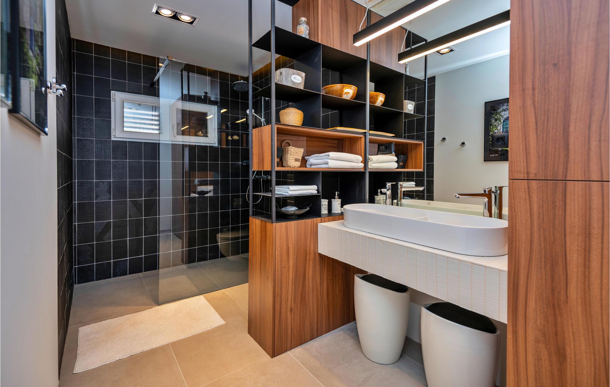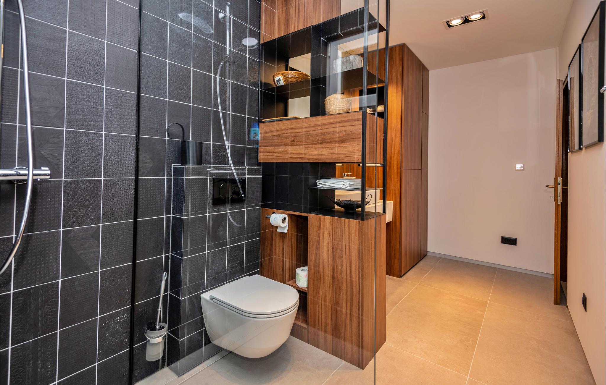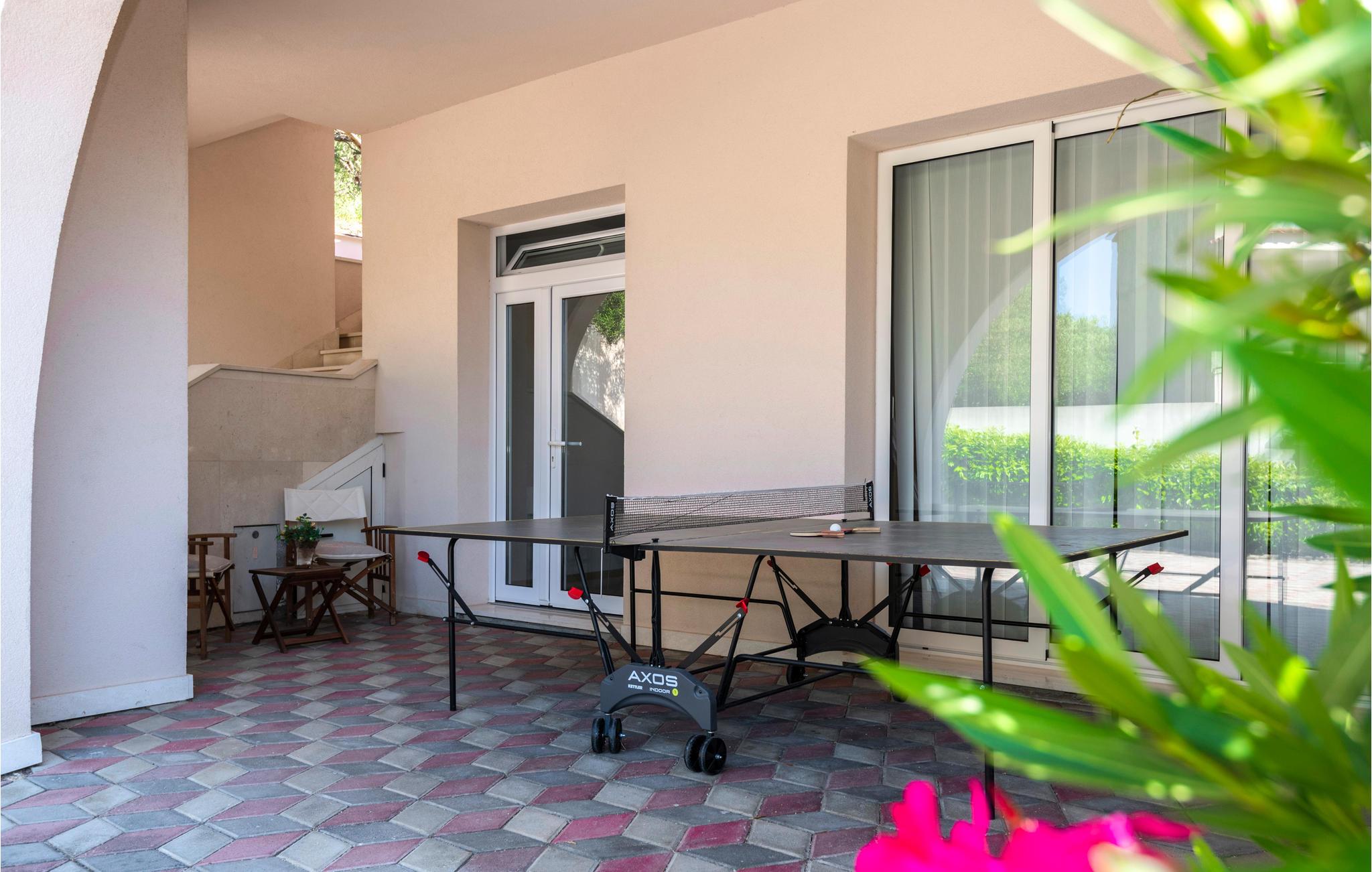 På en bakke over Makarskas centrum ligger dette dobbelthus klar til en komfortabel ferie. I stueplan er der aktivitetsrum samt en overdækket terrasse med grill og udendørs køkken. På første sal, som I kommer op til via en udendørs trappe, ligger stuen i åben forbindelse med køkkenet, tre soveværelser, tre badeværelser, et gæstewc og en stor terrasse. Oliventræer omgiver den udendørs pool, herfra er der også udsigt til naturparken Biokov. Kun fem hyggelige minutter til fods adskiller jer fra byens centrum, den dejlige kiesstrand og strandpromenaden med mange restauranter og barer.