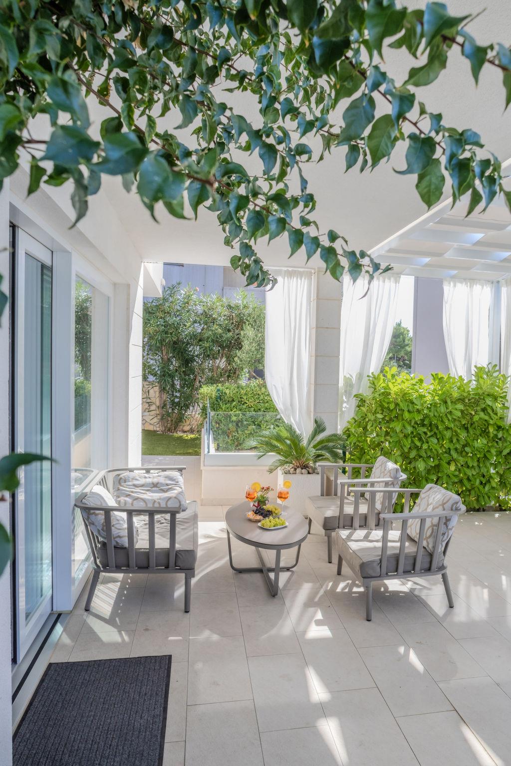 5-room villa 300 m2 on 2 levels, south facing position. Living/dining room 48 m2 with open-hearth fireplace and satellite TV (flat screen), air conditioning. Exit to the terrace. 1 room with 1 french bed (180 cm, length 200 cm), shower/WC and satellite TV (flat screen), air conditioning. Exit to the terrace. Open kitchen (oven, dishwasher, 4 ceramic glass hob hotplates, microwave, freezer, electric coffee machine). Sep. WC. Upper floor: 2 rooms, each room with 1 french bed (180 cm, length 200 cm), shower/WC and satellite TV (flat screen), air conditioning. Exit to the balcony. 1 room with 1 french bed (200 cm, length 200 cm), shower/WC and satellite TV (flat screen), air conditioning. Exit to the balcony. 2 balconies 6 m2, balcony 10 m2, terrace 50 m2 partly roofed. Terrace furniture, deck chairs. Facilities: safe, children's high chair, baby cot, hair dryer. Internet (WiFi, free).