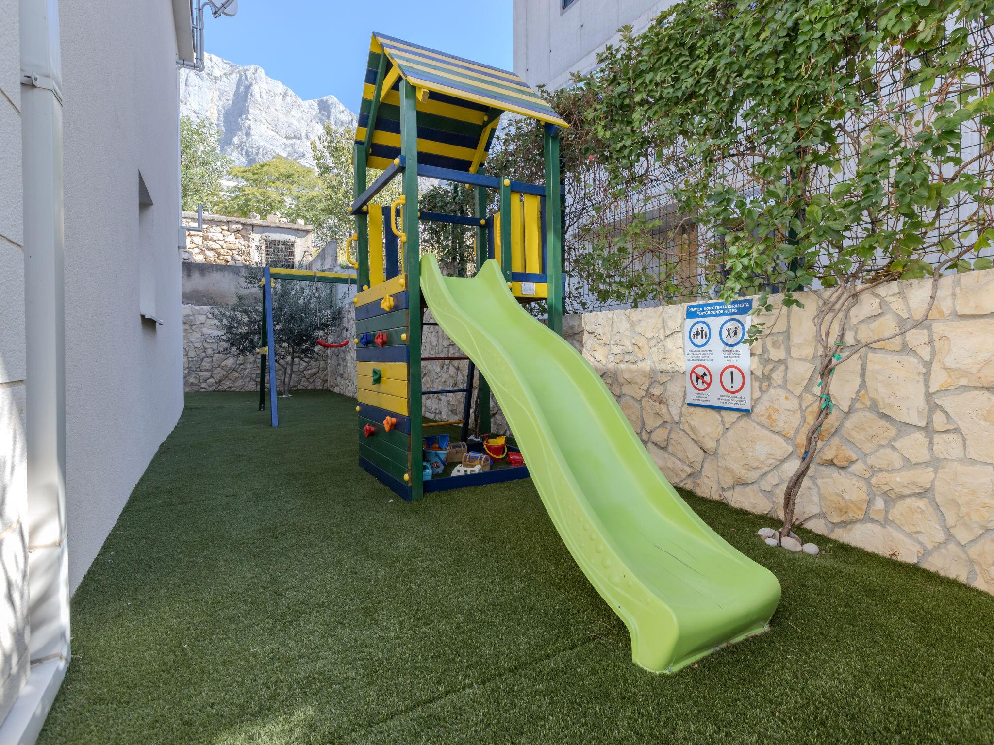 Veliko Brdo 2 km from Makarska: Villa "Luka", 2 storeys. Above Makarska, in a sunny, elevated position, 1.4 km from the sea, 1.4 km from the beach, in a cul-de-sac. Private: property 400 m2, lawn 84 m2, swimming pool heated (25 m2, depth 150 cm, seasonal availability: 01.May. - 01.Oct.). Unconventional pool shape. Terrace (20 m2), garden furniture, barbecue (slide, swing). In the house: internet access, sauna, fitness room, billiard table, table football, washing machine. Parking (for 2 cars) at the house on the premises, single garage. Shop 500 m, restaurant 1.5 km, bus stop 3 km, pebble beach 1.4 km. Swimming pool heated or cooled (extra). It is necessary to announce 7 days in advance if the pool heating or pool cooling is required. Swimming pool with counterflow, hydromassage and waterfall. By groups of young people double deposit is requested on arrival.