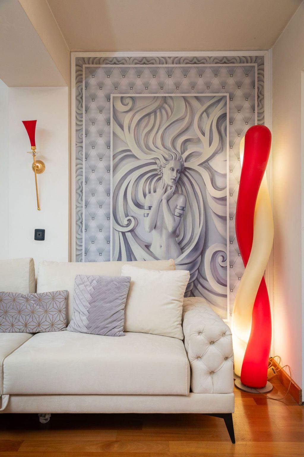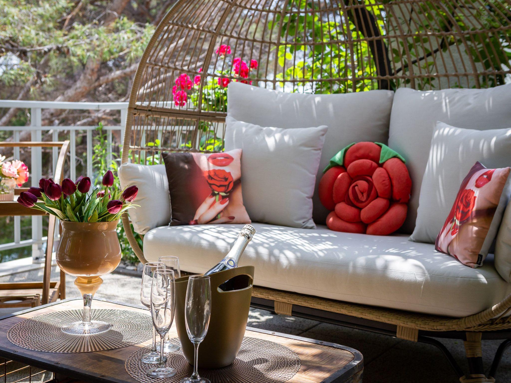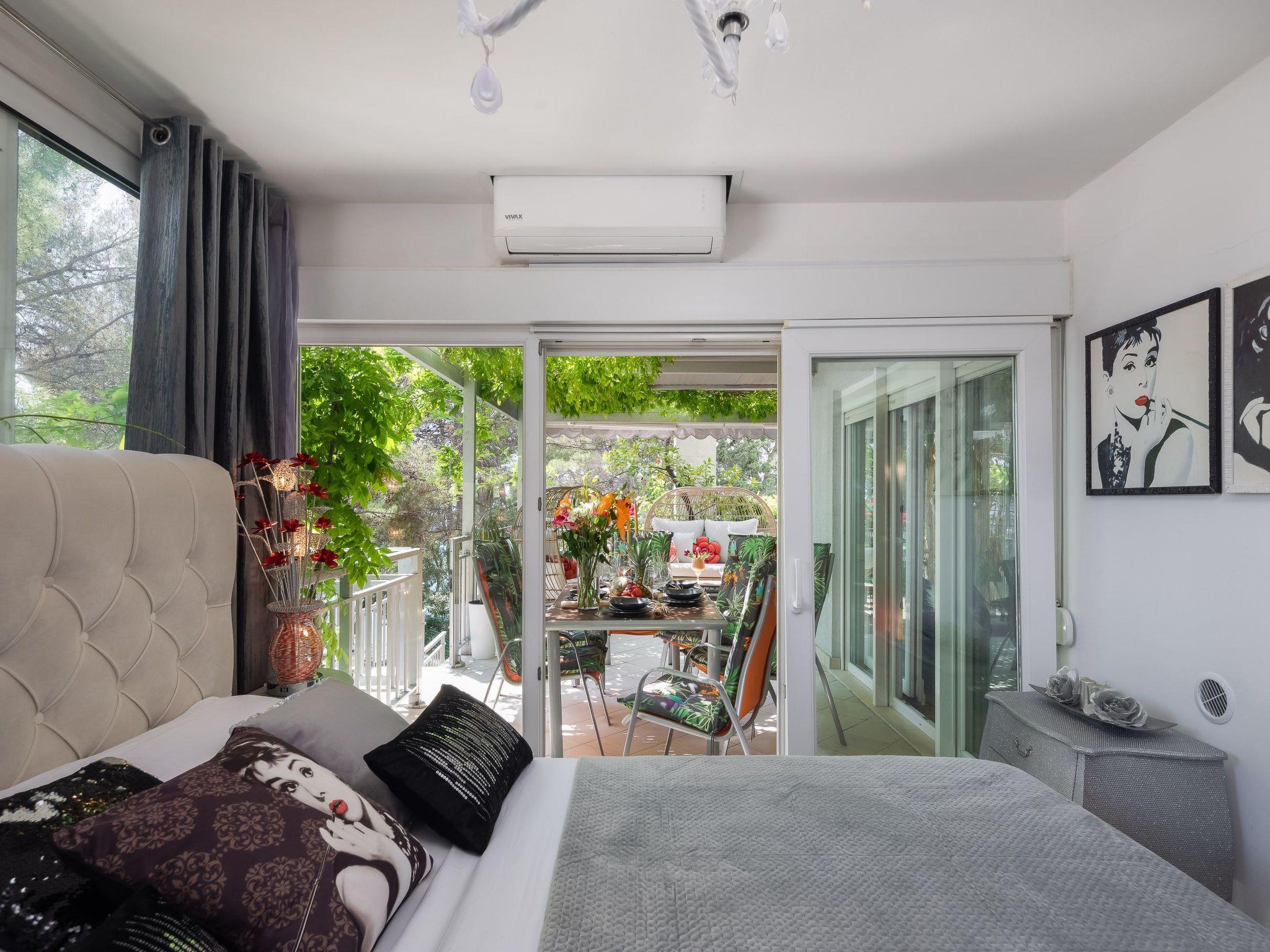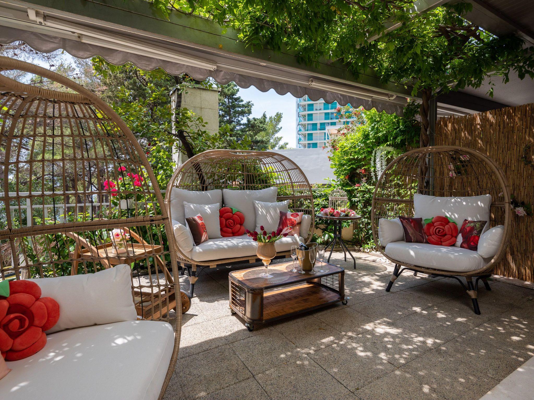 The outdoor terrace enveloped in lush greenery offers a secluded spot to unwind or enjoy al fresco dining. It's complemented by an electric grill, inviting guests to enjoy open-air cooking. The surrounding garden, exclusively available for guests’ usage, provides a peaceful setting to enjoy the outdoor air and is a secure space for relaxation.