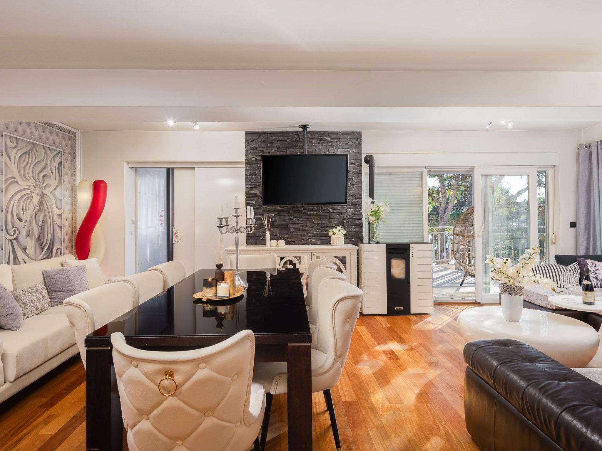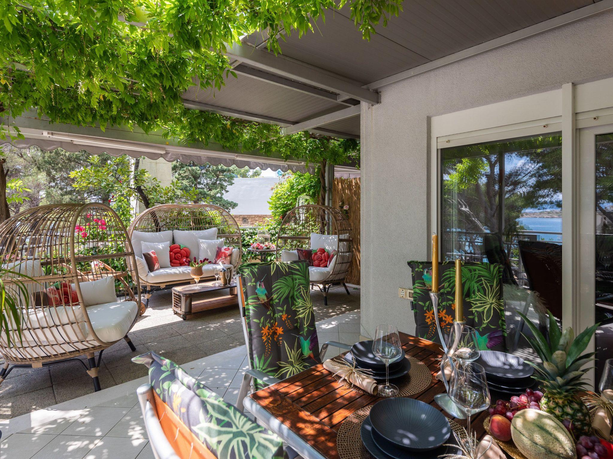 Located just steps away from the sea, this apartment offers immediate access to water sports and beachside enjoyment, ensuring a memorable vacation filled with sun, sea, and sand. With the nearest town center only 300 meters away, guests have the convenience of exploring local shops, eateries, and cultural sights without the need for long commutes. This prime location allows for an authentic Dalmatian experience, combining the serenity of a beachside retreat with the vibrancy of town life.