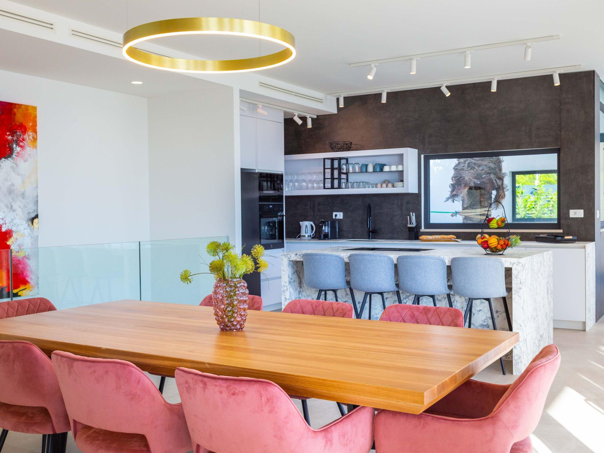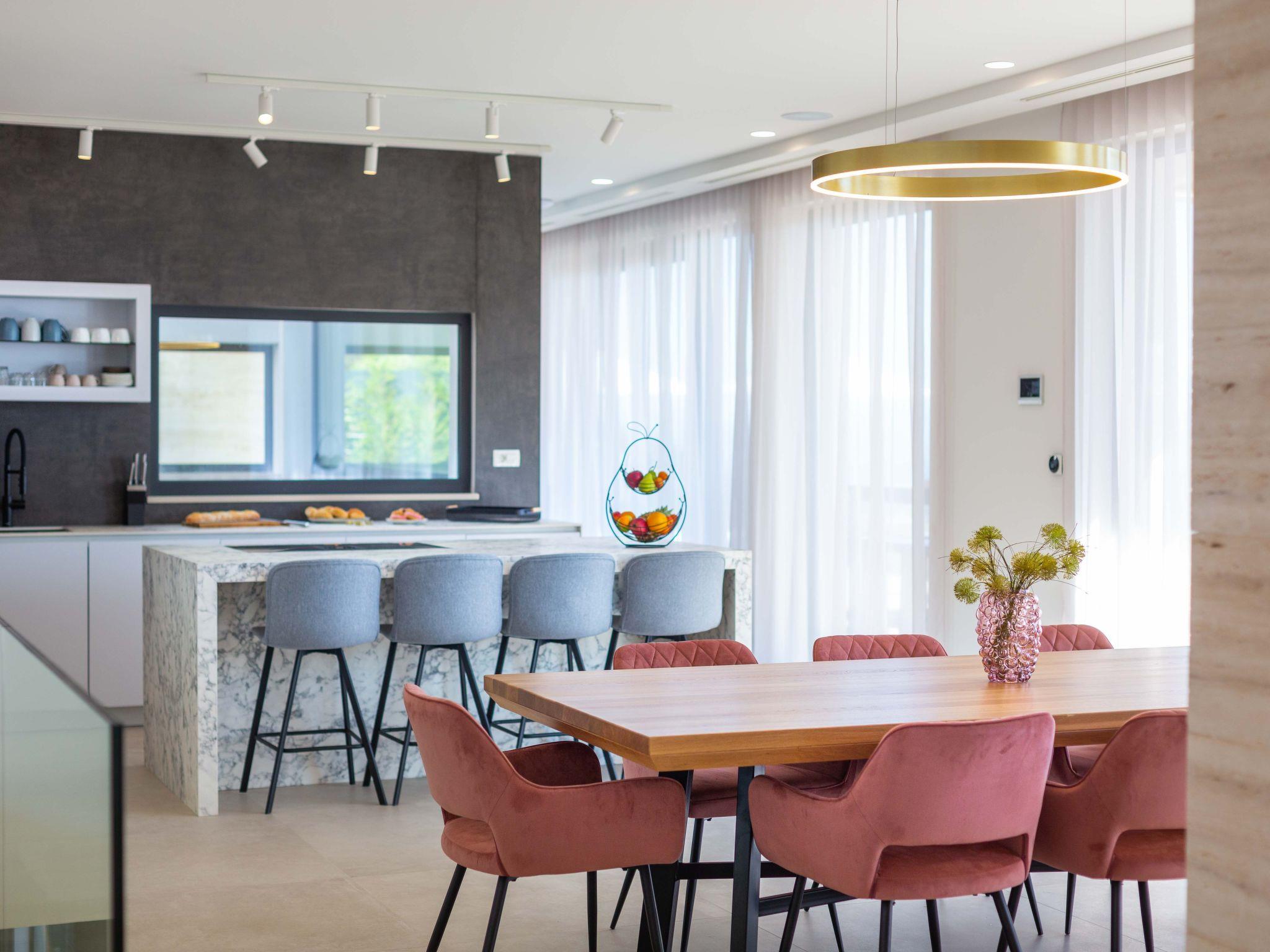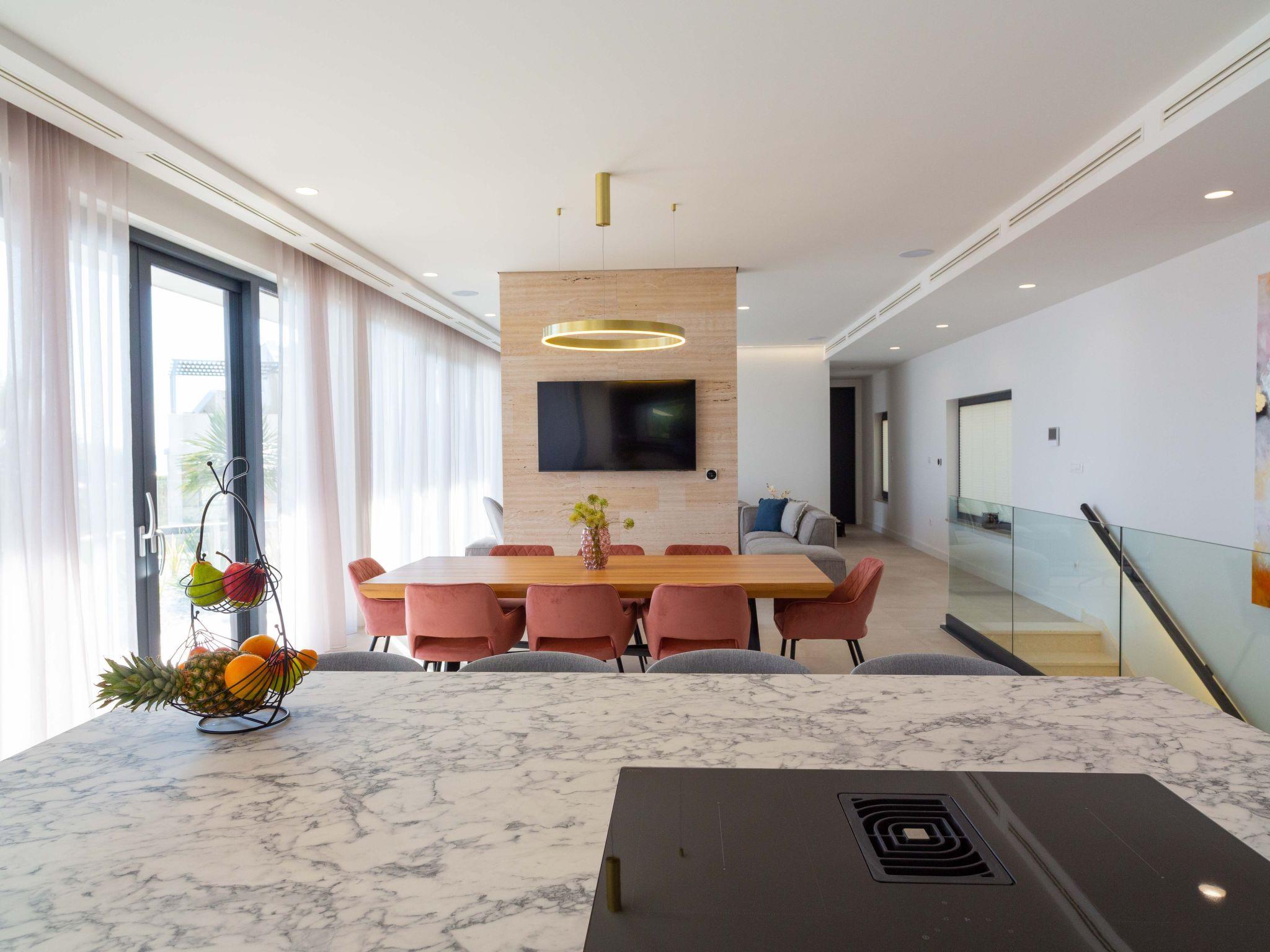 Inside, Villa Valentina boasts a comprehensive and thoughtfully designed interior to cater to all your needs and ensure a comfortable stay. The residence features 4 spacious bedrooms paired with 8 well-appointed bathrooms, ensuring privacy and convenience for all guests. The house is equipped with essential modern conveniences including air conditioning throughout, underfloor heating for those cooler evenings, a washing machine, and a dryer for exclusive use. For entertainment, guests can enjoy a round of billiards, while the kitchen comes complete with a dishwasher, coffee machine, and electric kettle—perfect for self-catering holidays.