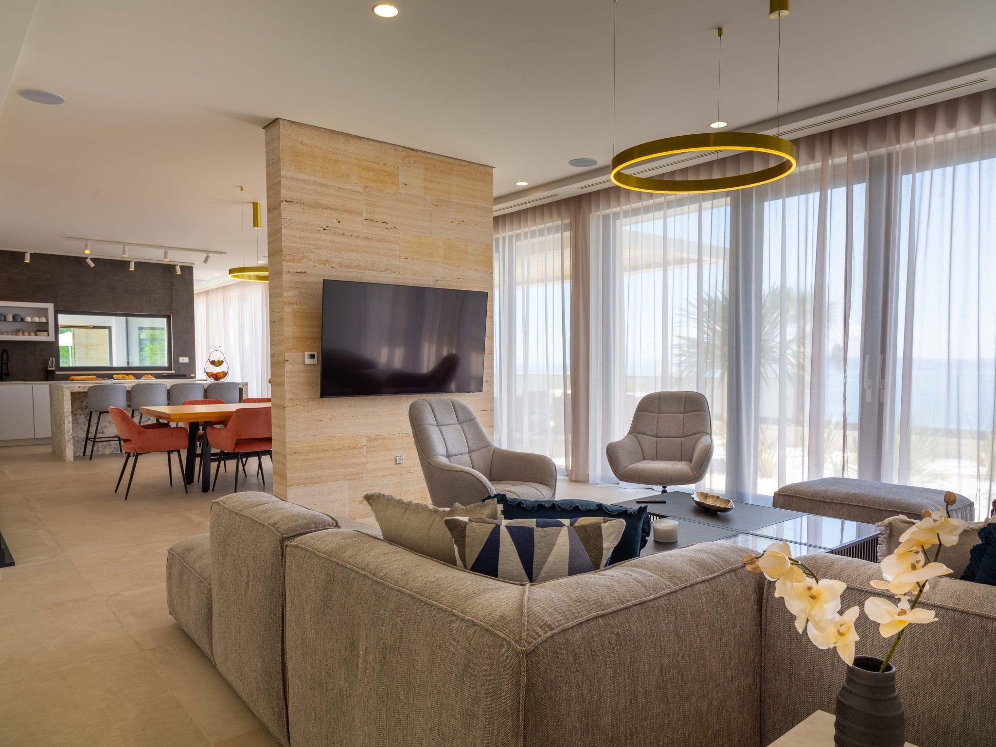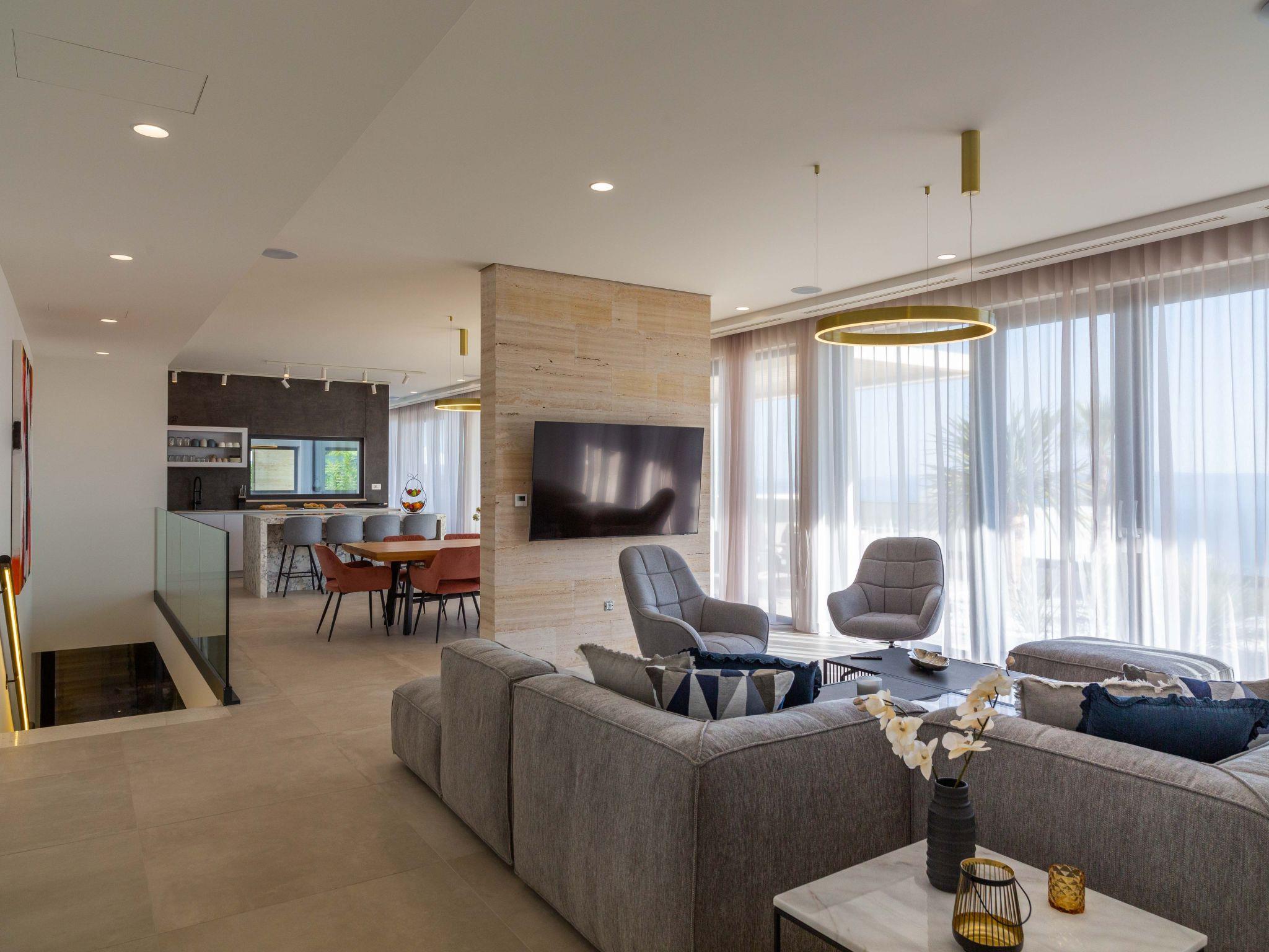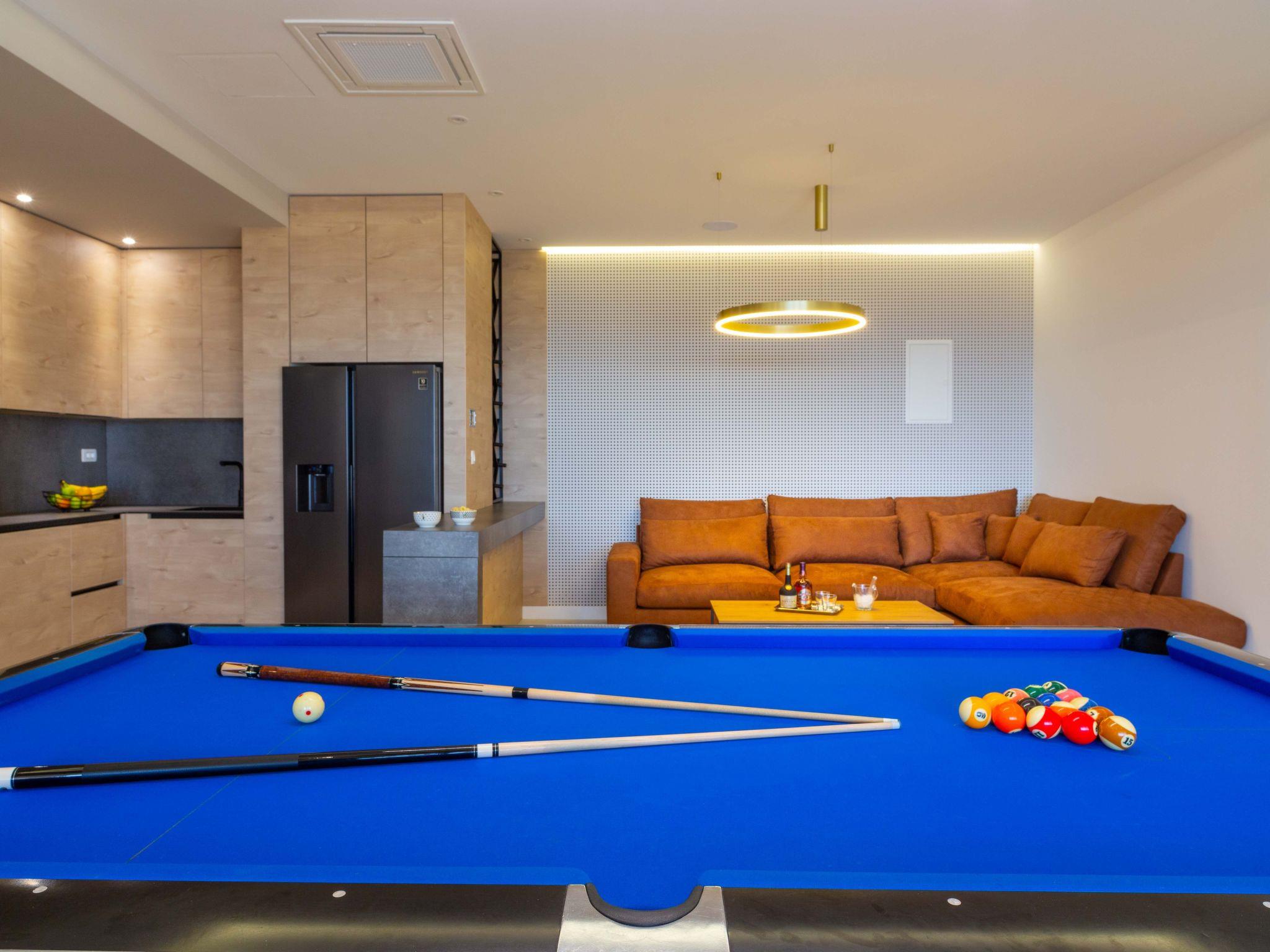 Inside, Villa Valentina boasts a comprehensive and thoughtfully designed interior to cater to all your needs and ensure a comfortable stay. The residence features 4 spacious bedrooms paired with 8 well-appointed bathrooms, ensuring privacy and convenience for all guests. The house is equipped with essential modern conveniences including air conditioning throughout, underfloor heating for those cooler evenings, a washing machine, and a dryer for exclusive use. For entertainment, guests can enjoy a round of billiards, while the kitchen comes complete with a dishwasher, coffee machine, and electric kettle—perfect for self-catering holidays.