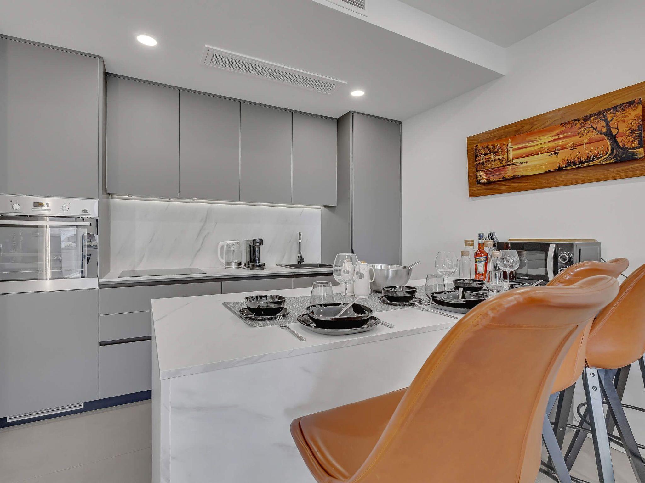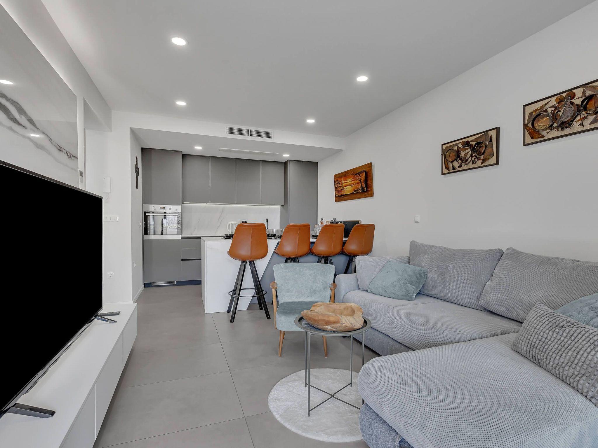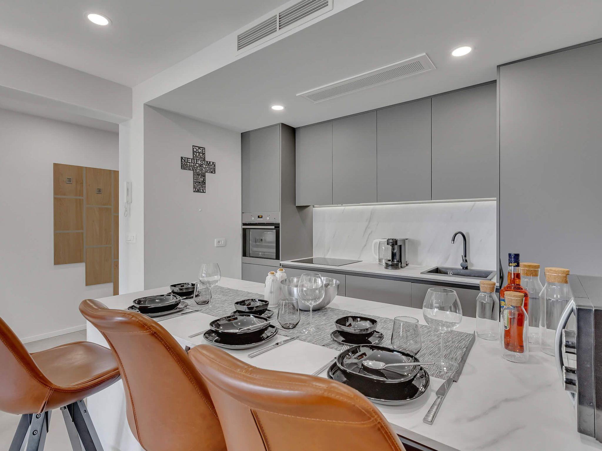 The apartment's interior is thoughtfully laid out to maximize comfort and functionality. Guests will find a well-appointed living area equipped with a comfortable sofa bed, offering a cozy spot for relaxation or additional sleeping arrangements. For your convenience, the apartment is fitted with essential appliances including a dishwasher and an electric kettle, taking the hassle out of holiday meal preparations. The presence of air conditioning throughout ensures a comfortable environment, regardless of the weather outside.