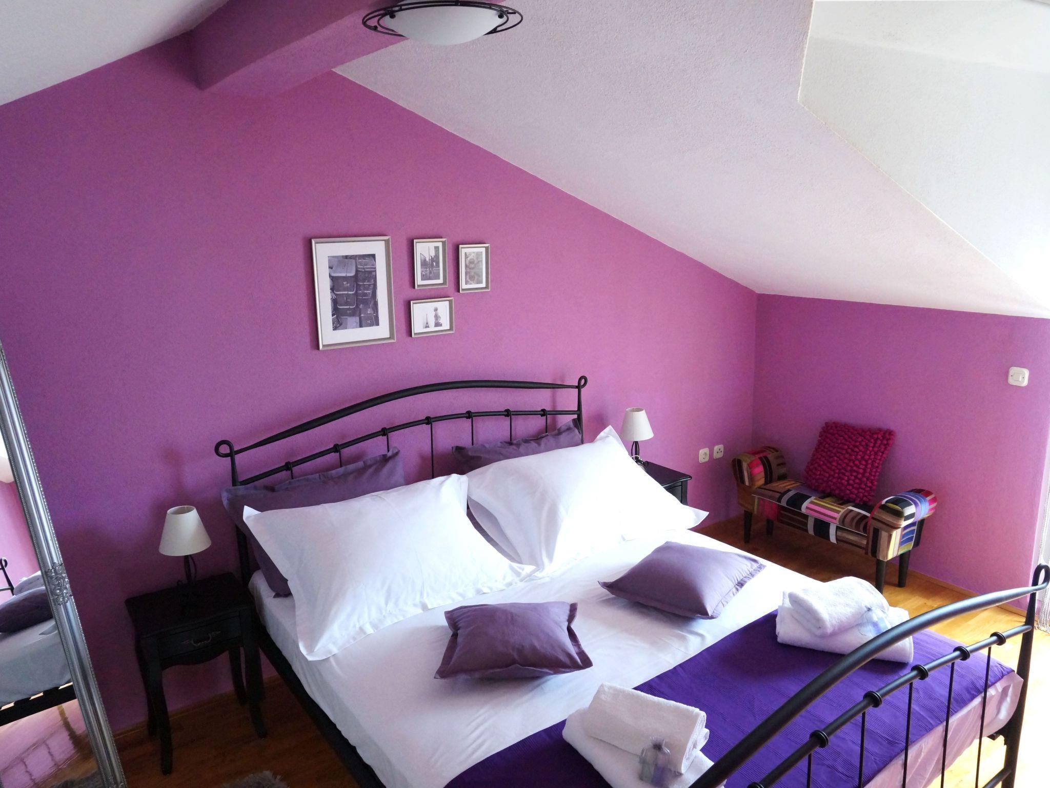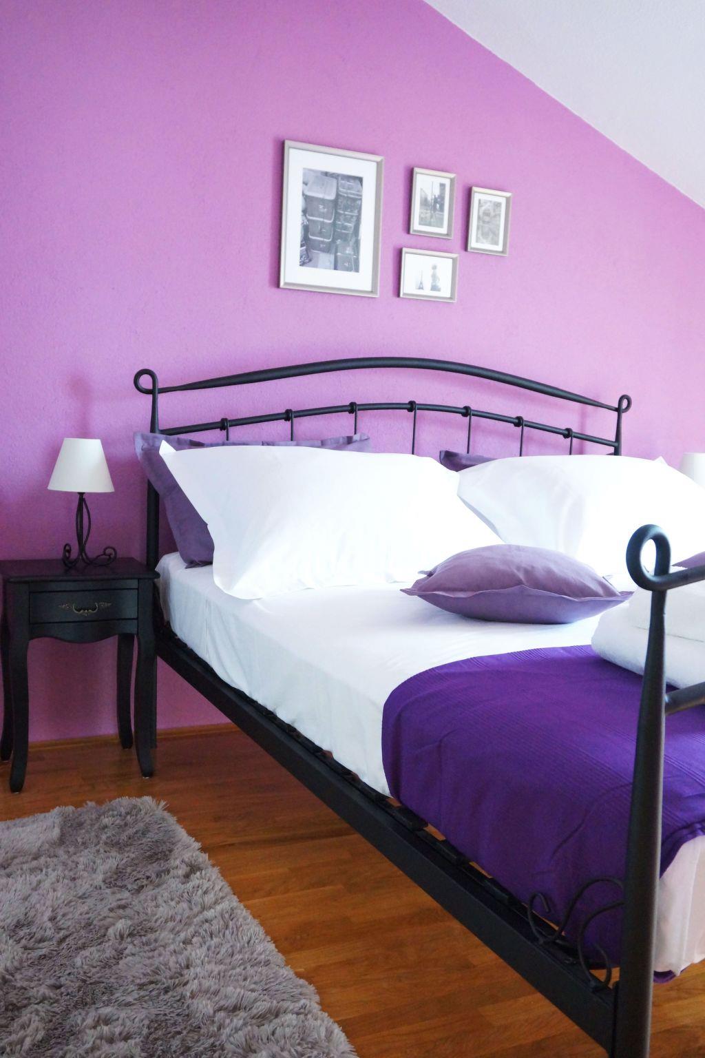Interior staircase connects ground floor with two upper floors. On the first floor, there is another fully equipped modern style kitchen with a table for four, balcony, stylish living room (air-conditioner, flat screen TV), bathroom (with a shower) and a first master bedroom with a king-size bed (Peach Room). The second floor (air-conditioned) comprises of a third bathroom (whirlpool bathtub), small sitting area, second master bedroom with a king-size bed and a spacious closet with sliding doors (Purple Room) and a third bedroom with a queen-size bed (Blue Room). Both rooms have direct access to the roof terrace with deck chairs and magnificent view.