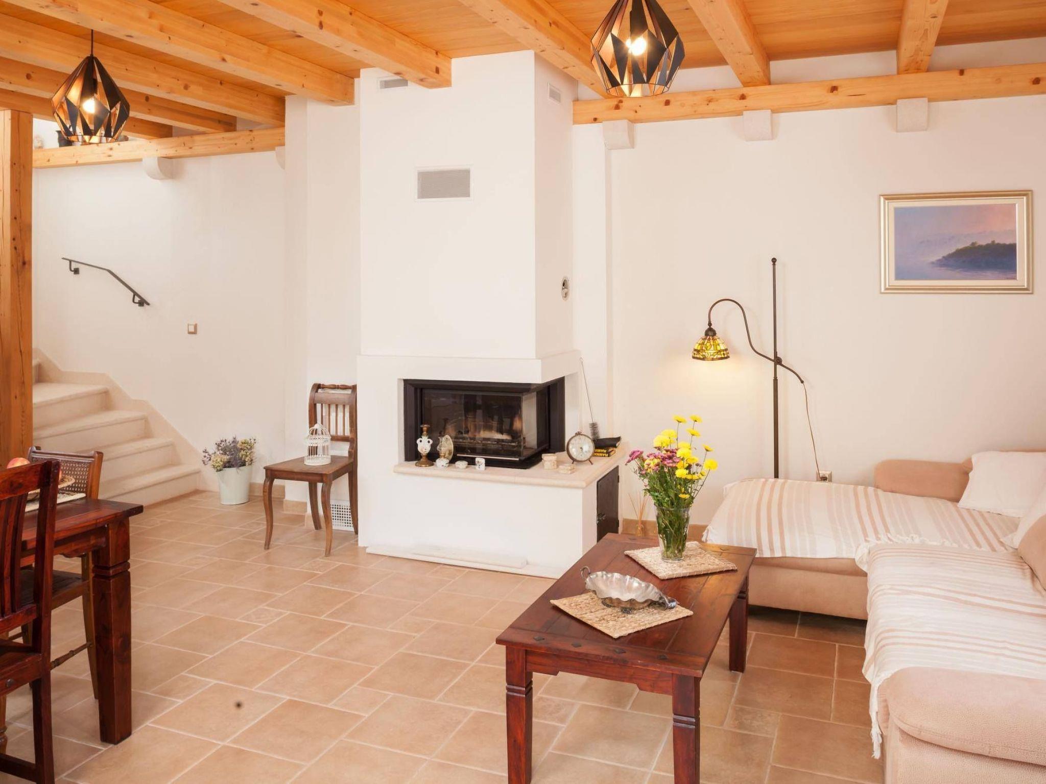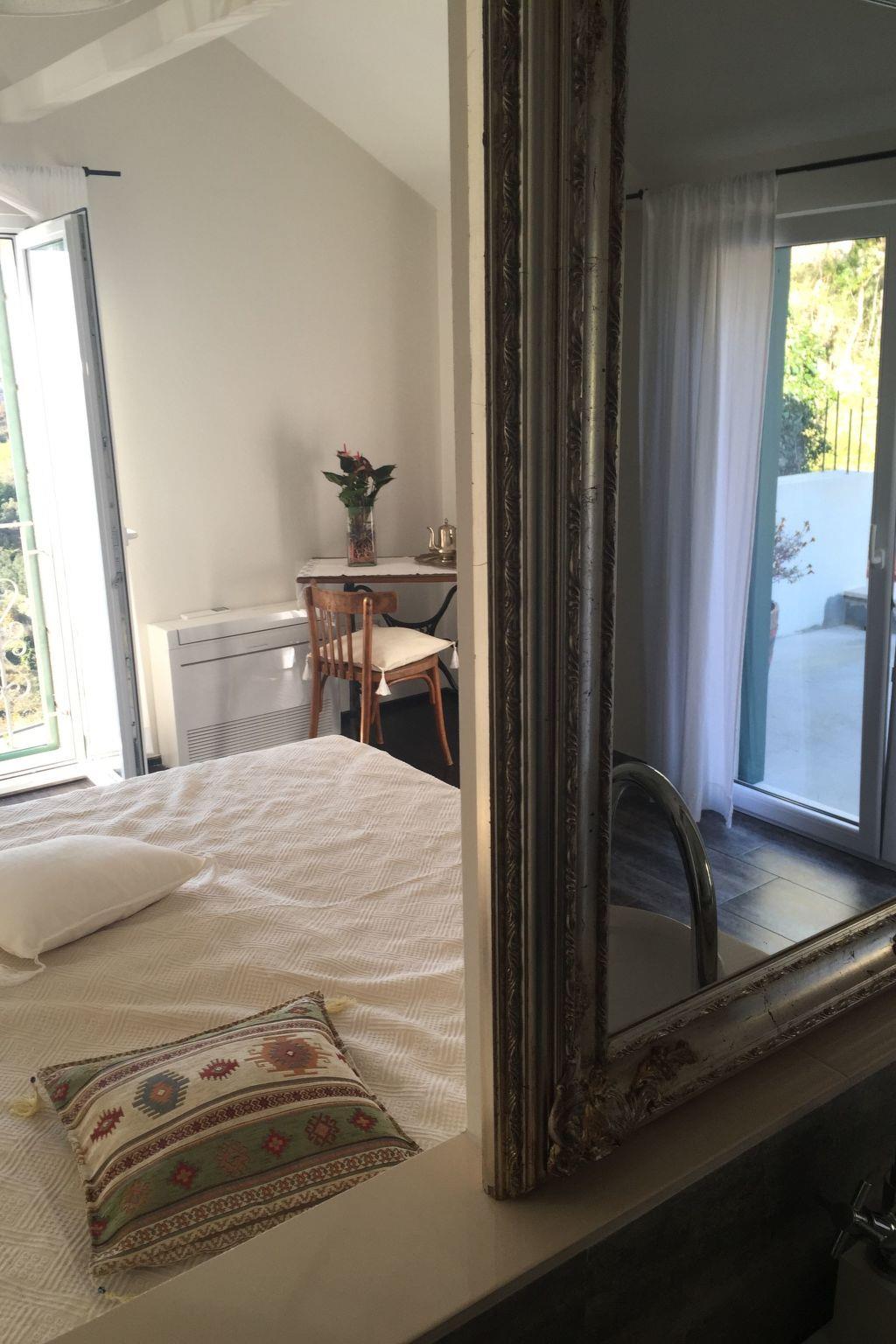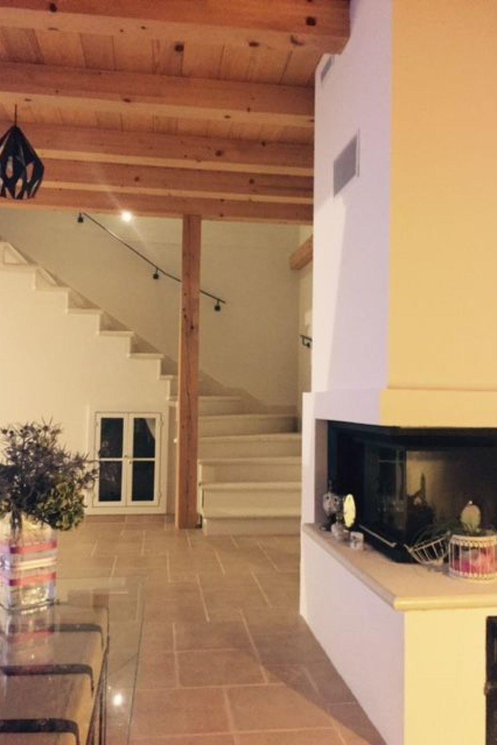 The house consists of two floors. The ground floor comprises a large living room with a double sofa bed and a fireplace, a fully-equipped kitchen with a dining space, and a toilet. This area opens to the outdoors and the beautiful garden. The first floor has a bedroom with a double bed 200cm wide and a balcony, as well as a bathroom with a shower and toilet. The house has air conditioning throughout and an Internet connection. There is also under-floor heating in the living room and in the kitchen, but which is not for use in summer, only during the cooler season.
