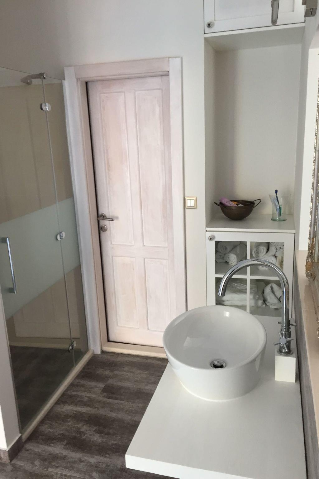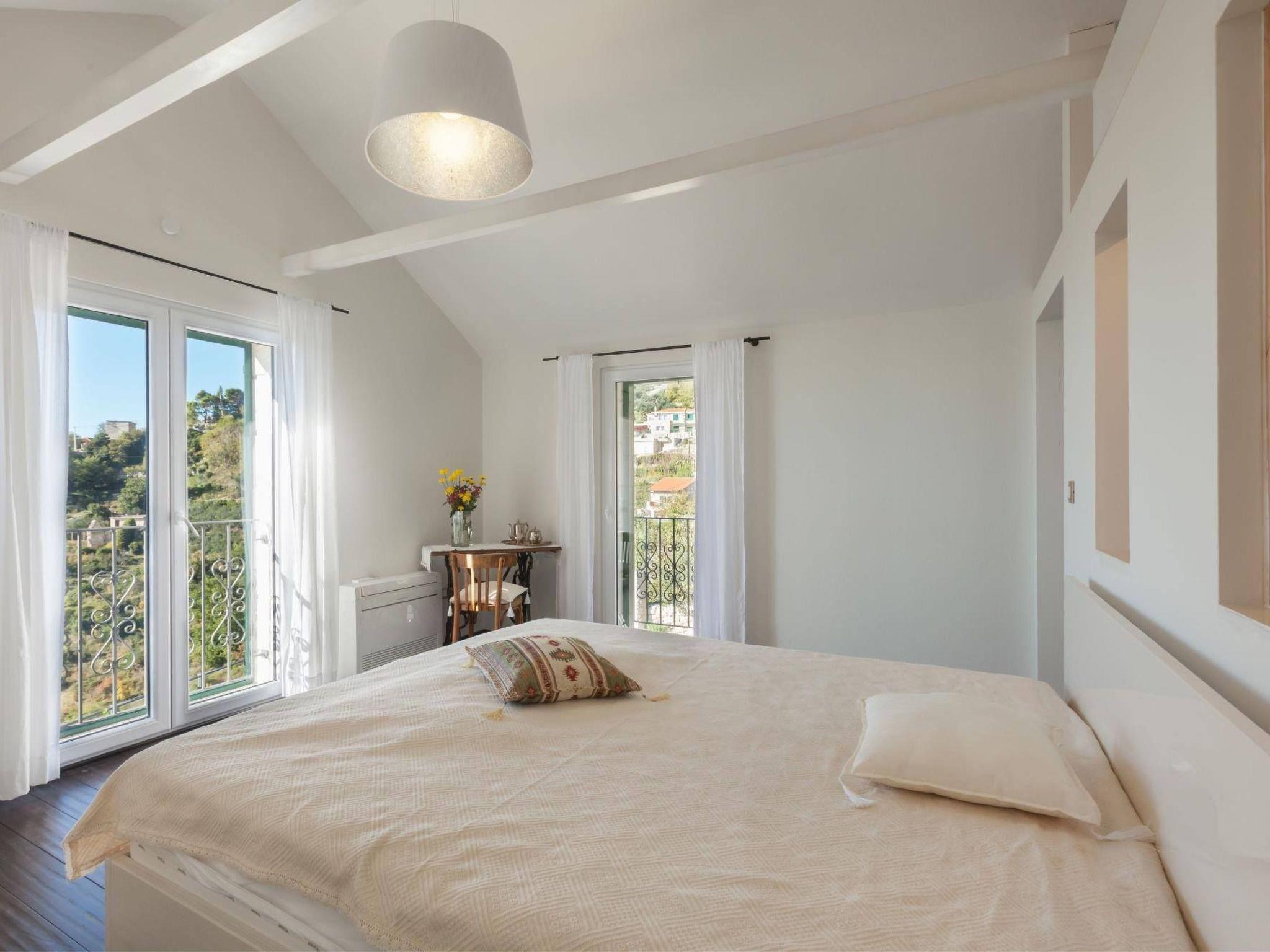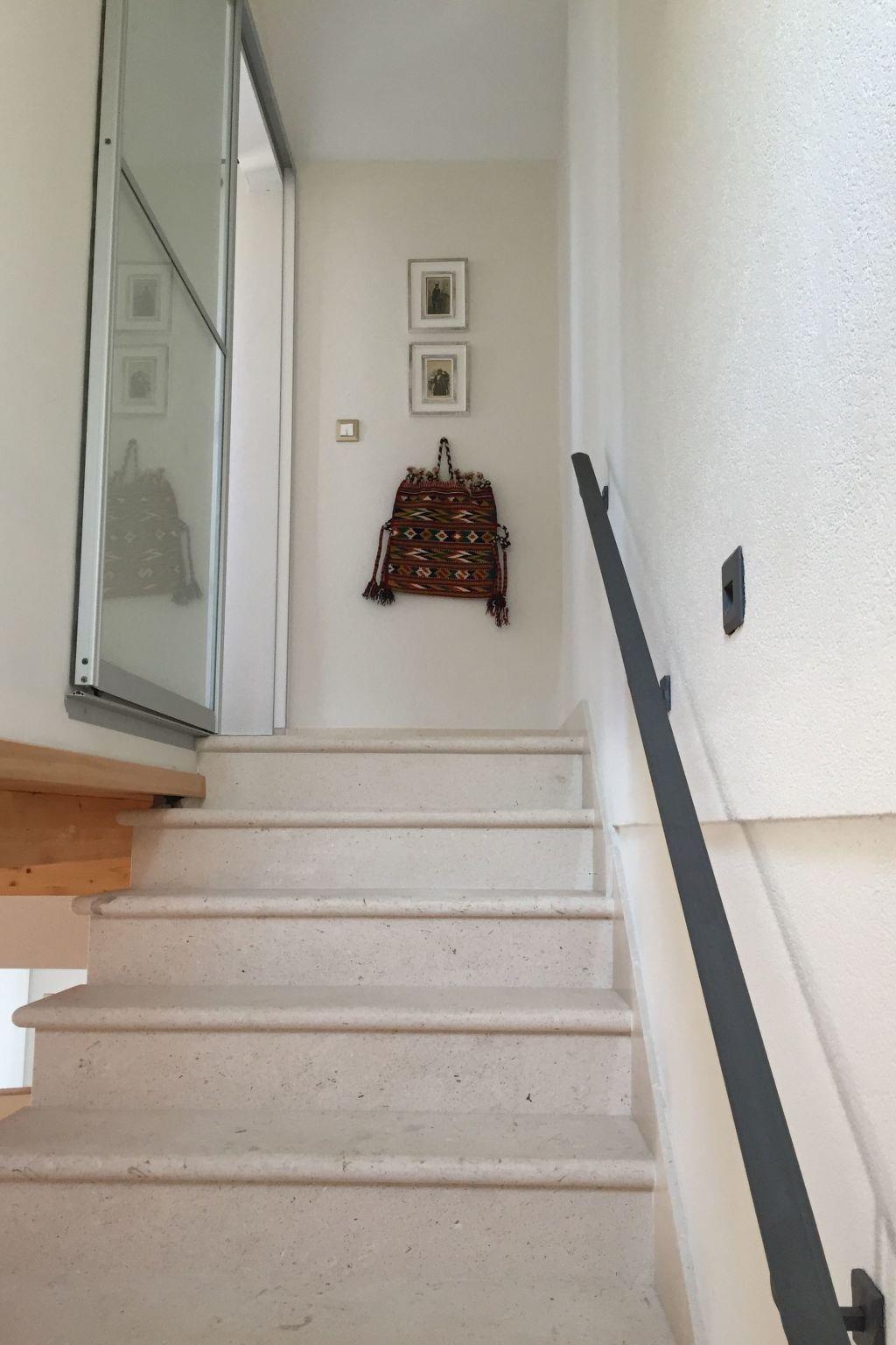 The house consists of two floors. The ground floor comprises a large living room with a double sofa bed and a fireplace, a fully-equipped kitchen with a dining space, and a toilet. This area opens to the outdoors and the beautiful garden. The first floor has a bedroom with a double bed 200cm wide and a balcony, as well as a bathroom with a shower and toilet. The house has air conditioning throughout and an Internet connection. There is also under-floor heating in the living room and in the kitchen, but which is not for use in summer, only during the cooler season.