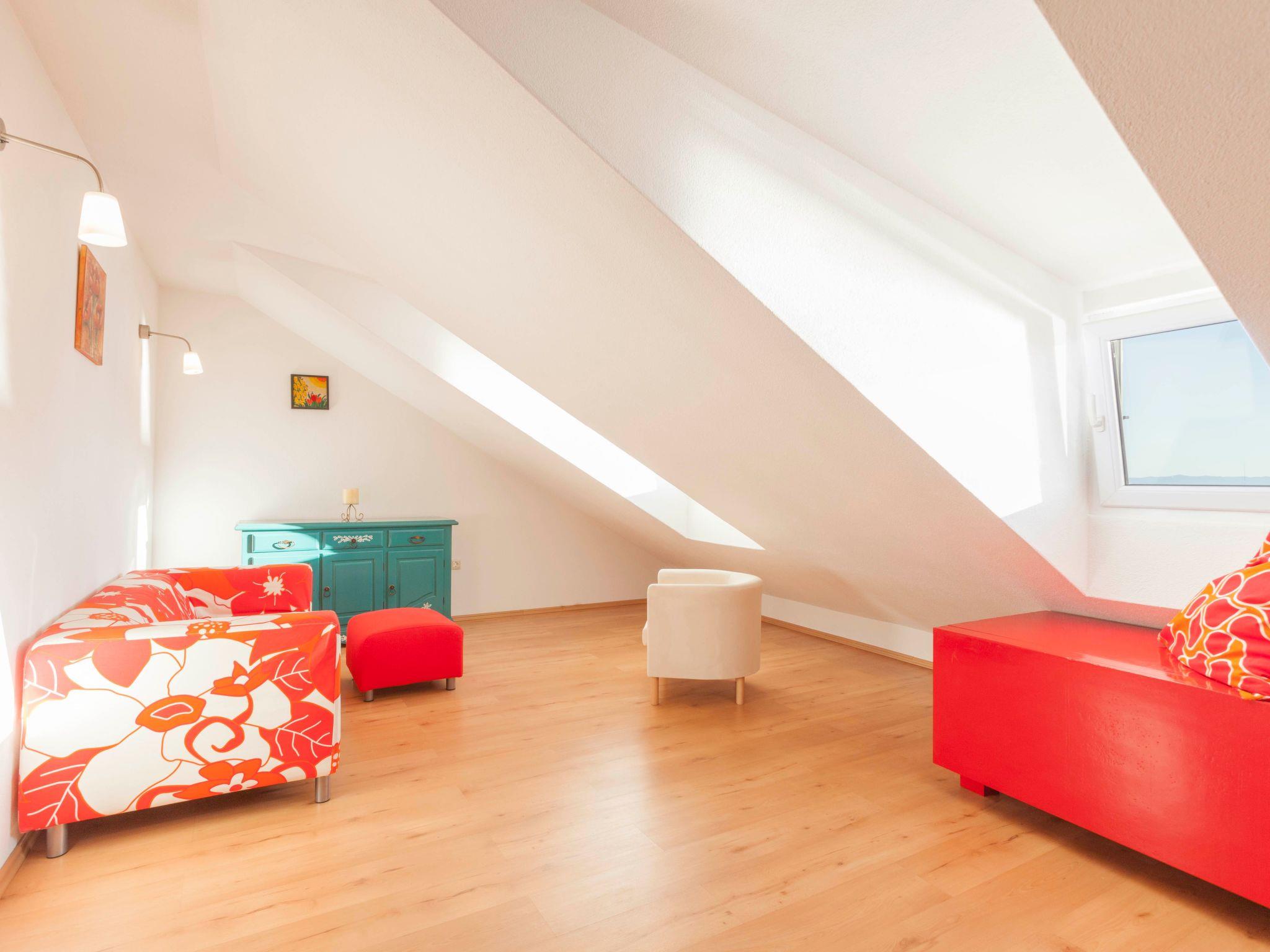 On the second level, in the attic, there is another bedroom with a double bed (160 x 200 cm). The bathroom on this level comes with a whirpool. In the living area there is a sofa, a chair and a single bed.