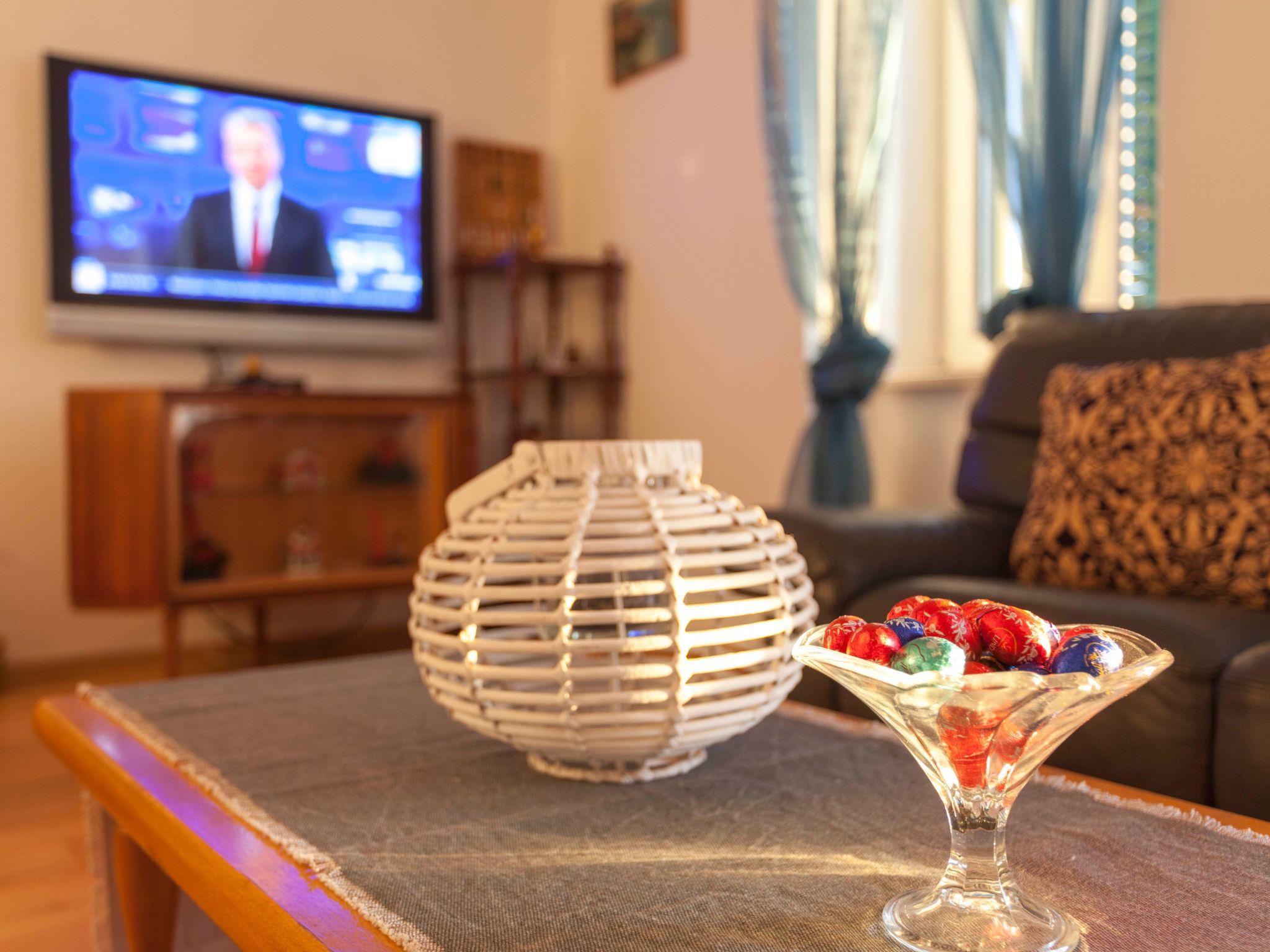 On the first level of the apartment (originally the third floor) is one bedroom with a double bed (160 x 200 cm), a wardrobe and a commode. There is a large living room with a TV, two sofas and a chair. The open plan kitchen is equipped with everything you need for a self-catering holiday, including Ceran cooktop, oven, dishwasher and refridgerator. There is a bathroom with a shower, wash basin and a toilet.
