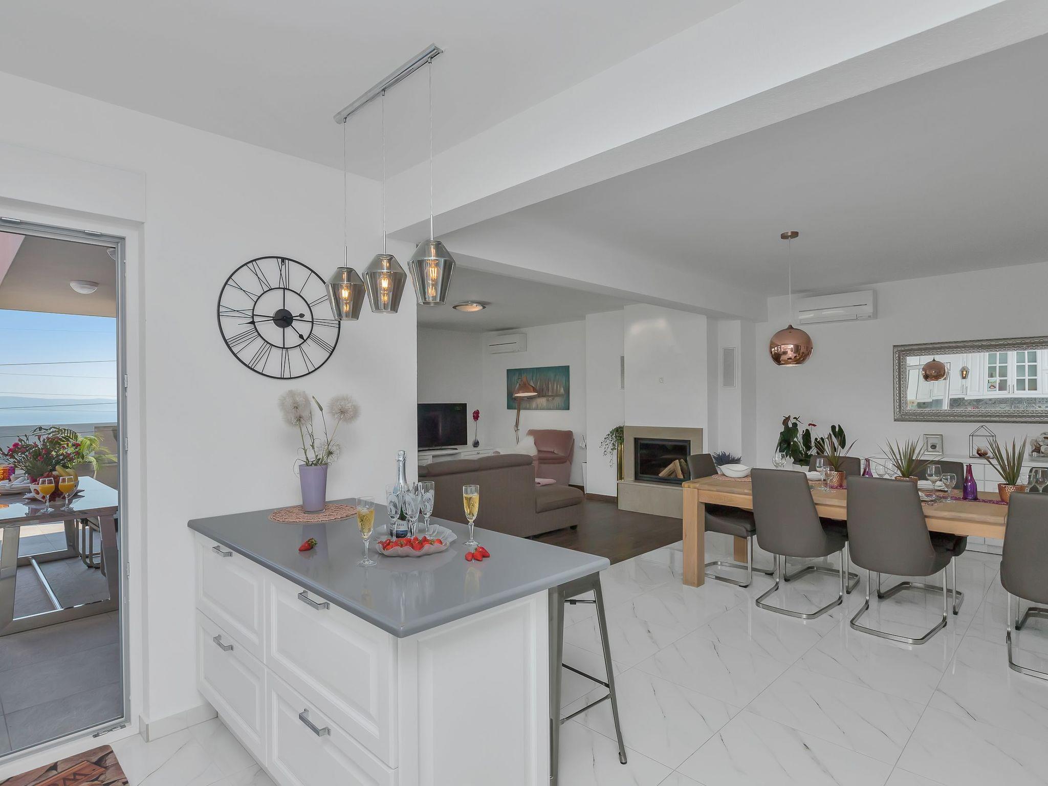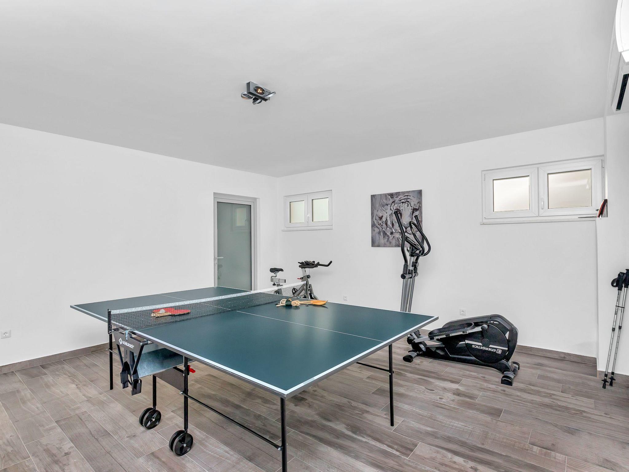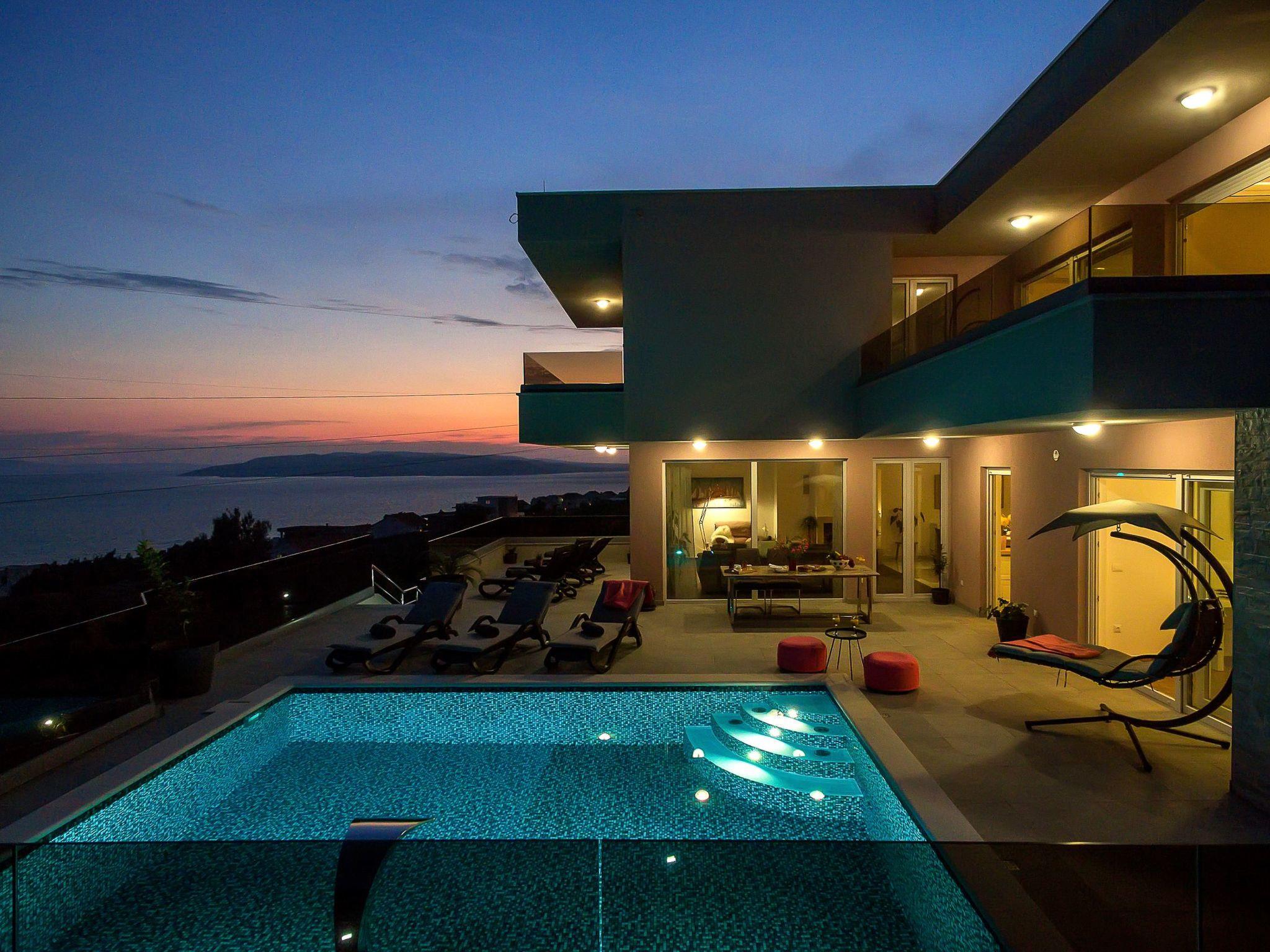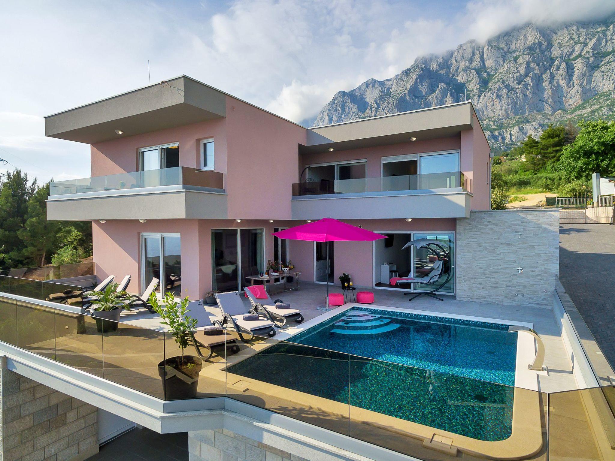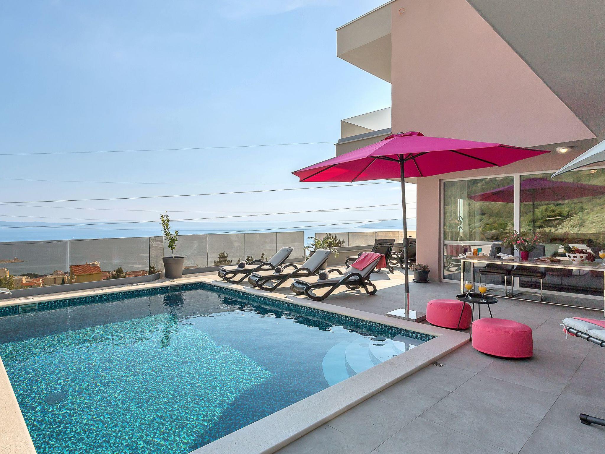 The new holiday home Villa Astra will delight every visitor. Quietly situated, surrounded by olive groves and pine trees on a hillside above the town of Makarska. The holiday home is very modern and brightly furnished. It has five double bedrooms, beds 180x200, six bathrooms with shower. On the ground floor is the spacious living area with open-plan kitchen and exit to the terrace with heated pool (5.00 x 6.00 x 1.5), sun loungers, outdoor shower and sea view. On the first floor there are the other four bedrooms, each with a double bed (180x200) and en-suite bathroom. In the basement you will find the fitness room with shower, table tennis table and an underground car park for 3 cars.