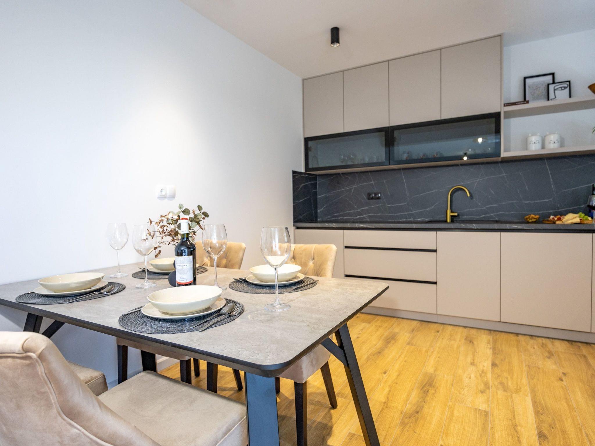 Upon entering this carefully designed flat, you are greeted by a spacious living room with tasteful furnishings and modern décor. The open concept seamlessly connects the living room with the fully equipped kitchen, creating a warm and inviting atmosphere for gatherings with family and friends. The kitchen boasts sleek countertops, modern appliances and ample storage space, providing everything you need to prepare delicious meals during your stay.
