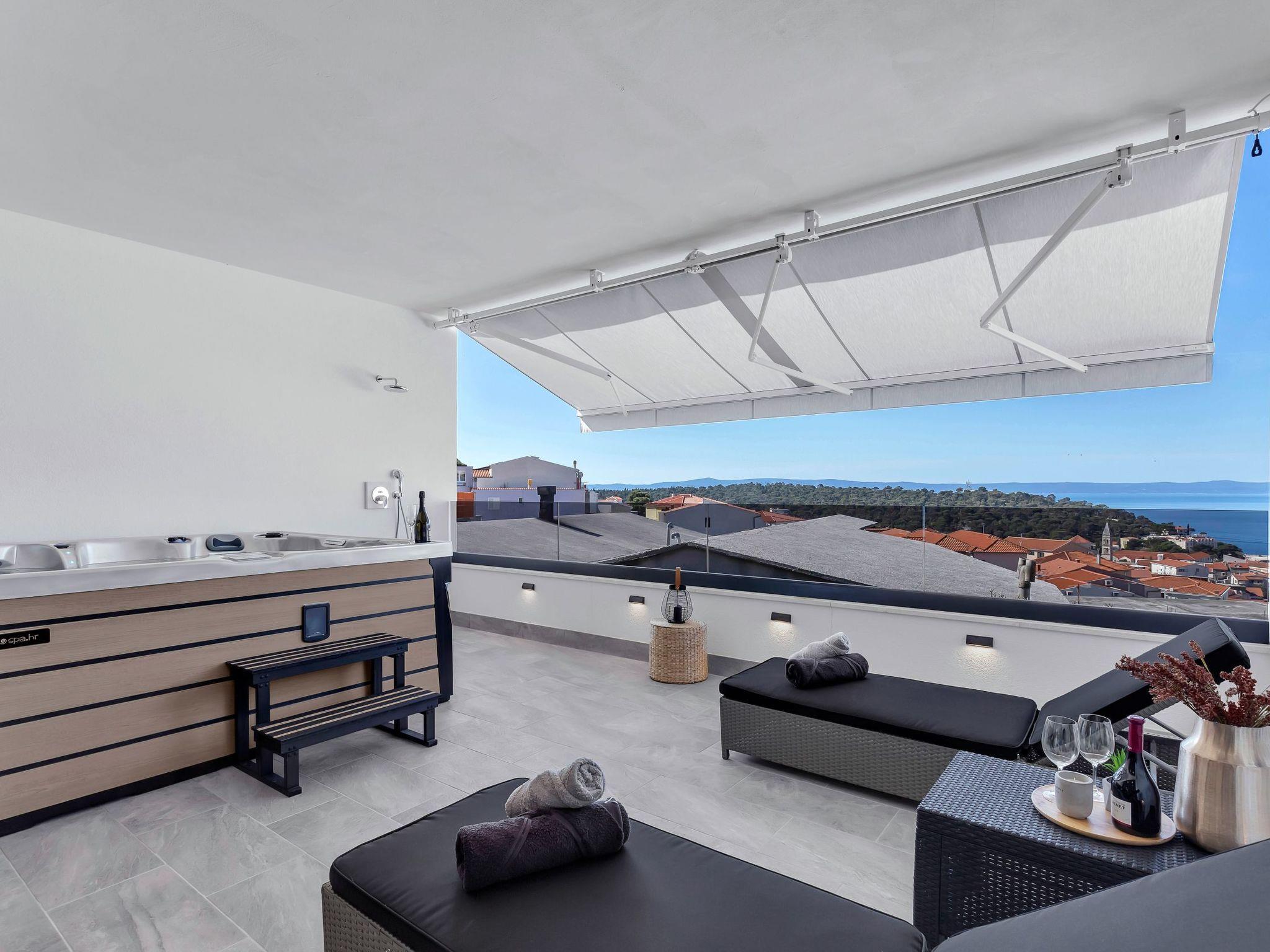 The outdoor space of this apartment is truly remarkable. Its large covered balcony is not just a place to enjoy superb views of the harbour and old city. It also boasts a beautiful jacuzzi, perfect for unwinding after a day of exploration, complemented by sun lounges and a shower for the ultimate relaxation experience. Despite the prohibition on grilling, the balcony serves as a luxurious extension of the living space, where guests can breathe in the Dalmatian air in total privacy.