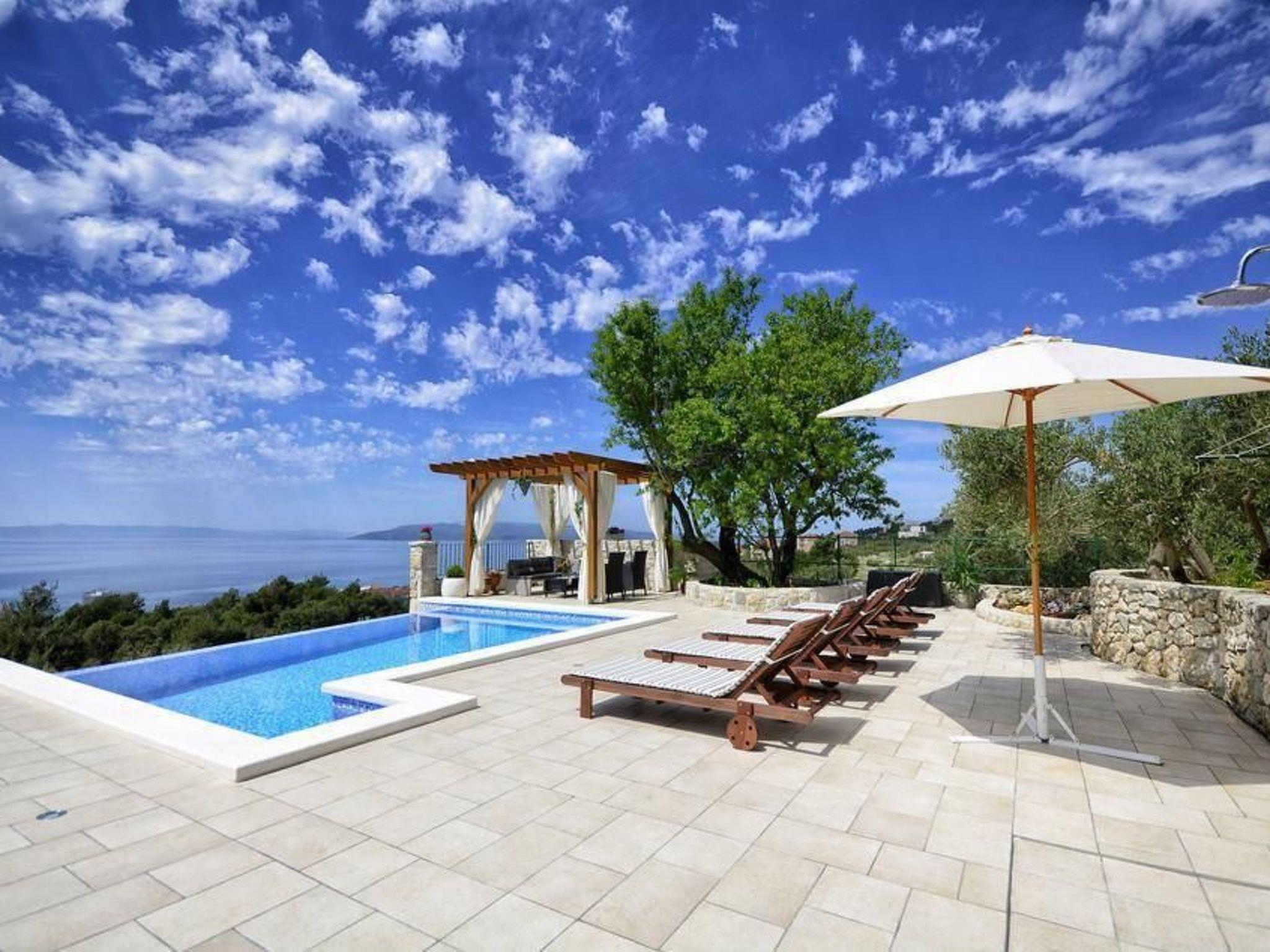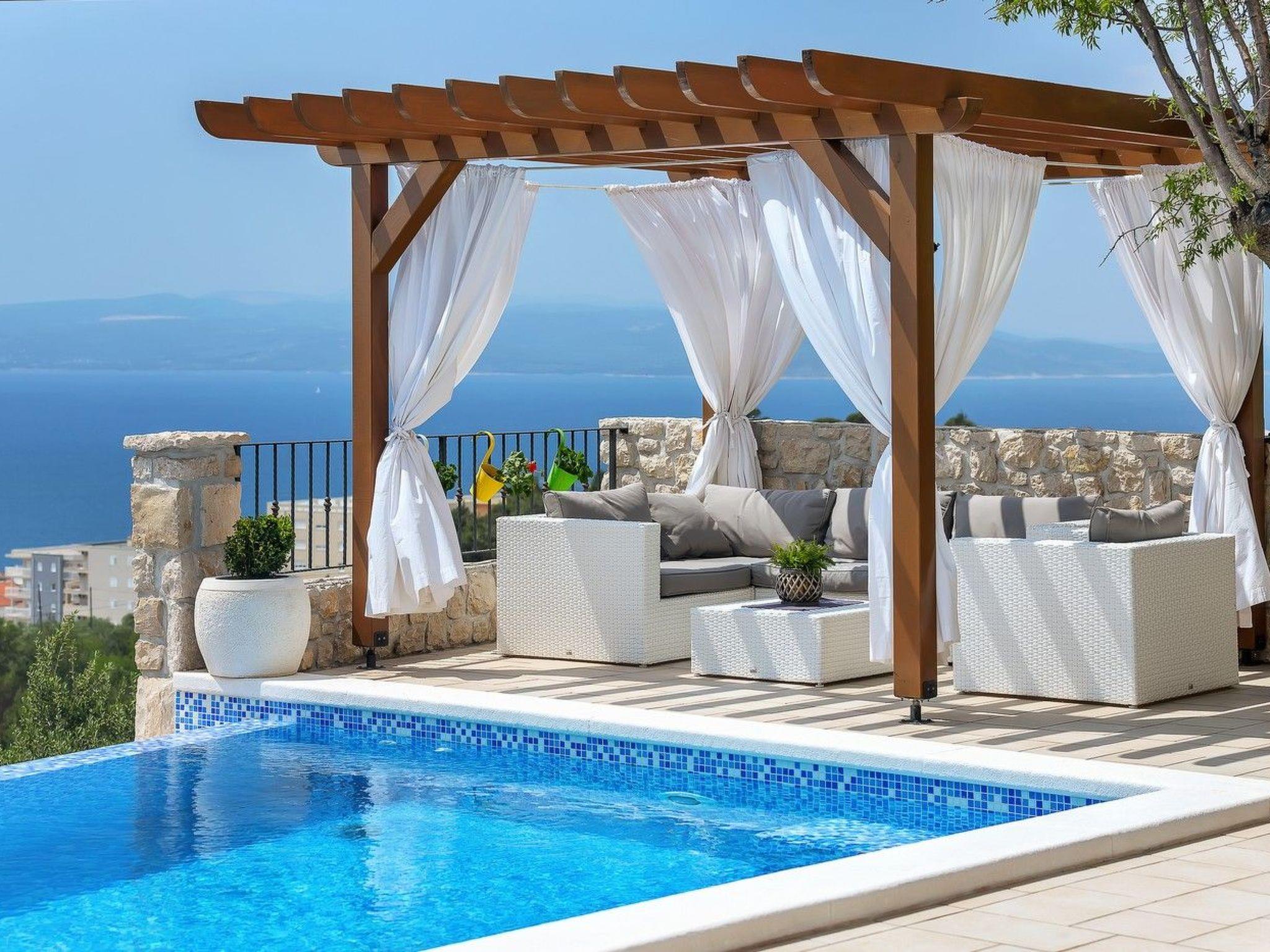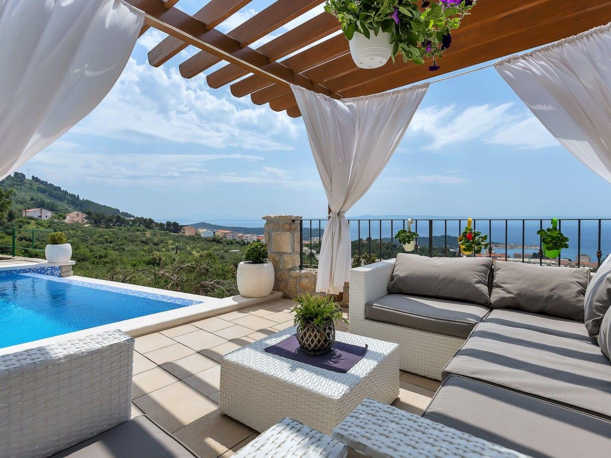 The holiday home Maria with heated pool is located in the hamlet of Puharici, above the town of Makarska. This detached holiday home has three floors and a plot of approx. 500 square metres. The house is surrounded by olive trees, has a well-kept garden with barbecue area and garden furniture. The overflow pool (heated) is about 25 square metres in size and from here you can enjoy the beautiful view of the sea and the town of Makarska. Sun loungers and an outdoor shower are also available.