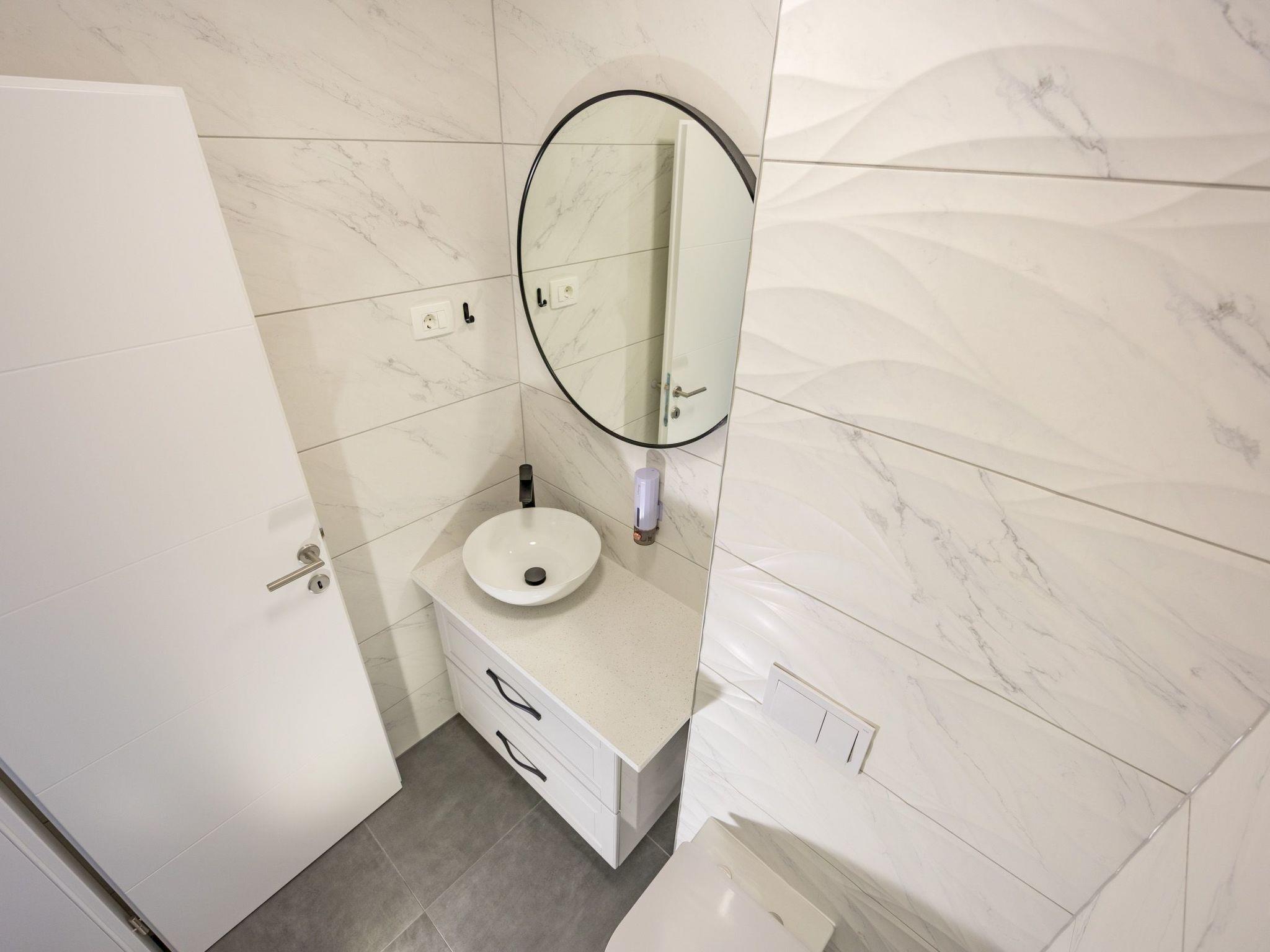 Upon entering this carefully designed flat, you are greeted by a spacious living room with tasteful furnishings and modern décor. The open concept seamlessly connects the living room with the fully equipped kitchen, creating a warm and inviting atmosphere for gatherings with family and friends. The kitchen boasts sleek countertops, modern appliances and ample storage space, providing everything you need to prepare delicious meals during your stay.