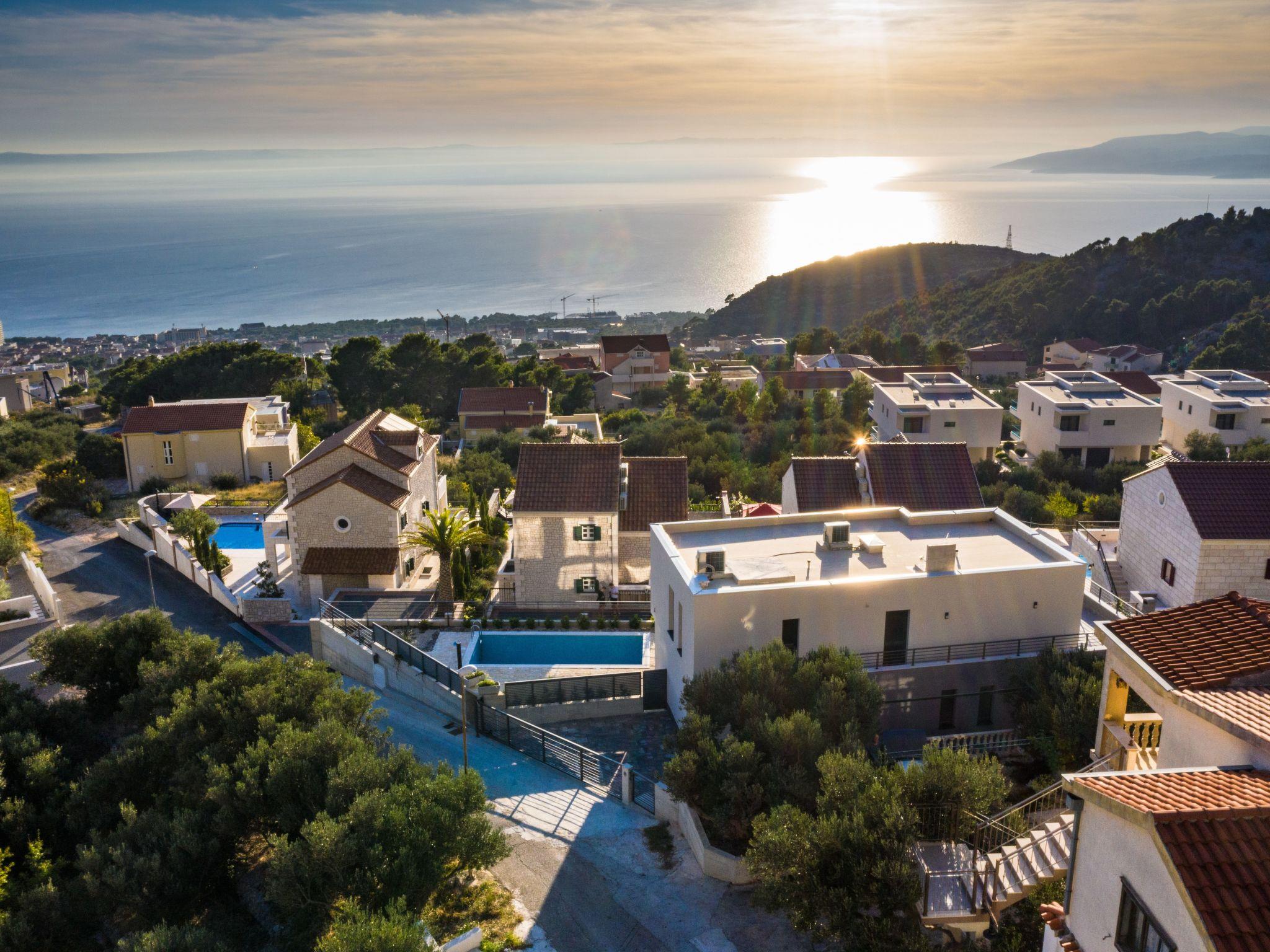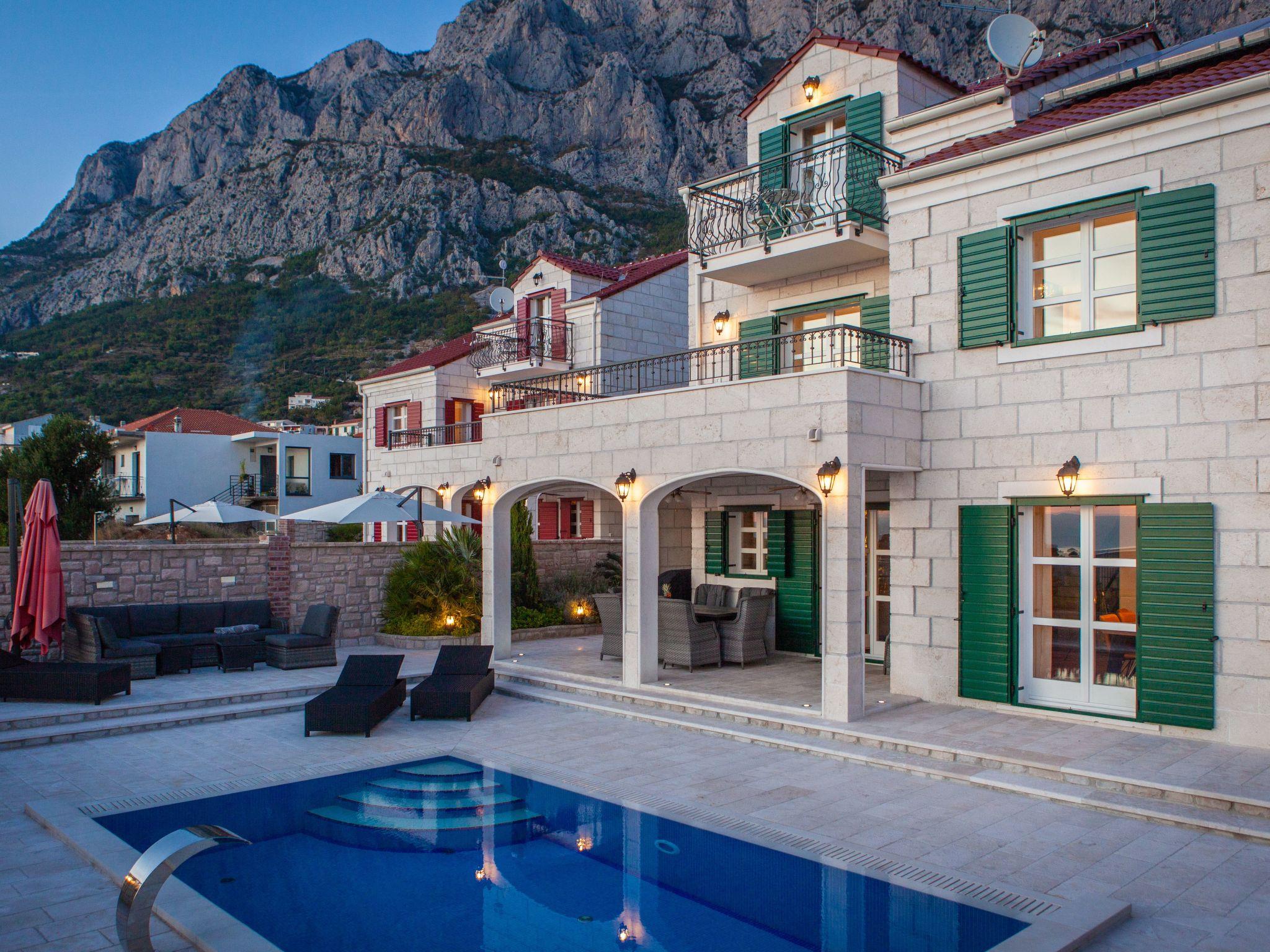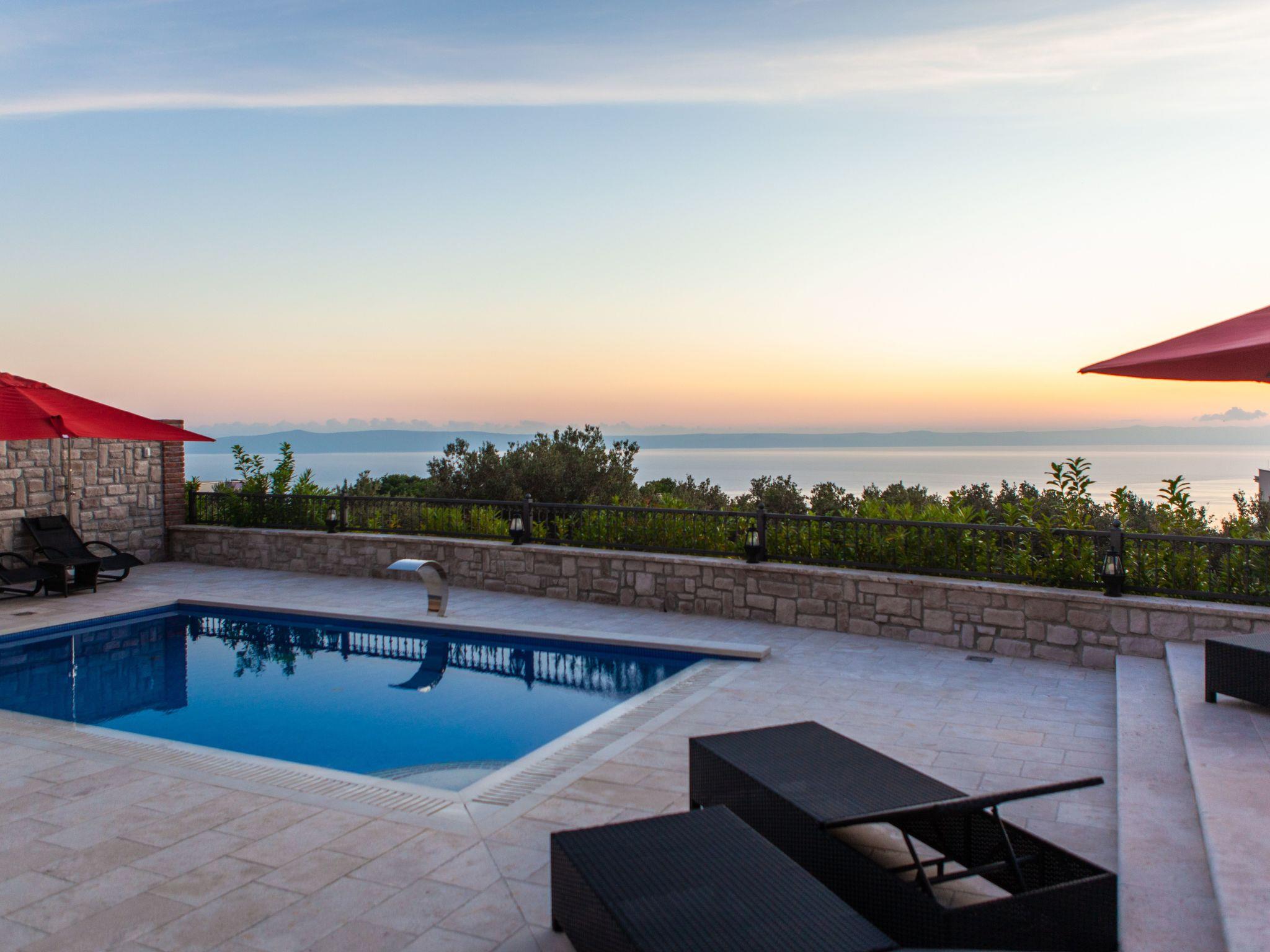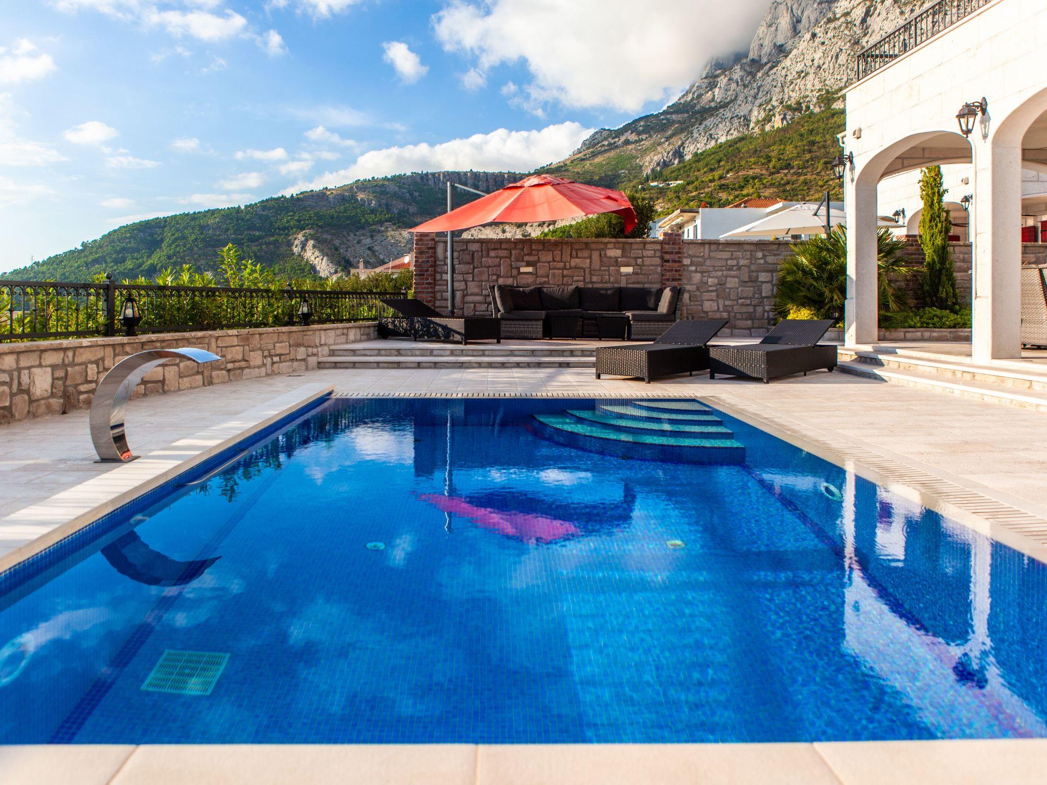Our stylish, individually furnished private villa with pool and several terraces offers everything you need for an elegant dream holiday in Croatia: Our resort is only a few minutes' drive (10 min.) from the picturesque old town of Makarska, idyllic beaches (3 min.) and the impressive Biokovo coastal mountain range. The hillside property with fantastic views of the Makarska Riviera - the Croatian seaside coast par excellence - is equally at home for those seeking peace and quiet, families and participants in yoga retreats, seminars, coaching sessions and corporate events. Discover the perfect Mediterranean hideaway to relax, be inspired and recharge your batteries. This villa offers a heated outdoor pool and free Wi-Fi. You can enjoy a breathtaking 180 degree view of the town of Makarska, the islands of Hvar and Brac, and Split. Behind the villa is the Biokovo mountain range, which rises to an altitude of 1762 metres.