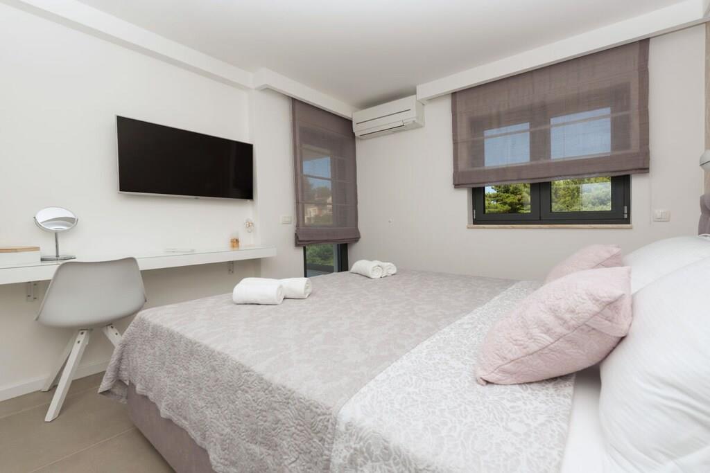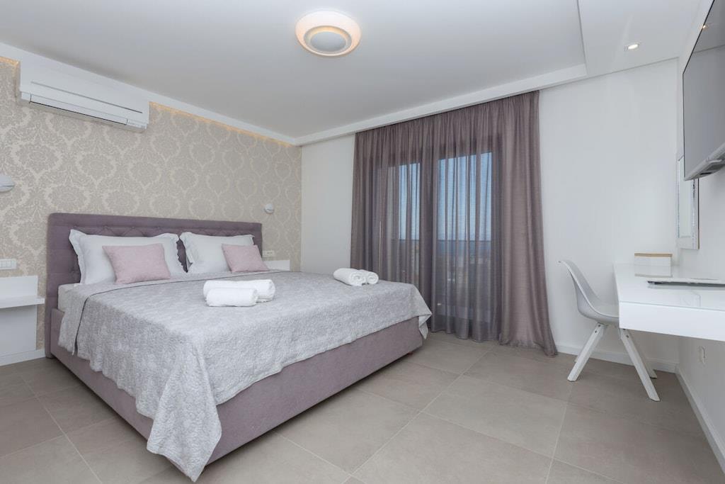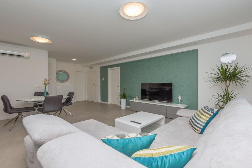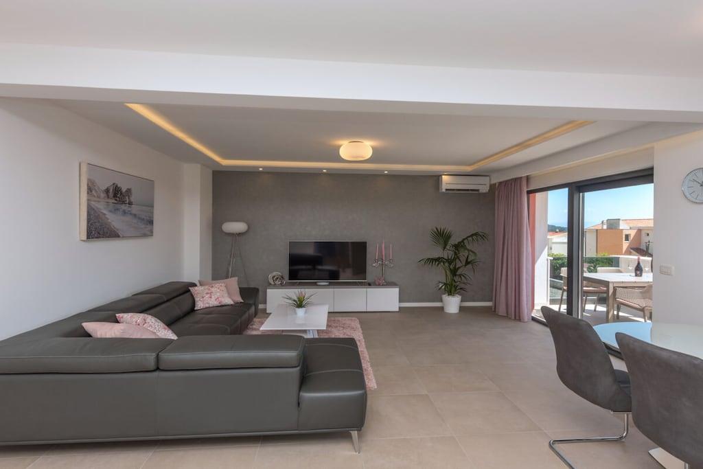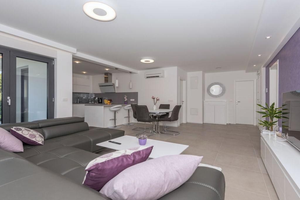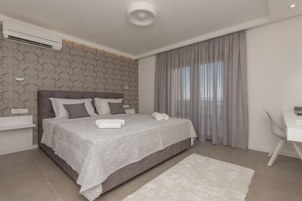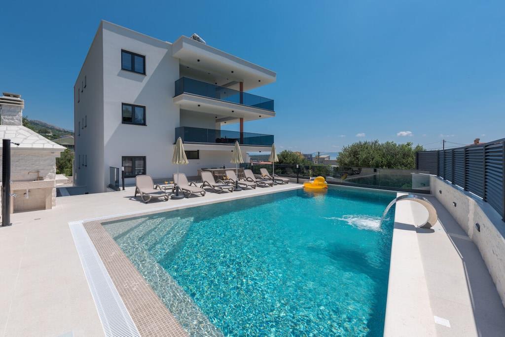 Det er mig en ære at præsentere jer for det nye feriehus på Makarska Riviera. Dette fritliggende feriehus, med sin fantastiske beliggenhed og smukke udsigt over Adriaterhavet, lover en uforglemmelig ferie. Det nybyggede, moderne feriehus udstråler boligkvalitet af høj kvalitet. Det nye, eksklusive ferievillakompleks skaber et hyggeligt og komfortabelt opholdsmiljø med et åbent opholdsområde og individuelt indrettede soveværelser. Feriehuset er opdelt i to separate lejligheder. Hver lejlighed er udstyret med to soveværelser, to badeværelser, et gæstetoilet, et køkken, en spiseplads og en opholdsstue. Det rummelige hus strækker sig over 500 m² med en generøs terrasse og en behagelig swimmingpool. Det tilbyder også et fitnesscenter, sauna og wellness-område i kælderen for optimal afslapning. Beliggenheden giver muligheder for aktive ferier og vandreture gennem det smukke landskab i Biokovo-bjergene og de omkringliggende små byer, samt muligheden for at møde de venlige lokale, der med glæde byder jer velkommen til deres taverna.