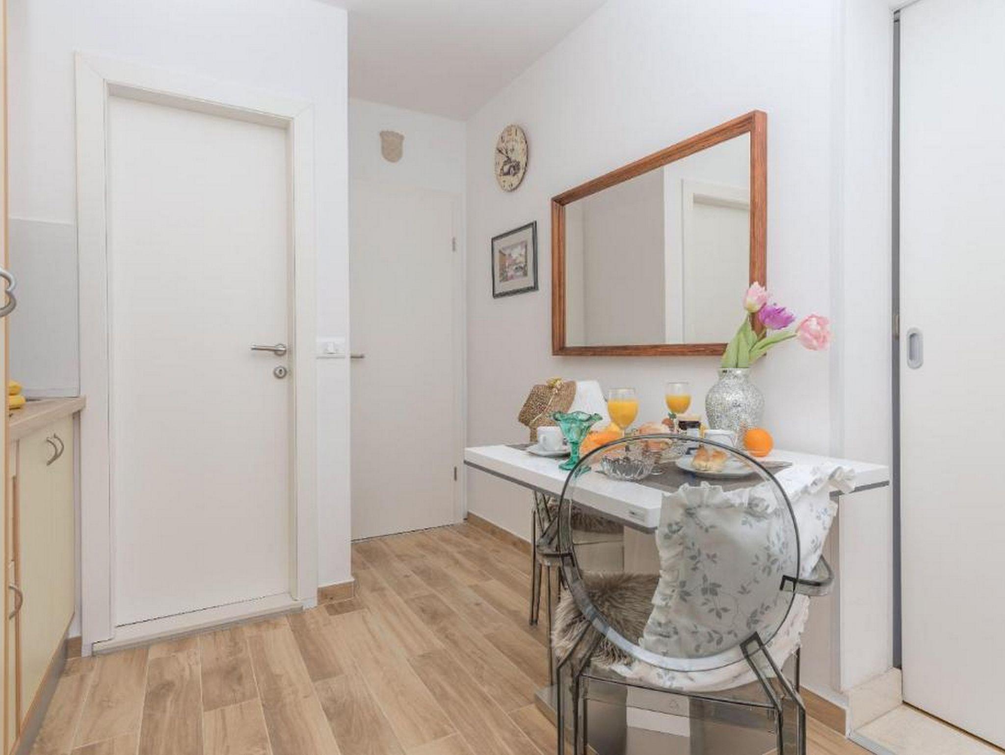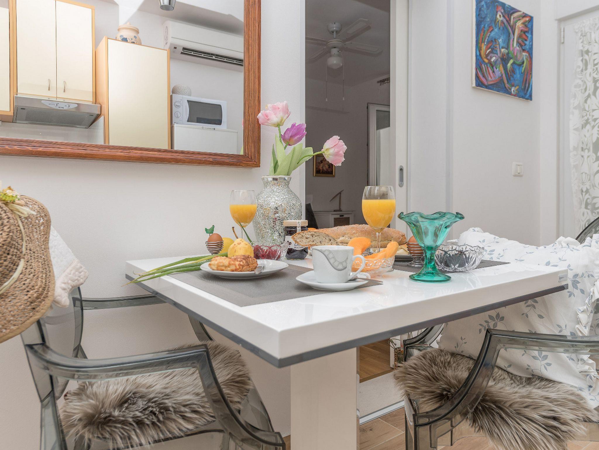 Ferienwohnung bietet Platz für 2 Gäste. Die Betten sind in Schlafzimmern, die es 1 gibt, innerhalb einer Gesamtfläche von 29m2, angeordnet. Die Gäste haben einen eigenen Balkon zur Verfügung, auf der sie in warmen Sommernächten genießen können. Das Apartment bietet Meerblick. IM PREIS INBEGRIFFEN: Kurtaxe, Endreinigung, Klimatisierung, Parkplatz, Internet, Bügeleisen, Bügelbrett, Föhn. VERBINDLICHE ZUSÄTZLICHE KOSTEN: Aufzahlung für Kurzaufenthalte (prozentualer Zuschlag pro Nächtigungsanzahl: 30% - 1, 20% - 2, 10% - 3). Die Verfügbarkeit zusätzlicher Dienstleistungen in Ihrem reservierten Termin und die Preise derselben (falls nicht aufgeführt) müssen im Voraus überprüft werden. Zusätzliche Dienstleistungen die in der Zahlungsaufforderung nicht aufgeführt sind werden direkt beim Vermieter bezahlt, angenommen der Gast nutzt auch diese.
