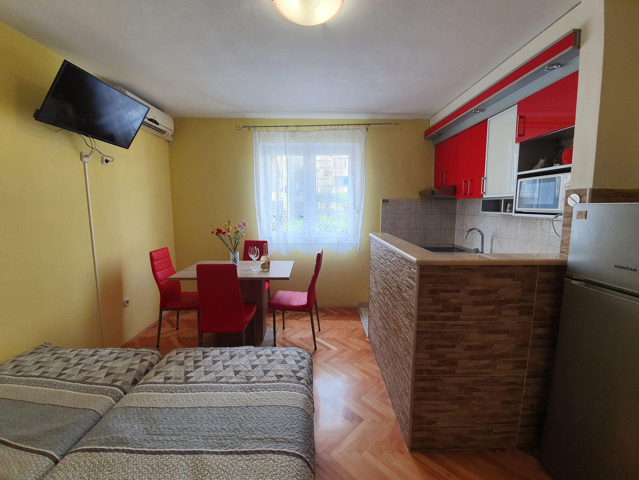 Ferienwohnung bietet Platz für 4 Gäste. Die Betten sind in Schlafzimmern, die es 1 gibt, und in Wohnzimmer, innerhalb einer Gesamtfläche von 36m2, angeordnet. Die Gäste haben einen eigenen Balkon zur Verfügung, auf der sie in warmen Sommernächten genießen können. Es ist erlaubt, Speisen auf dem Gemeinschafts-Grill vorzubereiten. In der Unterkunftseinheit besteht die Möglichkeit des Mitbringens von Haustieren, und die Dienstleistung ist im Preis der Unterkunft enthalten. IM PREIS INBEGRIFFEN: Kurtaxe, Endreinigung, Klimatisierung, Parkplatz, Internet, Haustiere, Bügeleisen, Bügelbrett, Föhn, tragbarer Grill. Die Verfügbarkeit zusätzlicher Dienstleistungen in Ihrem reservierten Termin und die Preise derselben (falls nicht aufgeführt) müssen im Voraus überprüft werden. Zusätzliche Dienstleistungen die in der Zahlungsaufforderung nicht aufgeführt sind werden direkt beim Vermieter bezahlt, angenommen der Gast nutzt auch diese. Ermäßigung auf den Grundpreis: Gratistag 14=13 (bei einem Aufenthalt von 14 Tagen oder mehr erhalten Sie einen Gratistag für den Aufenthalt bis 31.12.26).