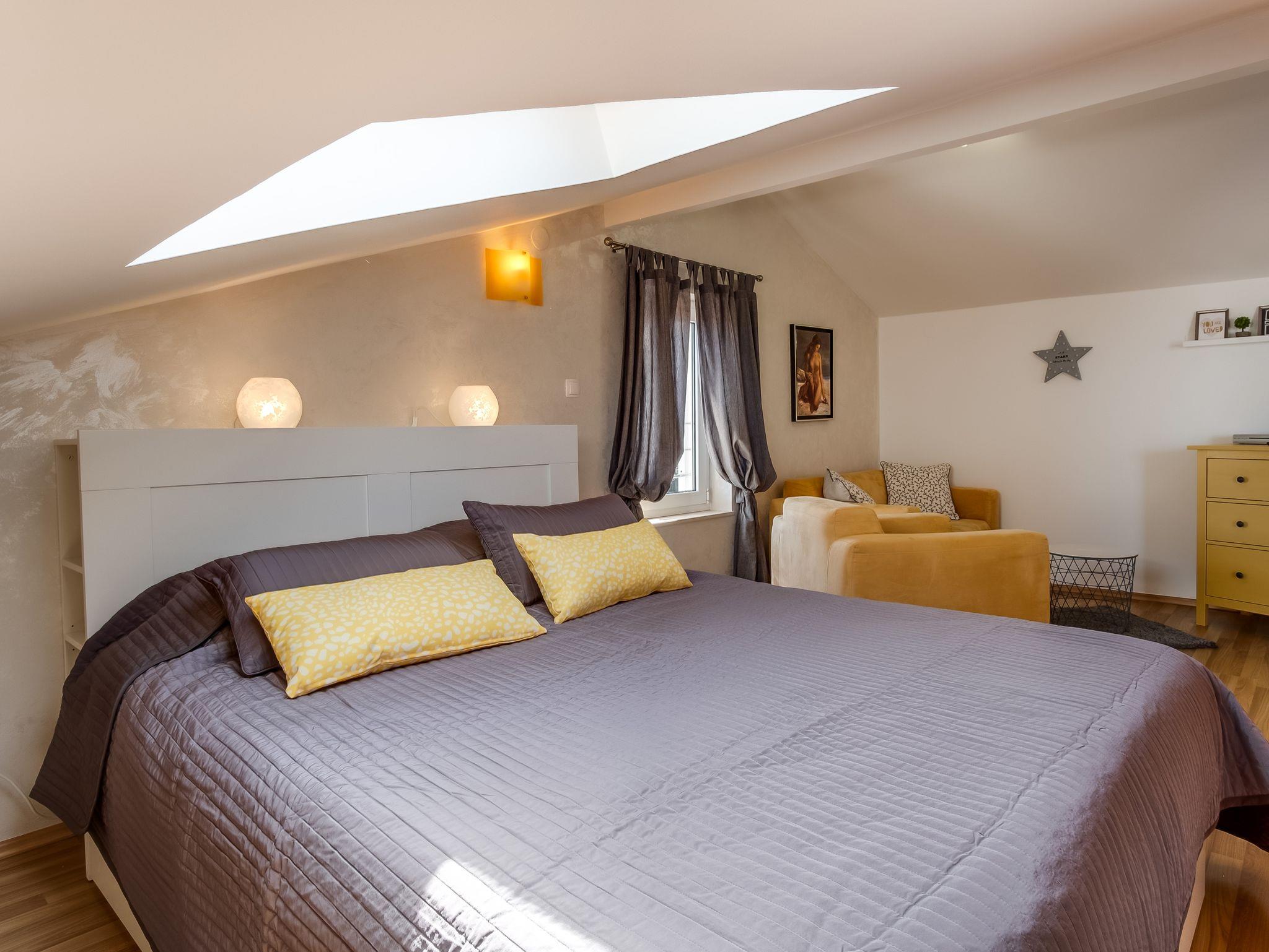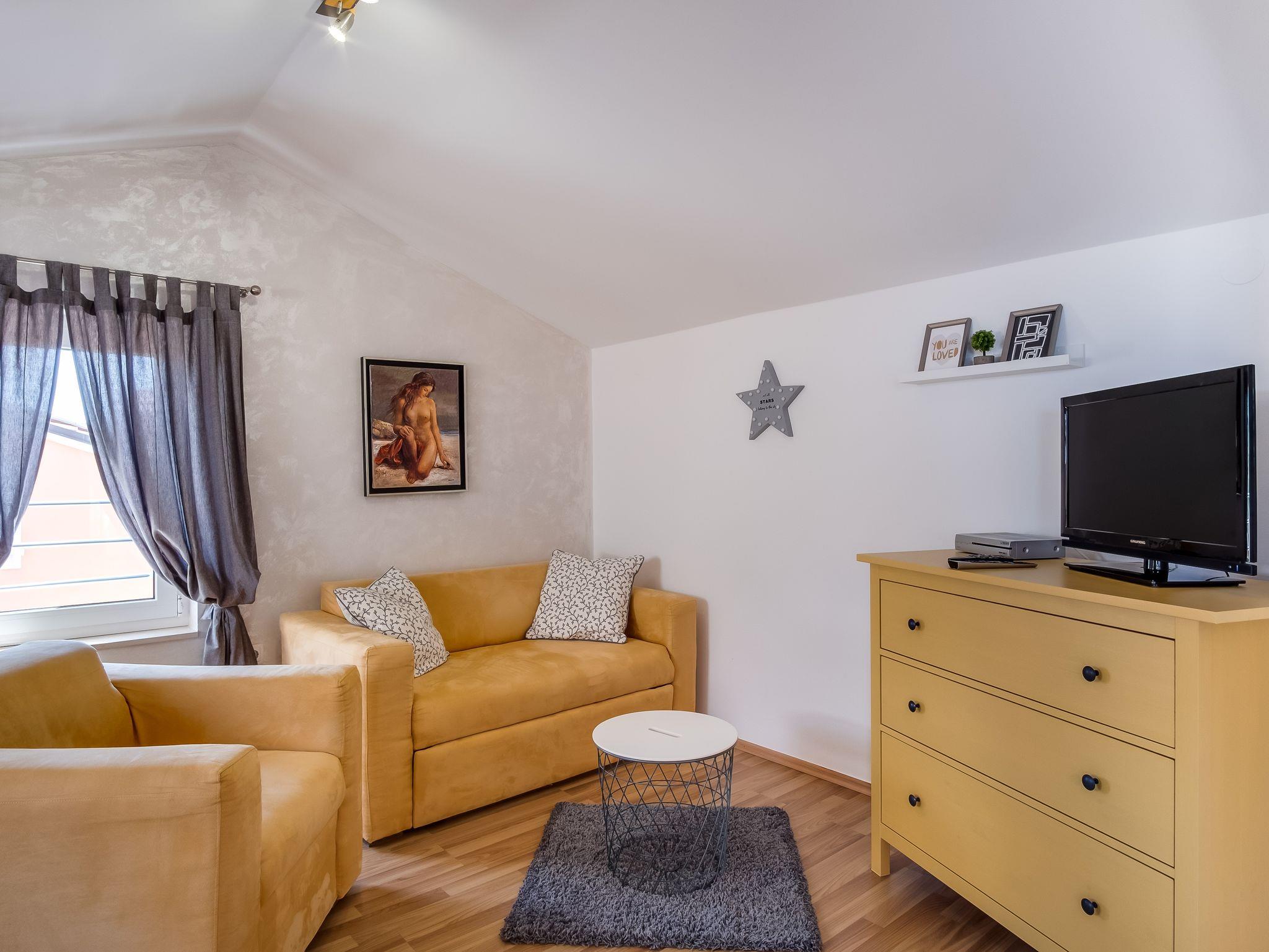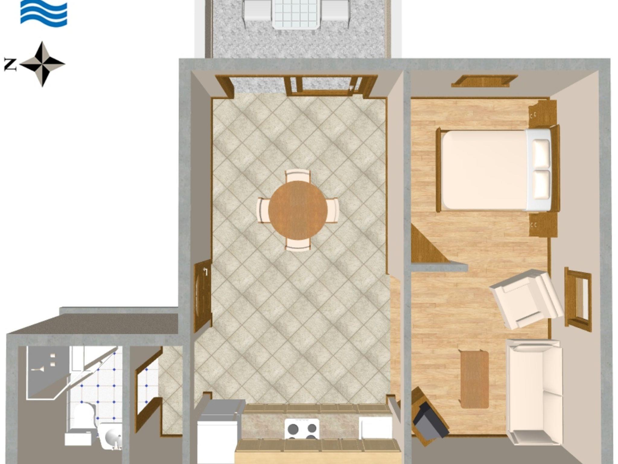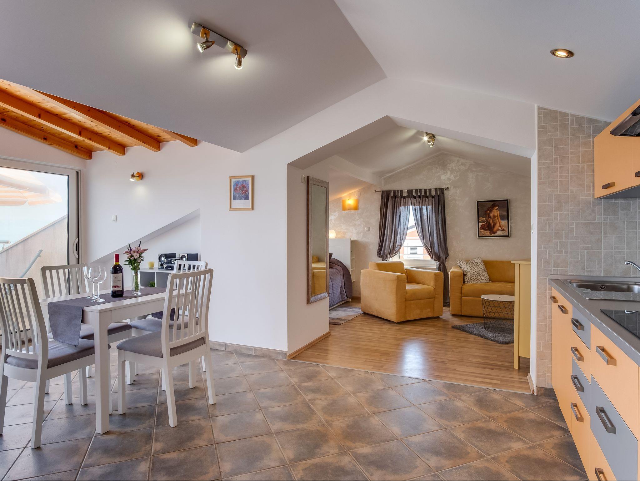 Studio bietet Platz für 2 Gäste. Die Betten sind in Schlafzimmern, die es 1 gibt, innerhalb einer Gesamtfläche von 42m2, angeordnet. Die Gäste haben eine eigene Terrasse zur Verfügung, auf der sie in warmen Sommernächten genießen können. Das Studio-Apartment bietet Meerblick. Es ist erlaubt, Speisen auf dem Gemeinschafts-Grill vorzubereiten. IM PREIS INBEGRIFFEN: Kurtaxe, Endreinigung, Klimatisierung, Parkplatz, Internet, Wäschewaschen, Bügeleisen, Bügelbrett, Föhn. VERBINDLICHE ZUSÄTZLICHE KOSTEN: Aufzahlung für Kurzaufenthalte (prozentualer Zuschlag pro Nächtigungsanzahl: 30% - 1, 20% - 2, 10% - 3). UNVERBINDLICHE ZUSÄTZLICHE KOSTEN: Frühstück (7,00 €, 50% Nachlass für Kinder zwischen 4 und 12 Jahren, Kinder bis 4 Jahre sind frei.), Fahrrad (7,00 € täglich (pro Stück)). Die Verfügbarkeit zusätzlicher Dienstleistungen in Ihrem reservierten Termin und die Preise derselben (falls nicht aufgeführt) müssen im Voraus überprüft werden. Zusätzliche Dienstleistungen die in der Zahlungsaufforderung nicht aufgeführt sind werden direkt beim Vermieter bezahlt, angenommen der Gast nutzt auch diese. Ermäßigung auf den Grundpreis: Gratistag 14=13 (bei einem Aufenthalt von 14 Tagen oder mehr erhalten Sie einen Gratistag für den Aufenthalt bis 31.12.26).