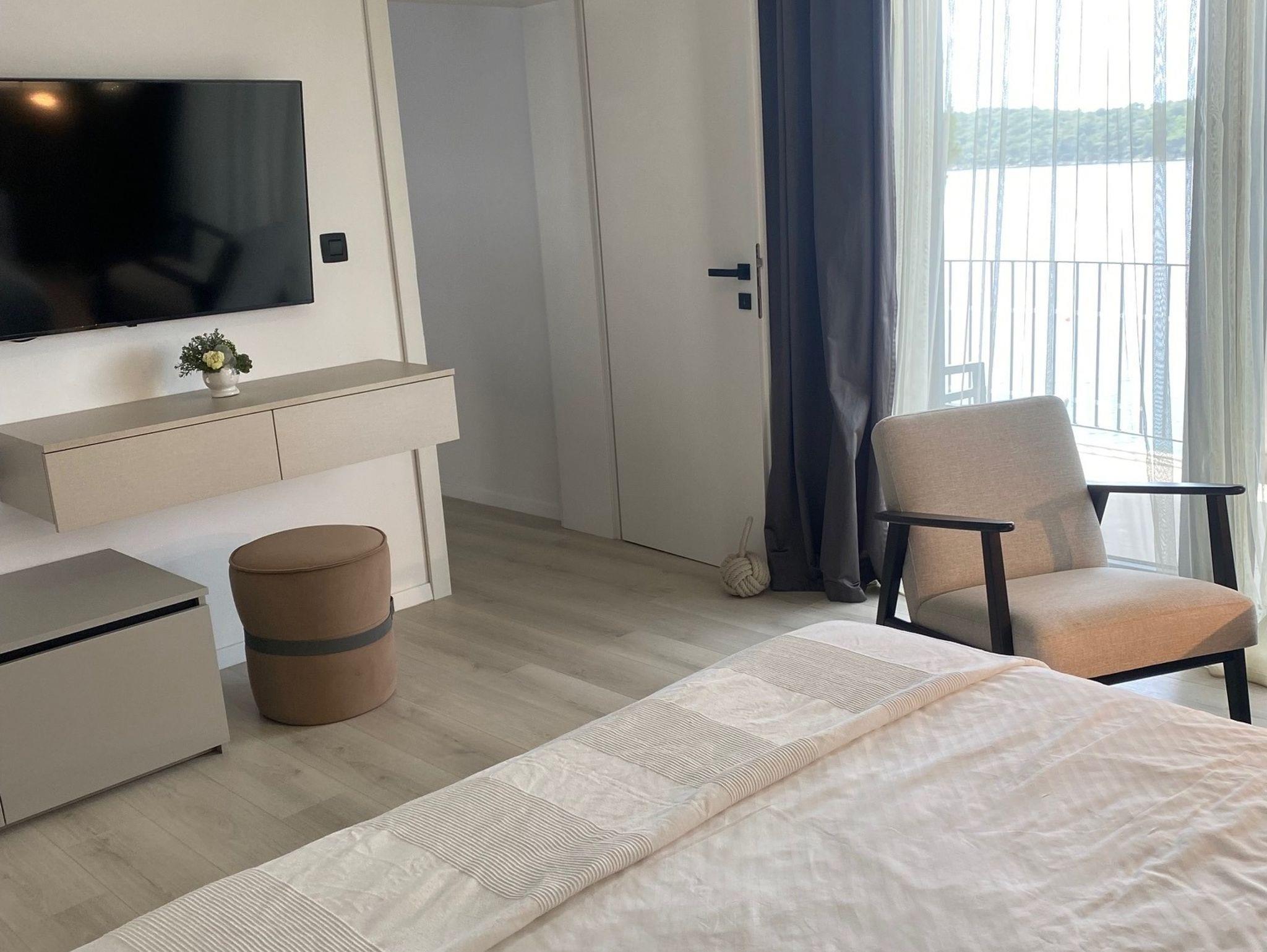 Ferienwohnung bietet Platz für 3 Gäste. Die Betten sind in Schlafzimmern, die es 1 gibt, und in Wohnzimmer, innerhalb einer Gesamtfläche von 37m2, angeordnet. Die Gäste haben eine eigene Terrasse zur Verfügung, auf der sie in warmen Sommernächten genießen können. Das Apartment bietet Meerblick. Es ist erlaubt, Speisen auf dem Gemeinschafts-Grill vorzubereiten. IM PREIS INBEGRIFFEN: Kurtaxe, Endreinigung, Klimatisierung, Parkplatz, Internet, Kinderbett, Bügeleisen, Bügelbrett, Föhn. VERBINDLICHE ZUSÄTZLICHE KOSTEN: Aufzahlung für Kurzaufenthalte (prozentualer Zuschlag pro Nächtigungsanzahl: 30% - 1, 20% - 2, 10% - 3). UNVERBINDLICHE ZUSÄTZLICHE KOSTEN: Bootsanlegeplatz (10,00 € pro Nacht). Die Verfügbarkeit zusätzlicher Dienstleistungen in Ihrem reservierten Termin und die Preise derselben (falls nicht aufgeführt) müssen im Voraus überprüft werden. Zusätzliche Dienstleistungen die in der Zahlungsaufforderung nicht aufgeführt sind werden direkt beim Vermieter bezahlt, angenommen der Gast nutzt auch diese.
