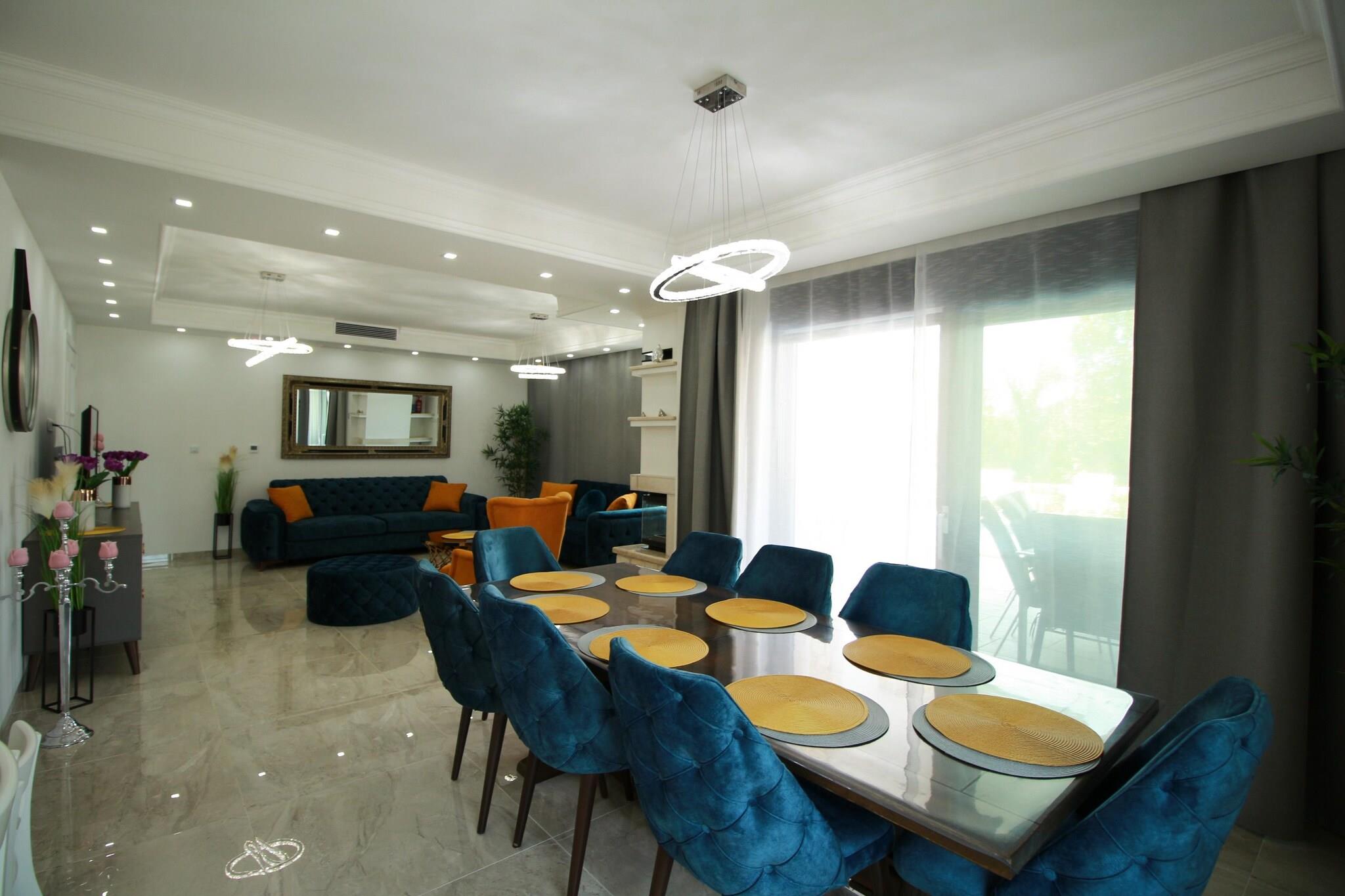 Stueetage: (Stue(Fjernsyn(fladskærm, parabol), pejs, sofahjørne), Køkken(spisebord, brødrister, komfur, kaffemaskine, ovn, mikrobølgeovn, opvaskemaskine , køle-fryseskab), soveværelse(dobbeltseng, Fjernsyn(fladskærm, parabol)), badeværelse(bruser, håndvask, toilet), terrasse(privat)) På 1. etage: (Soveværelse med badeværelse(dobbeltseng, Fjernsyn(fladskærm, parabol), bruser, håndvask, toilet), Soveværelse med badeværelse(dobbeltseng, Fjernsyn(fladskærm, parabol), bruser, håndvask, toilet), Soveværelse med badeværelse(dobbeltseng, Fjernsyn(fladskærm, parabol), bruser, håndvask, toilet), balkon) Kælderetage: (Soveværelse med badeværelse(dobbeltseng, bruser, håndvask, toilet), opholdsrum(Fjernsyn(fladskærm), sofahjørne, bordfodbold, biljard)) bruser, vaskemaskine, klimaanlæg, terrasse(privat), have(privat), havemøbler, solstole, grill, parkering, Parasol, swimmingpool(privat), strygebræt, strygejern, loungemøbler