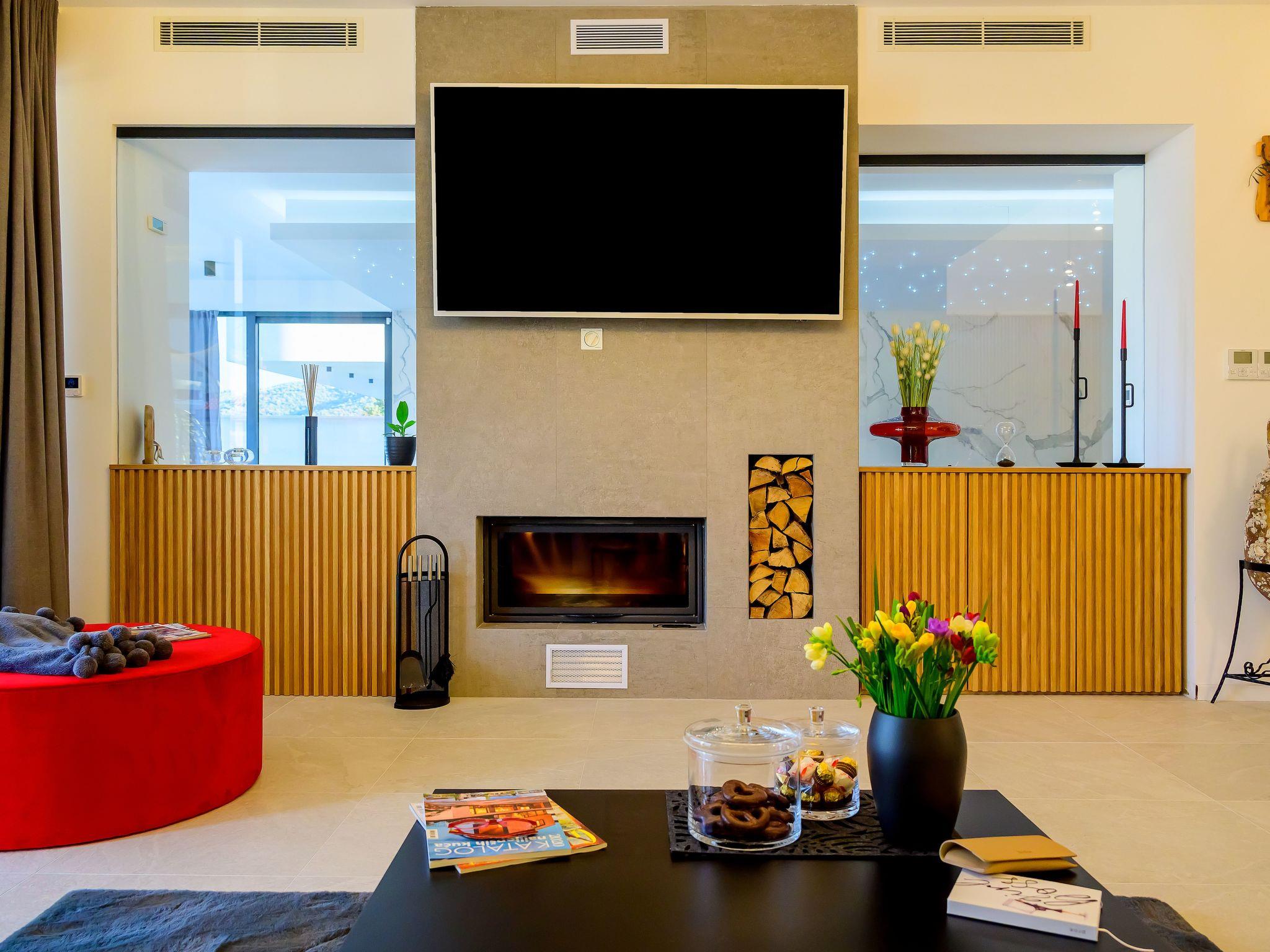 Outdoor dining room area features a stone barbecue grill and is ideal for morning coffee or for dinner under the stars. Living room is connected to the terrace by large glass walls, so you can enjoy the views while resting on our custom made, comfortable sofas. A top-notch kitchen connects to the dining area with an indoor dining room table.