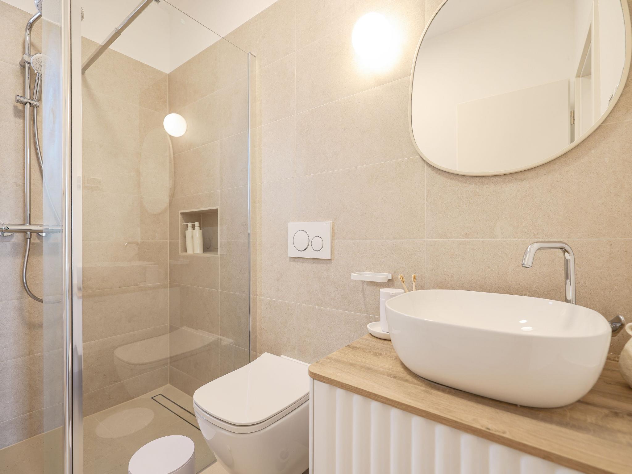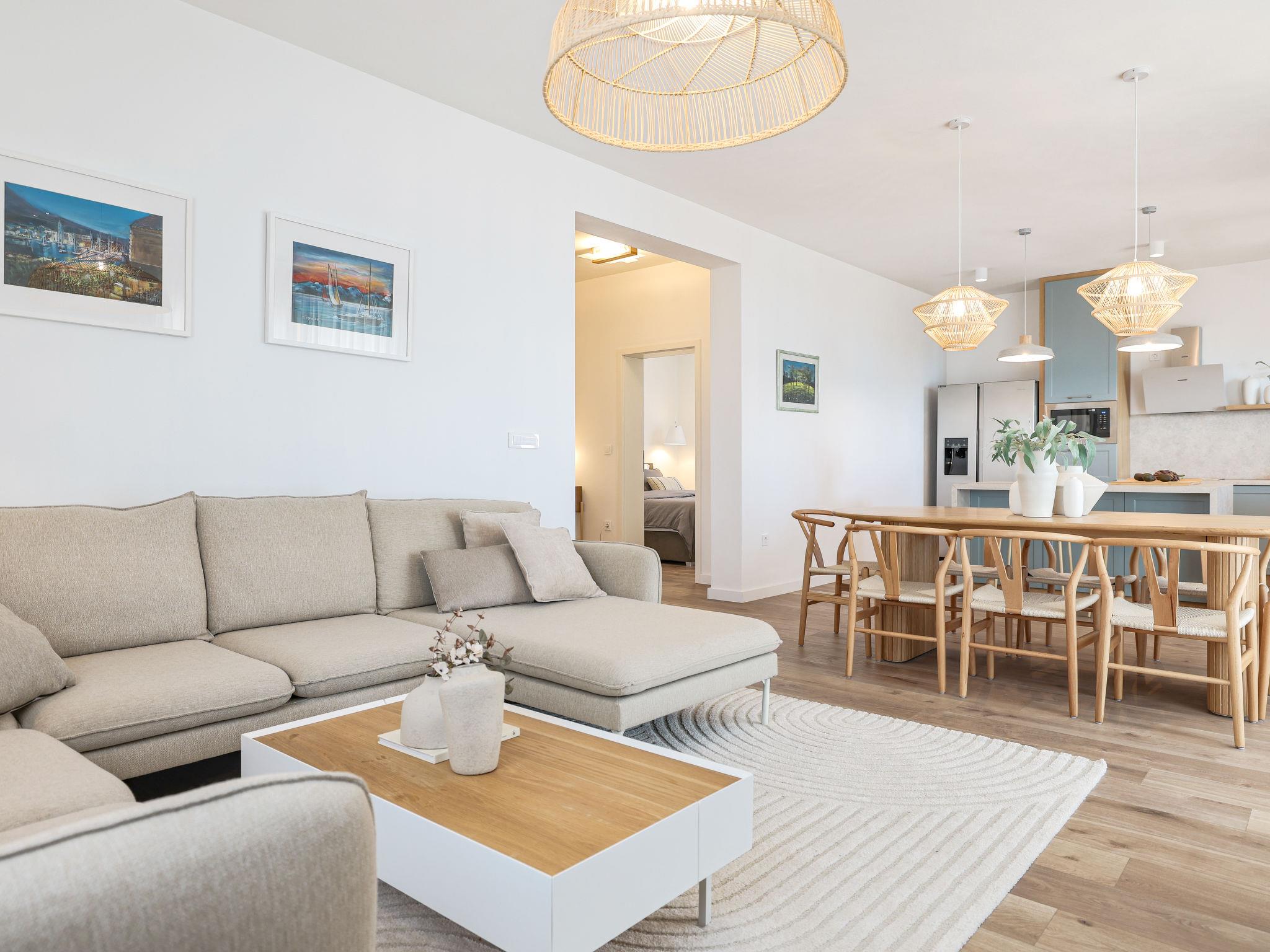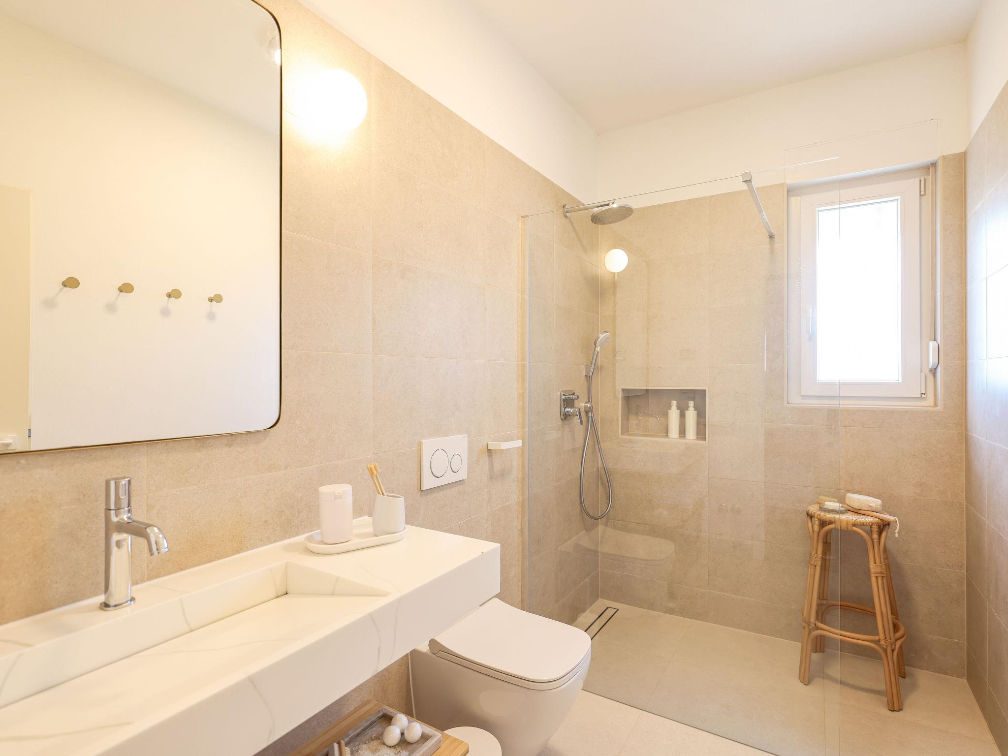 8-room villa 230 m2 on 2 levels. In 2024, very modern furnishings: large, interconnecting room with satellite TV. Exit to the terrace, to the swimming pool. 1 room with 1 french bed (160 cm, length 200 cm), satellite TV. Exit to the garden. 1 room with 1 sofabed (90 cm, length 200 cm). Shower/WC, sep. WC. Upper floor: 2 rooms, each room with 1 french bed (180 cm, length 200 cm), satellite TV. Exit to the balcony. 1 room with 2 beds (90 cm, length 200 cm), air conditioning. Exit to the balcony. Open kitchen (oven, dishwasher, 4 induction hot plates, kettle, freezer) with air conditioning. Exit to the terrace. 2 showers/WC. Floor heating. Heating available only from 01.10. to 01.05. Terrace 24 m2, roofed terrace 24 m2, roofed. Terrace furniture, deck chairs. Panoramic view of the sea. Facilities: iron, hair dryer. Internet (WiFi, free). Please note: suitable for families. Non-smoking house. Fire extinguisher.