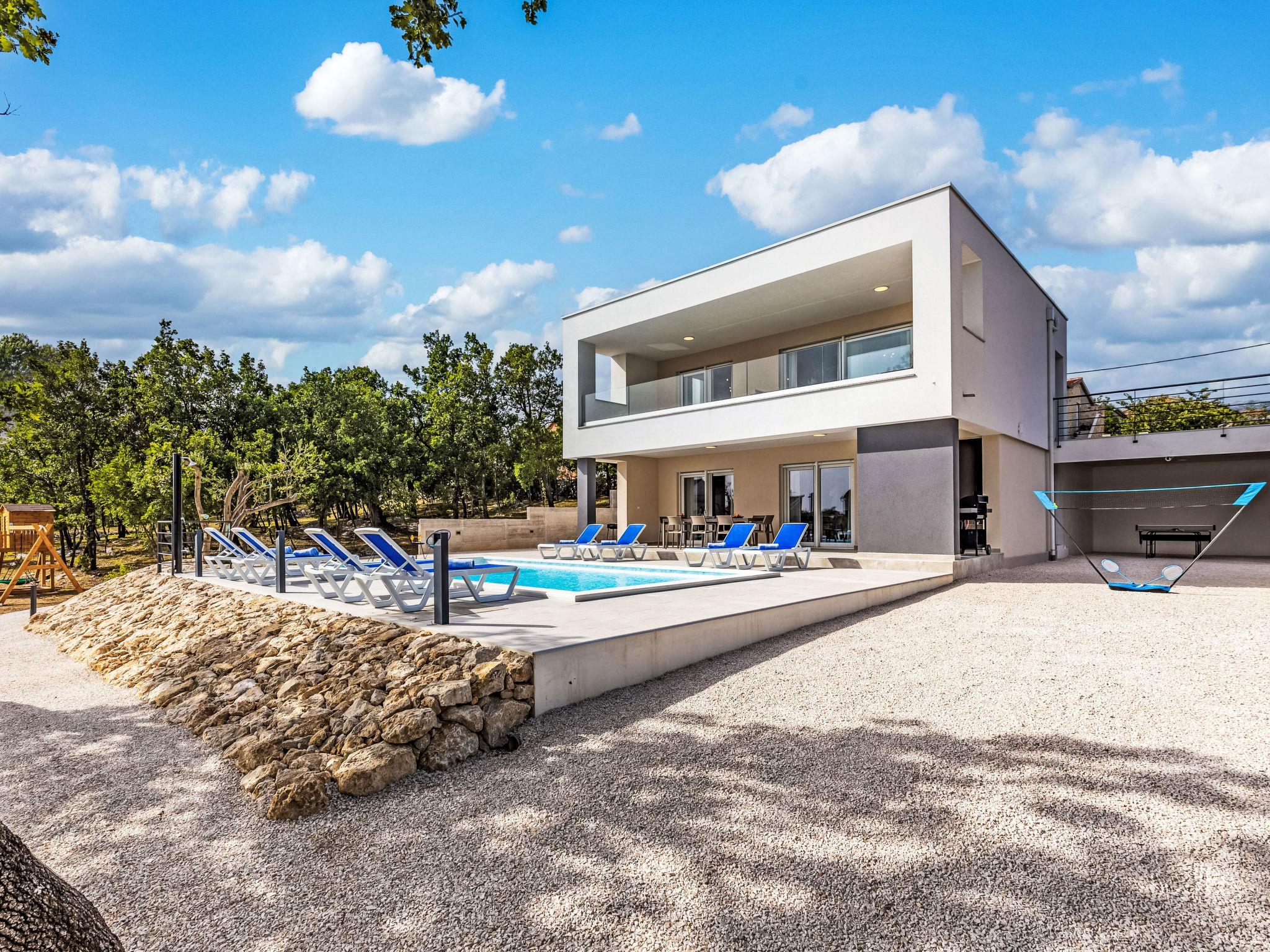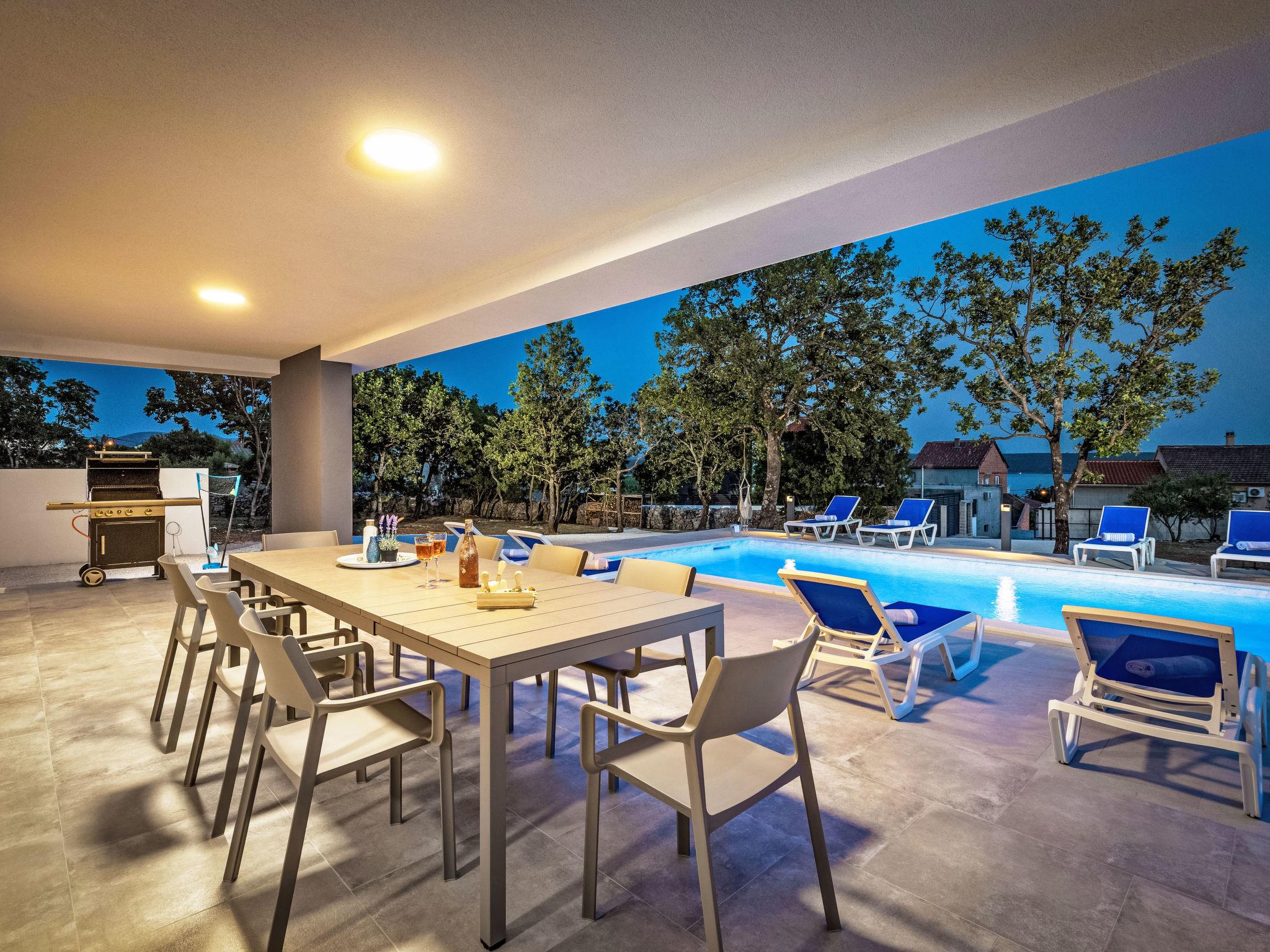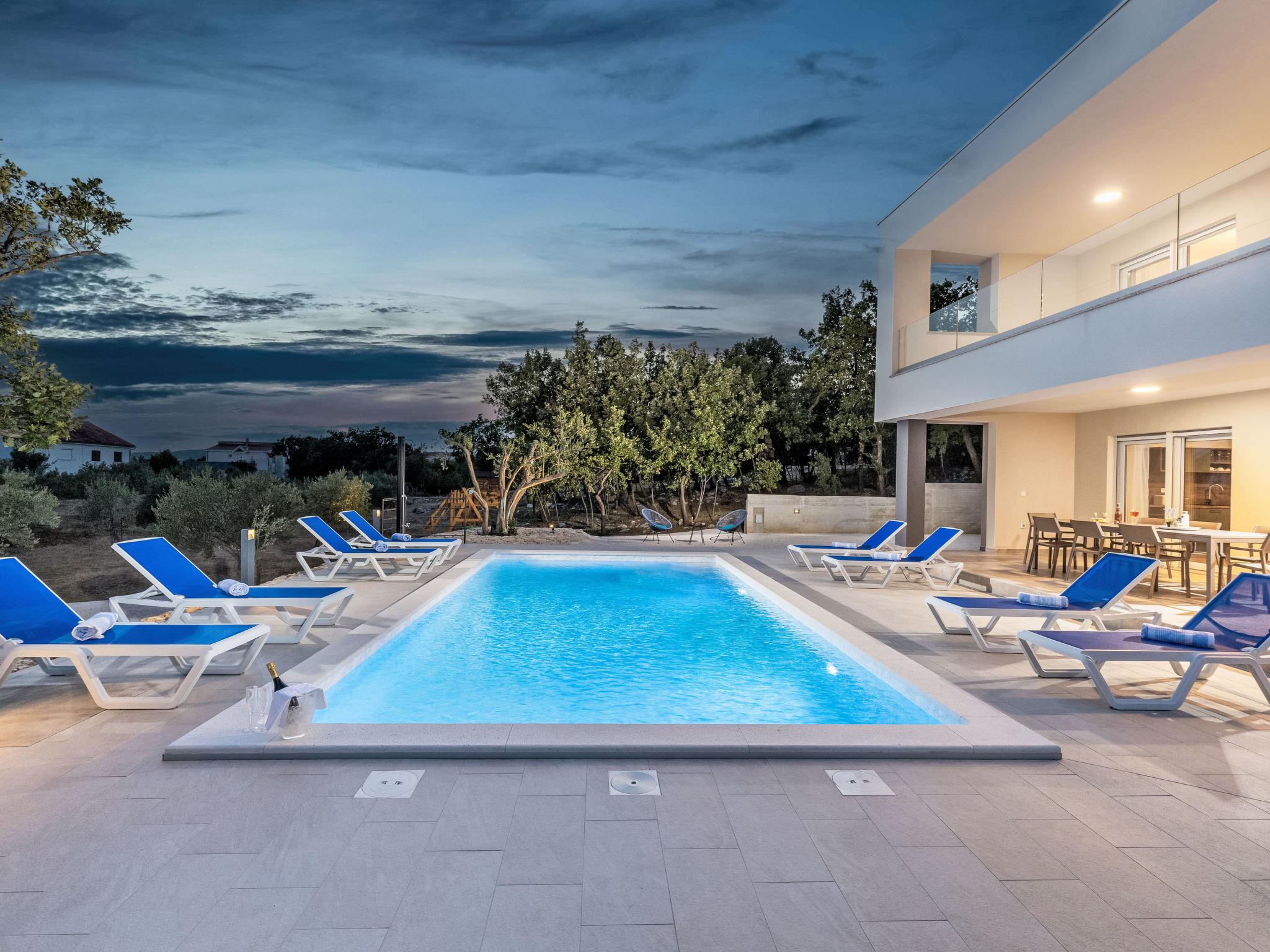 Modern villa "Green & Blue", 2 storeys, built in 2022. 28 km from the centre of Zadar, in a sunny, elevated position, 600 m from the sea, 600 m from the beach, located by a road. Private: property 9'000 m2 (fenced), swimming pool angular (8 x 4 m, depth 150 cm, seasonal availability: 15.May. - 15.Oct.). Outdoor shower, table tennis, garden furniture, barbecue, children's playground (slide, swing). In the house: internet access, billiard table, washing machine. Parking (for 3 cars) at the house on the premises. Shop 1 km, restaurant 1.5 km, bus stop 1.5 km, pebble beach, shingle beach 600 m. Nearby attractions: NP Paklenica 17 km, Rafting Zrmanja 35 km. The owner does not accept any youth groups.