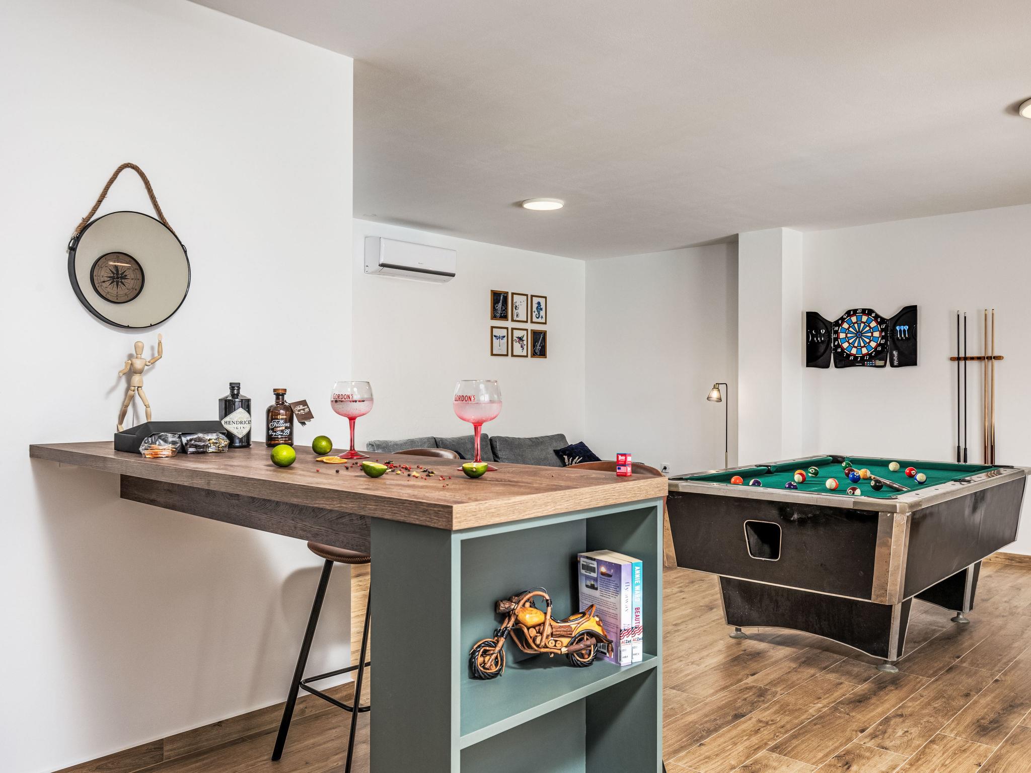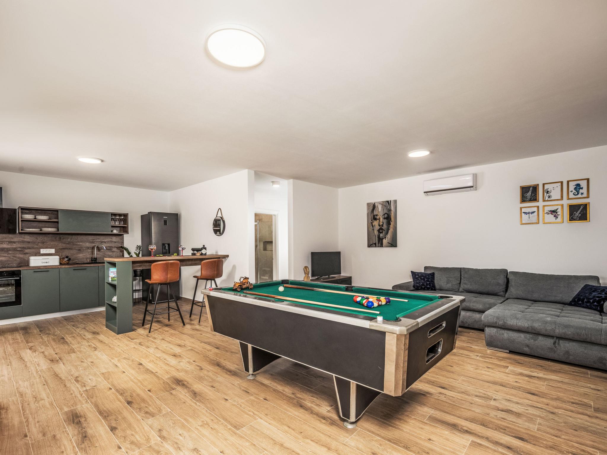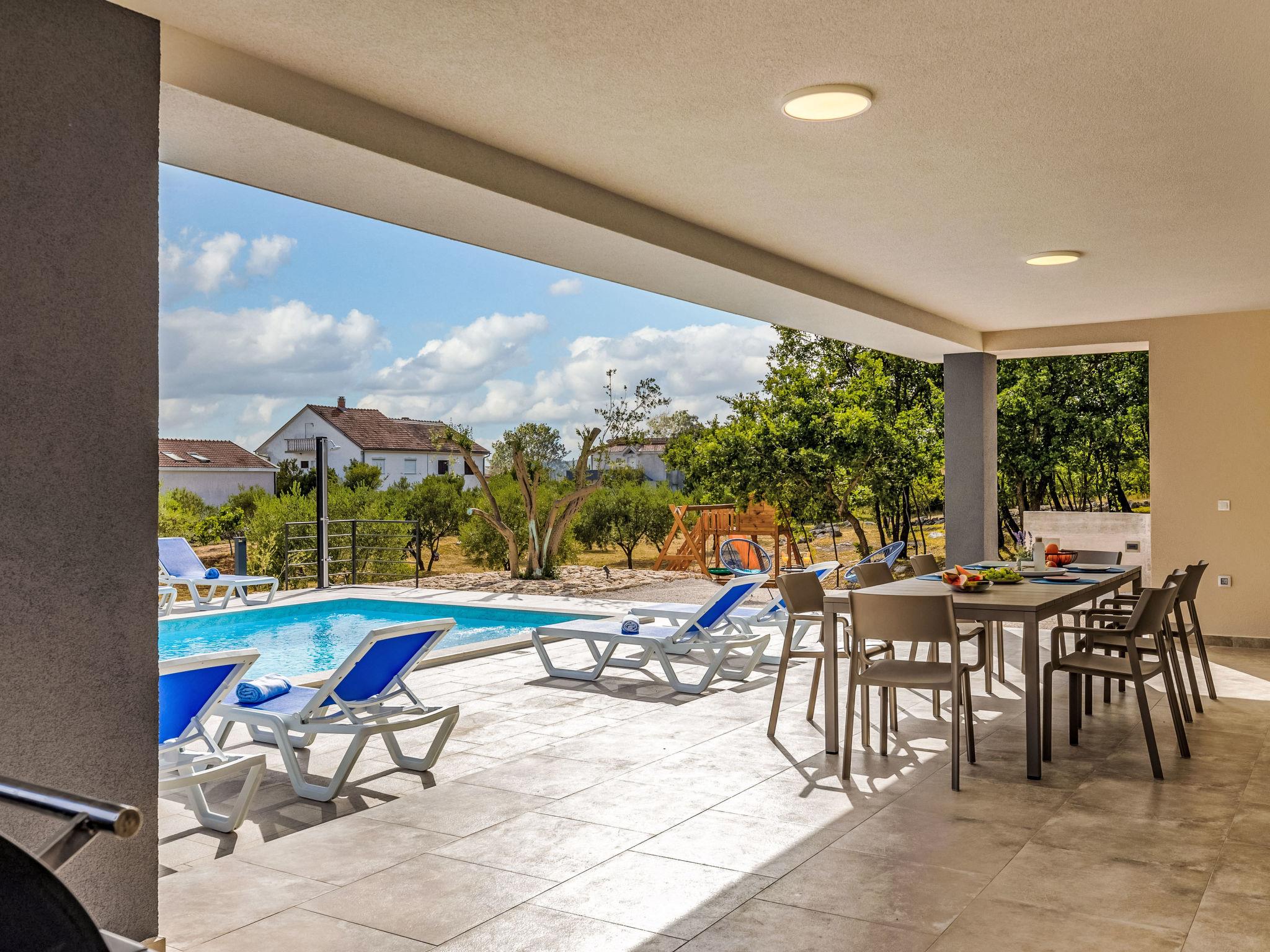 Modern villa "Green & Blue", 2 storeys, built in 2022. 28 km from the centre of Zadar, in a sunny, elevated position, 600 m from the sea, 600 m from the beach, located by a road. Private: property 9'000 m2 (fenced), swimming pool angular (8 x 4 m, depth 150 cm, seasonal availability: 15.May. - 15.Oct.). Outdoor shower, table tennis, garden furniture, barbecue, children's playground (slide, swing). In the house: internet access, billiard table, washing machine. Parking (for 3 cars) at the house on the premises. Shop 1 km, restaurant 1.5 km, bus stop 1.5 km, pebble beach, shingle beach 600 m. Nearby attractions: NP Paklenica 17 km, Rafting Zrmanja 35 km. The owner does not accept any youth groups.