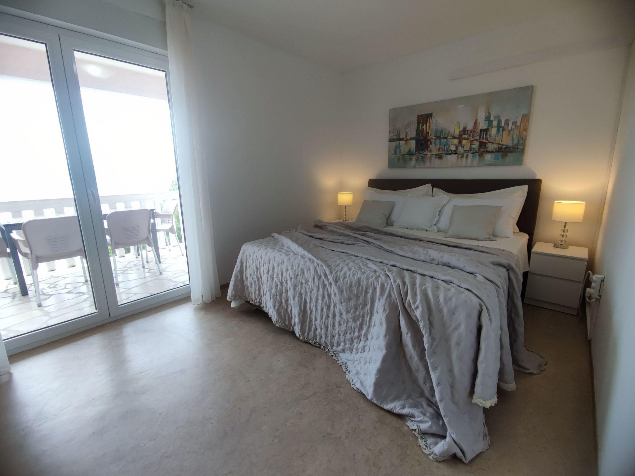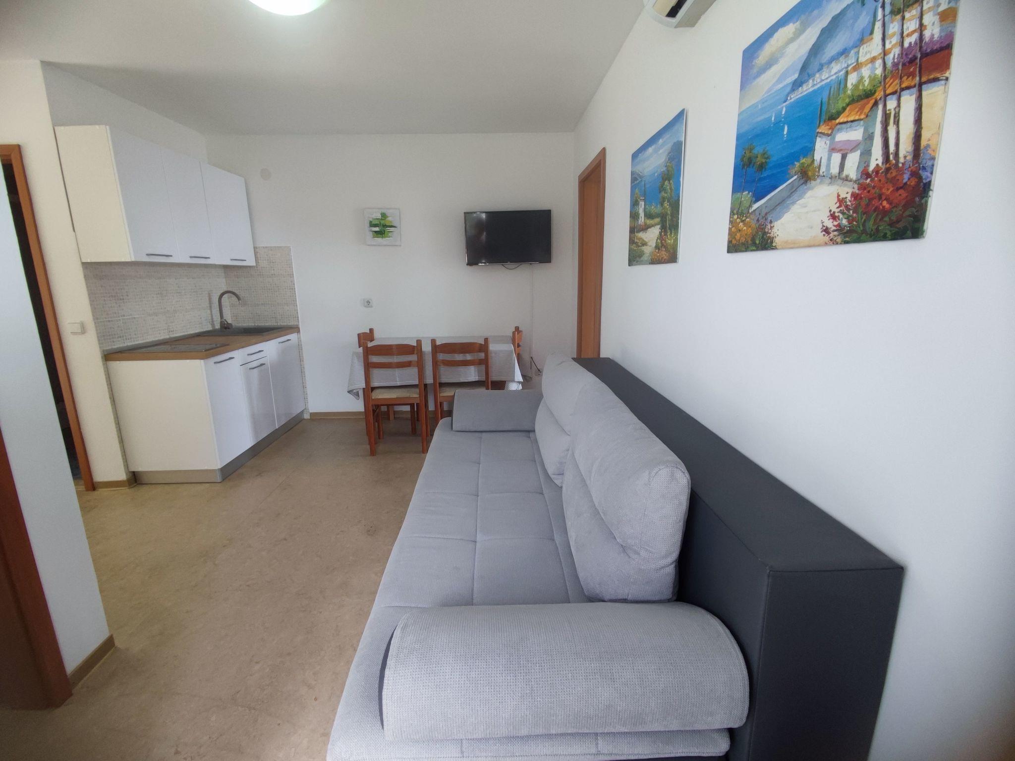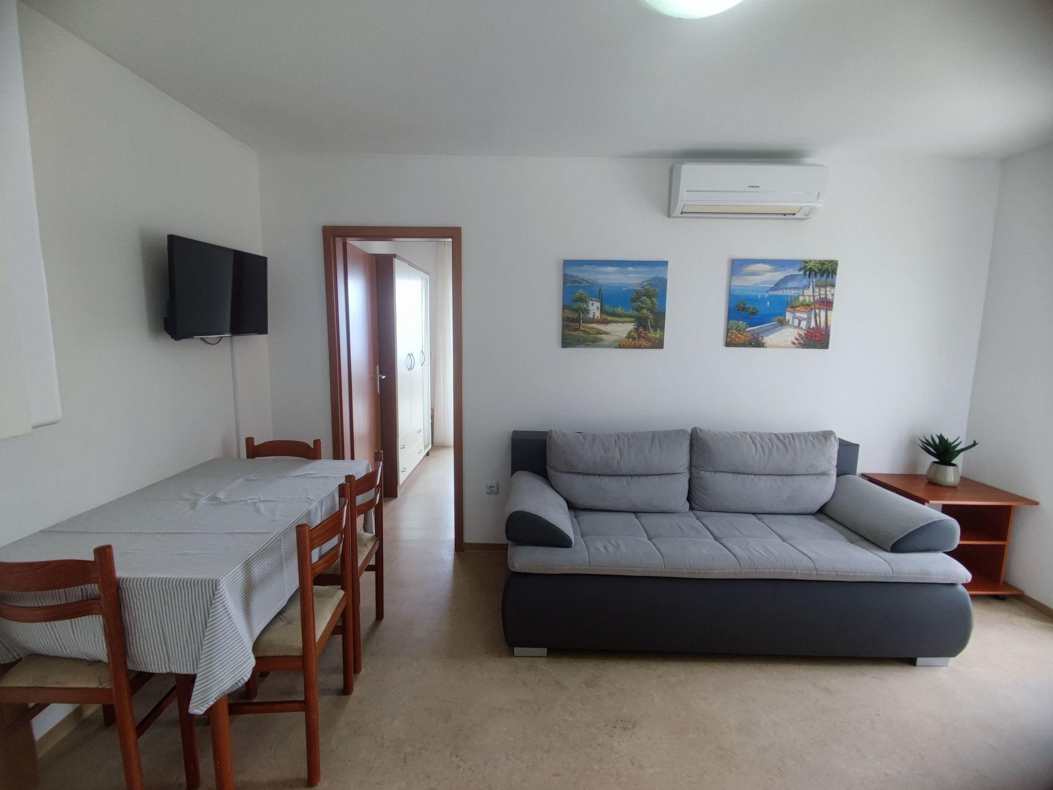 Apartment D-2B is 45 m² in size and comprises of the following rooms: A living/dining room with sofa (double bed), flatscreen TV and dining table. There are two bedrooms in apartment. Master bedroom has king size double bed (160 cm wide) and second bedroom includes two separate single beds (90 cm wide). Apartment has its own kitchen with utensils, electric stove, microwave, coffee machine and dining area, as well as adjoining bathroom with a shower cabin and hair dryer. Apartment has air conditioner in living room and free wi-fi. Spacious terrace overlooking the pool area and the sea has table and set of chairs, plus an access to a shared outdoor swimming pool and sundeck. Parking is secured outside of facility.