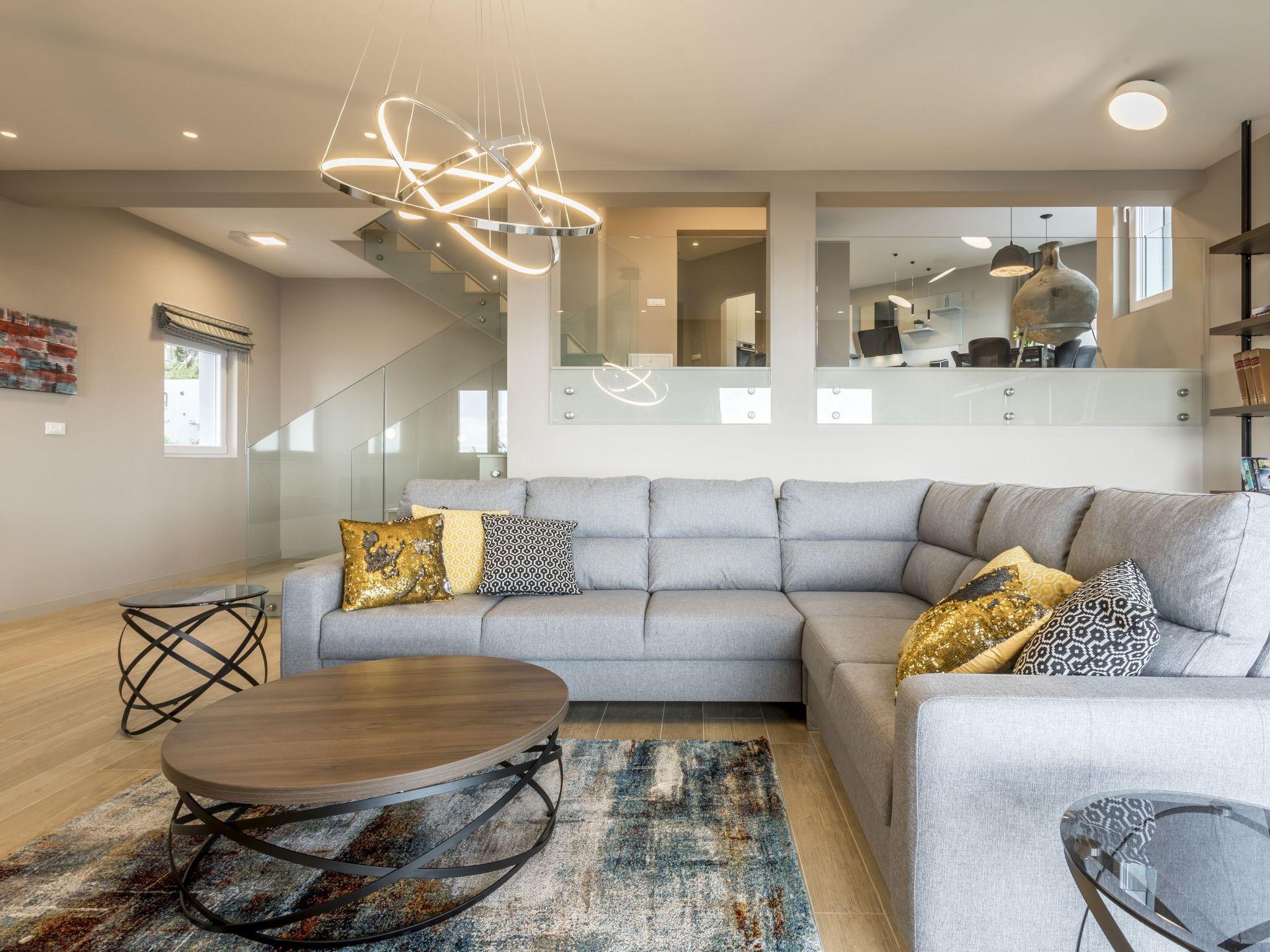*Interior is very well organized and well-designed giving a deeper dimension with half floors and glass fences. The ground floor offers a fully equipped kitchen with a wine cooler, ice maker, coffee machine Dolce Gusto and more, a dining table with sea and pool views, direct exit to the outdoor dining area. There is also a toilet and a laundry with all amenities. From this level few steps down takes you to the living room full of light and sun.